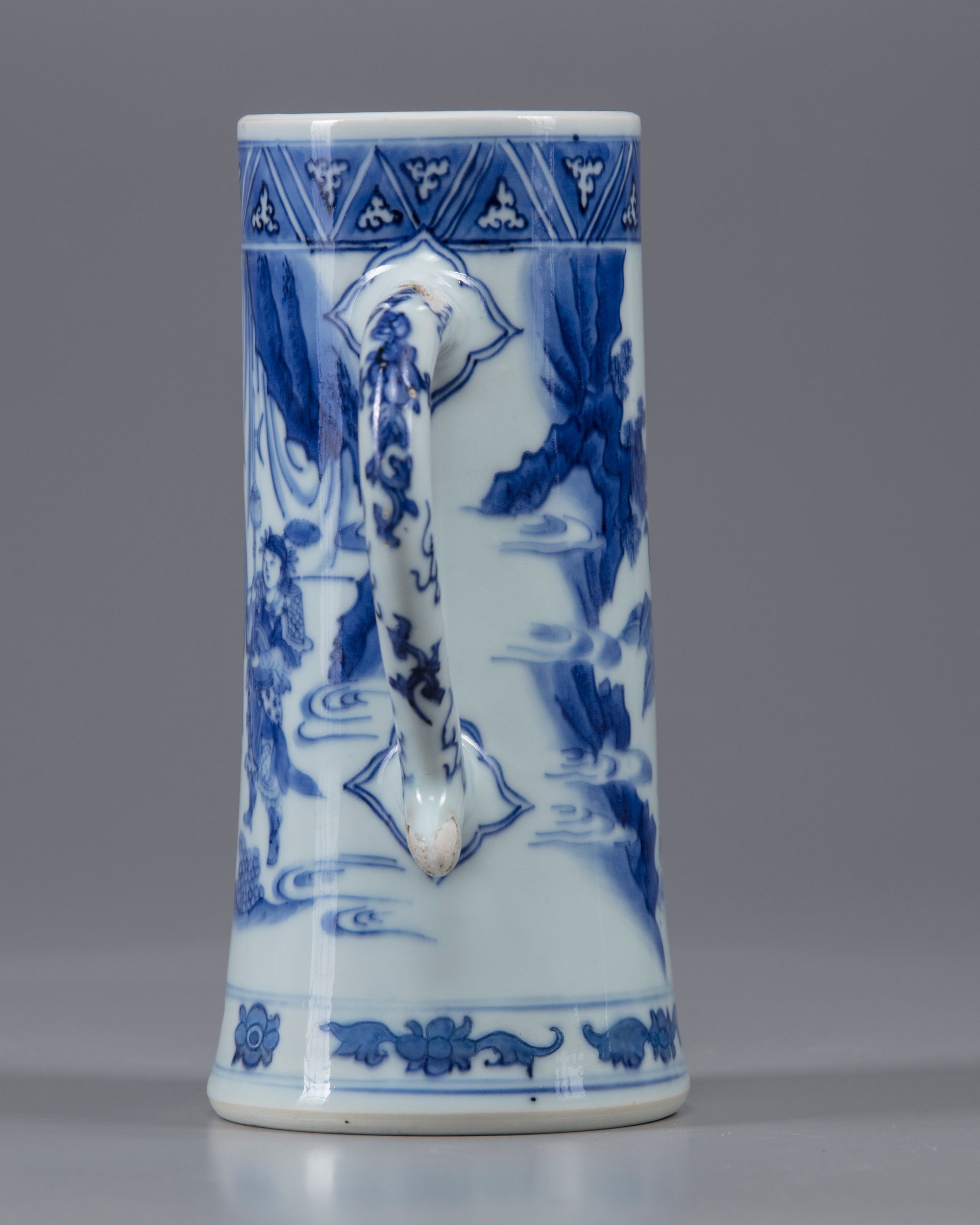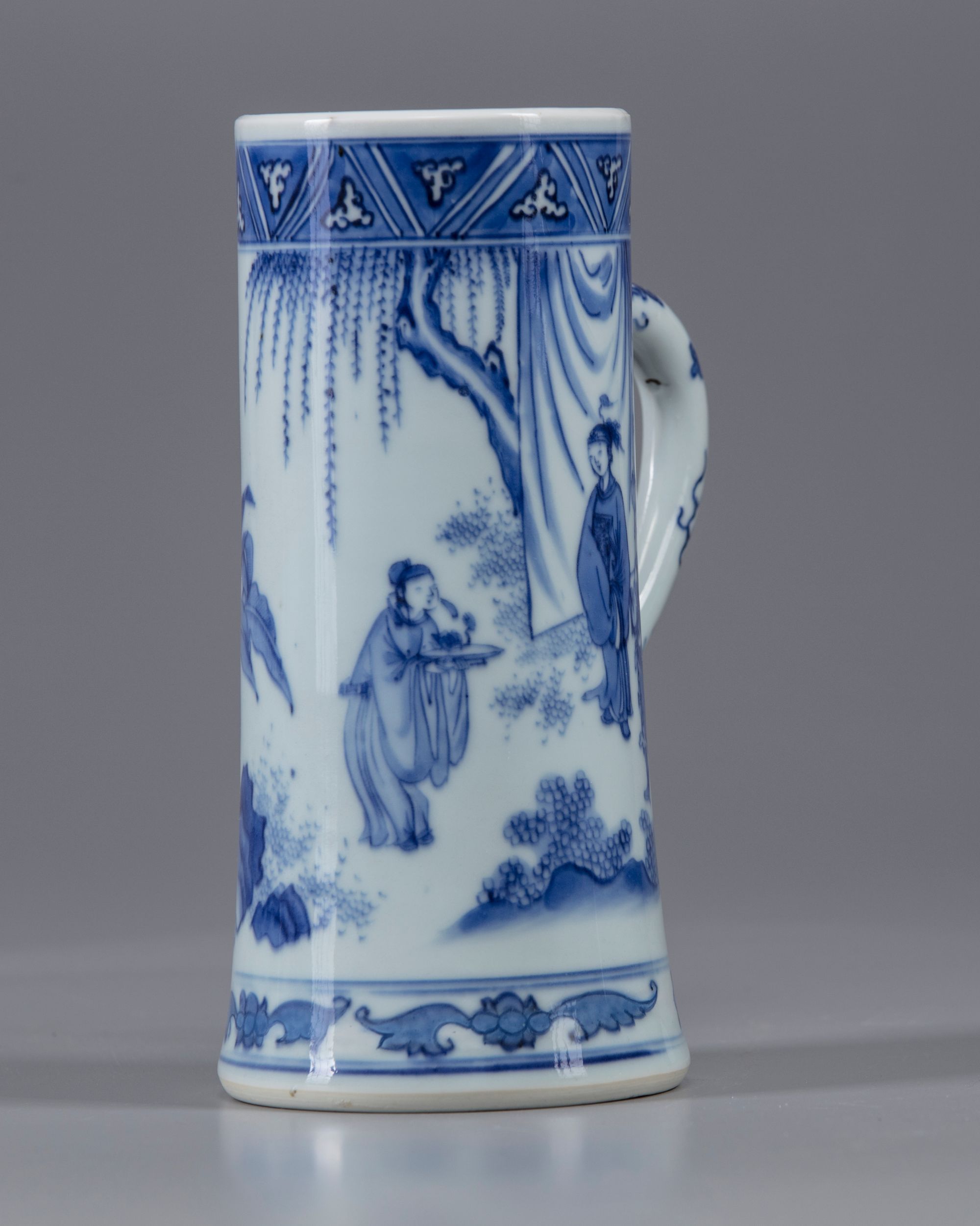 Decorated with a scene of an attendant approaching a scholar and a soldier by a tent between a band of triangle-shaped panels to the rim and flower sprays to the foot. The hooked c-shaped handle is decorated with flower scrolls.