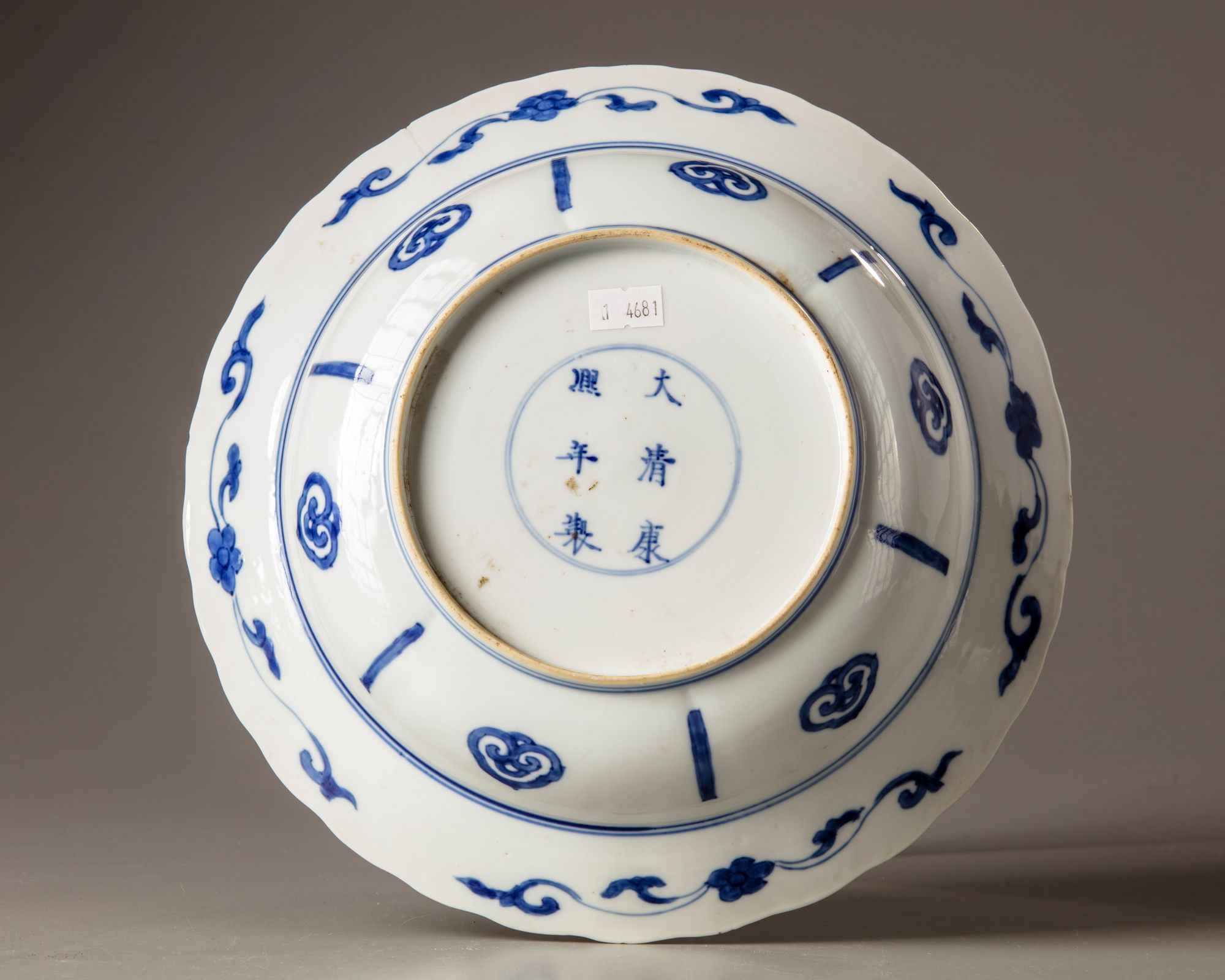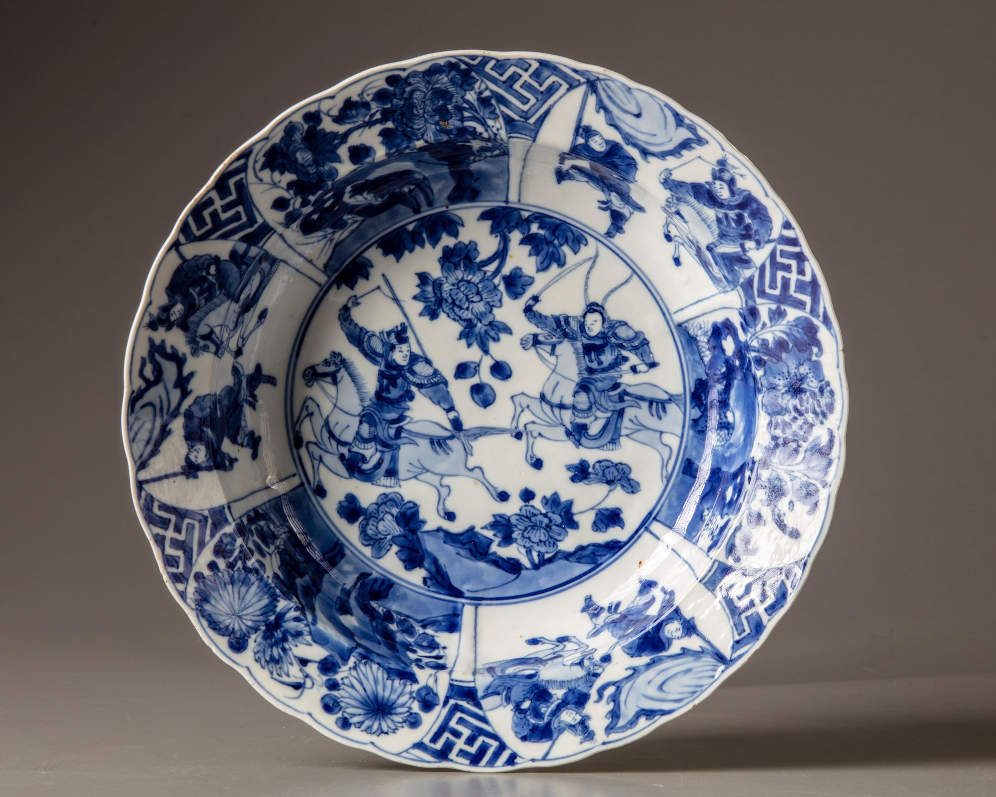 Kangxi six-character mark in underglaze blue within a double circle and of the period (1662-1722) Decorated to the centre with a roundel enclosing two warriors amongst flowers, surrounded by flower-shaped panels enclosing alternating warriors sand flowers growing from rocks, all reserved on a wan-pattern ground. The reverse decorated with flower scrolls and ruyi heads.