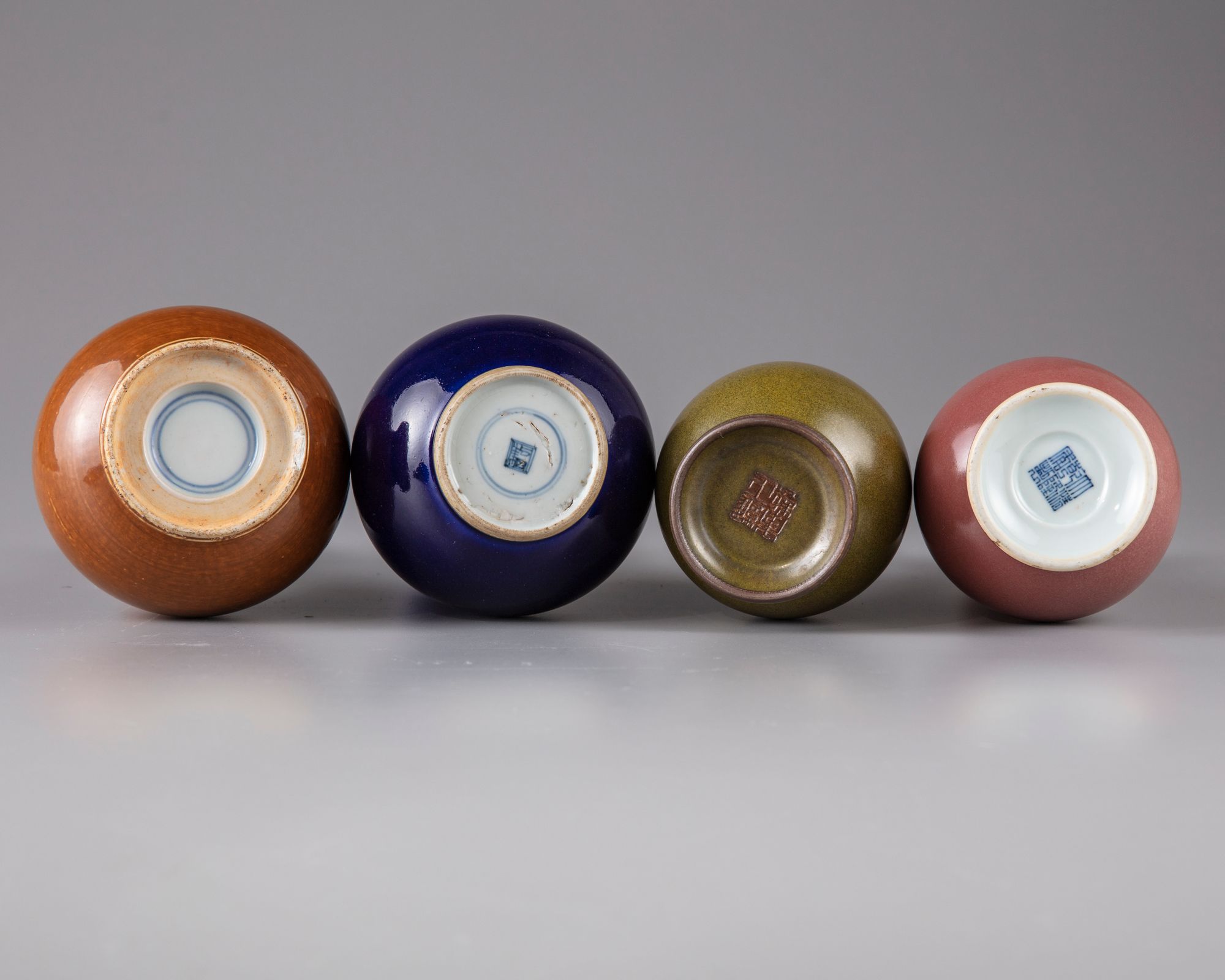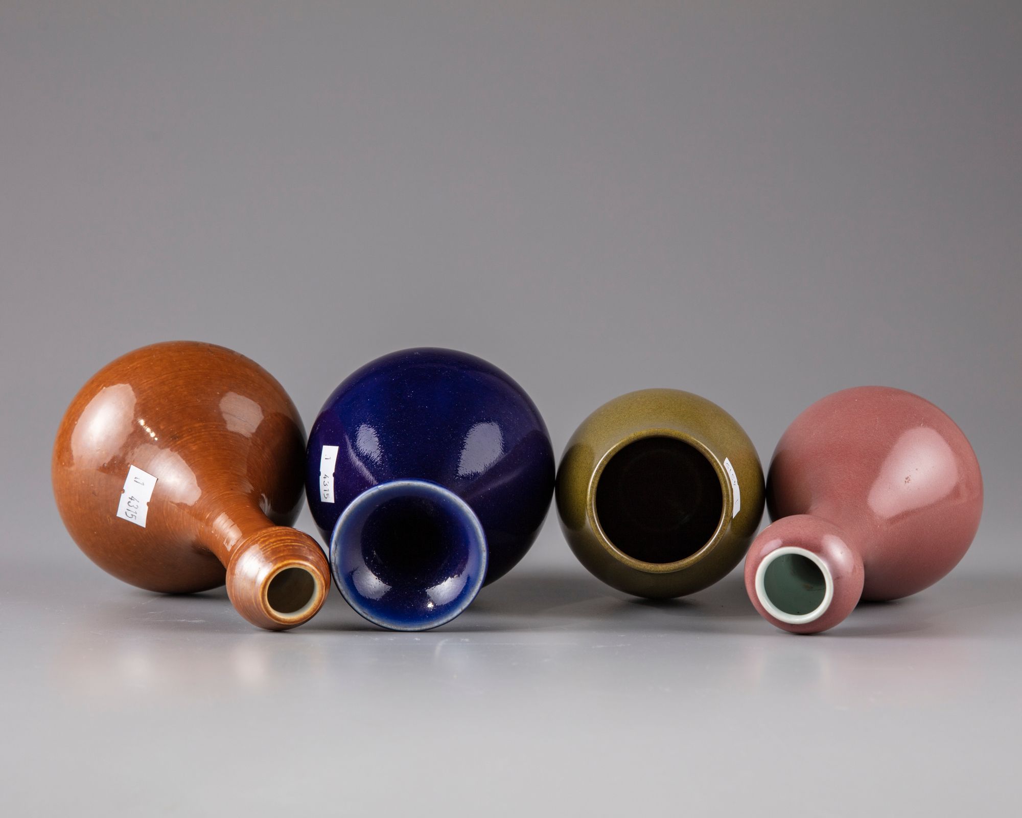 The group consists of _A garlic head vase , covered with a brown glaze. 21 cm. _A red glazed garlic head vase with a Qianlong seal mark. 18 cm _A dark blue yuhuchunping vase with a seal mark. 17 cm. _A dark olive green vase with a Yongzheng seal mark. 13 cm.