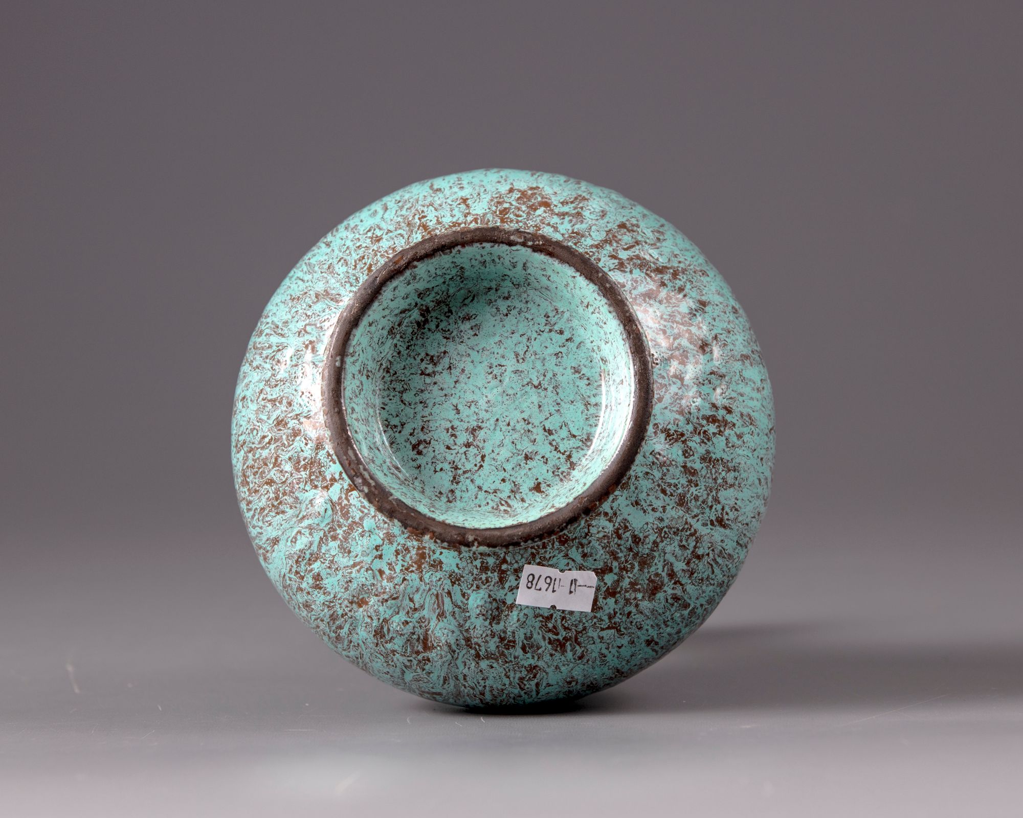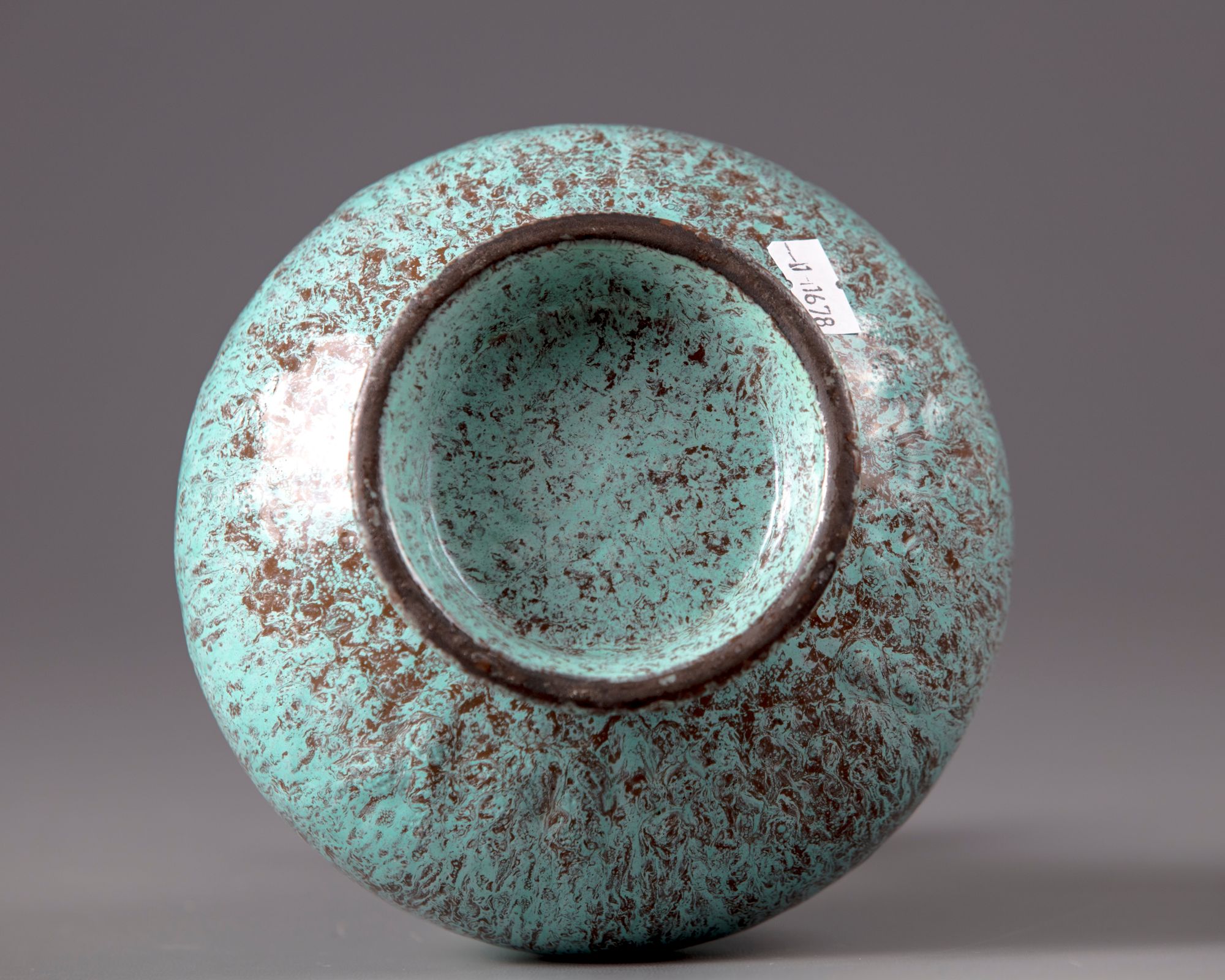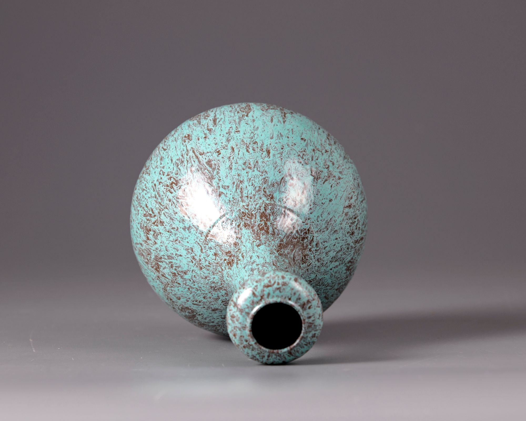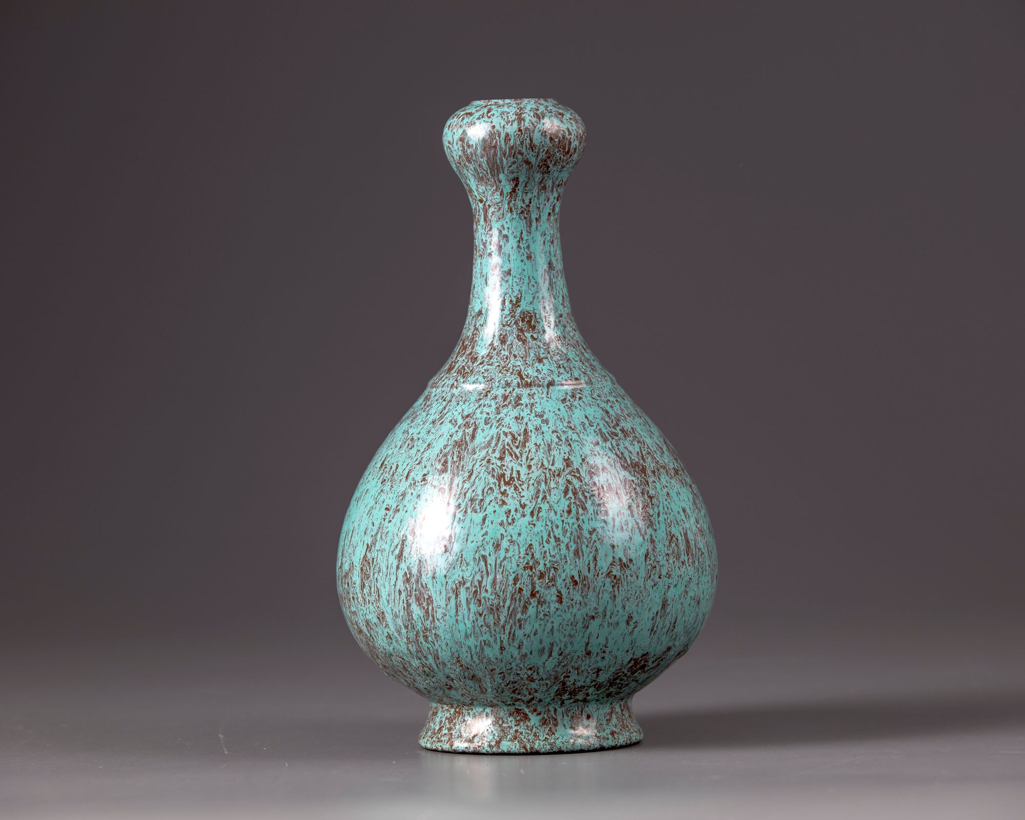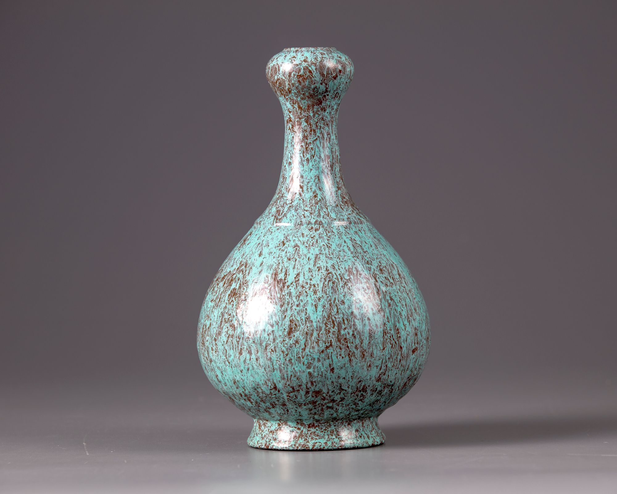 The vase is modelled with a stepped shoulder, slender neck leading to a globular section by the rim. The vase is covered overall with a purplish-maroon and turquoise mottled glaze save for the footring which bears a brown slip. The base with an apocryphal Yongzheng seal mark.
