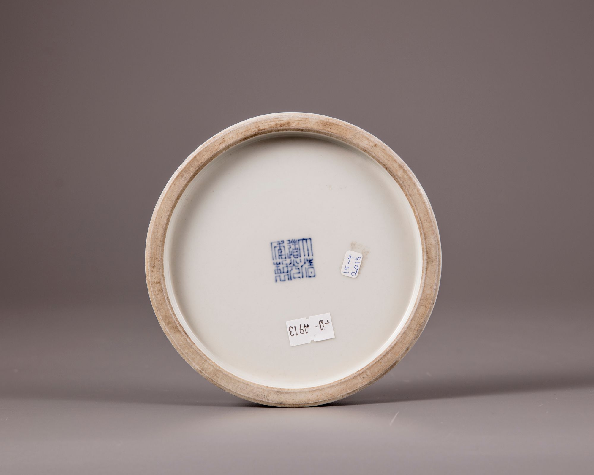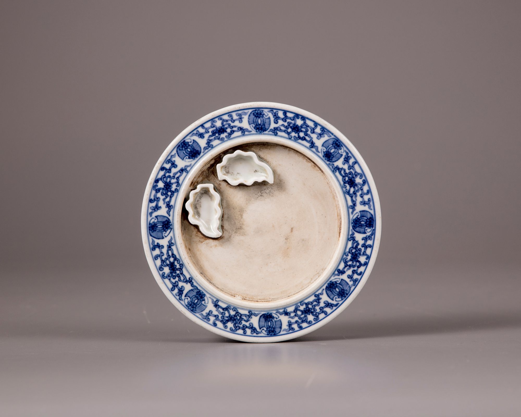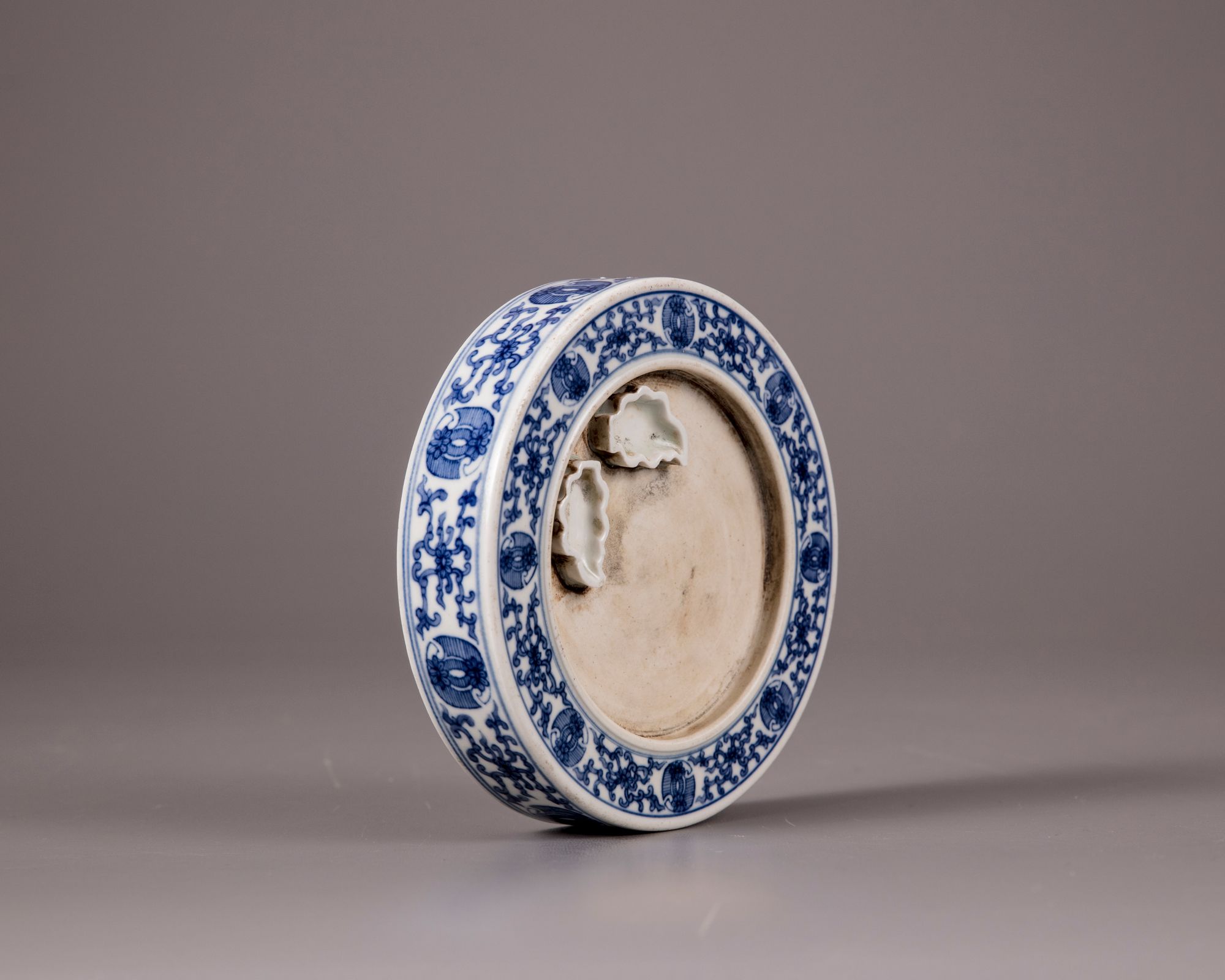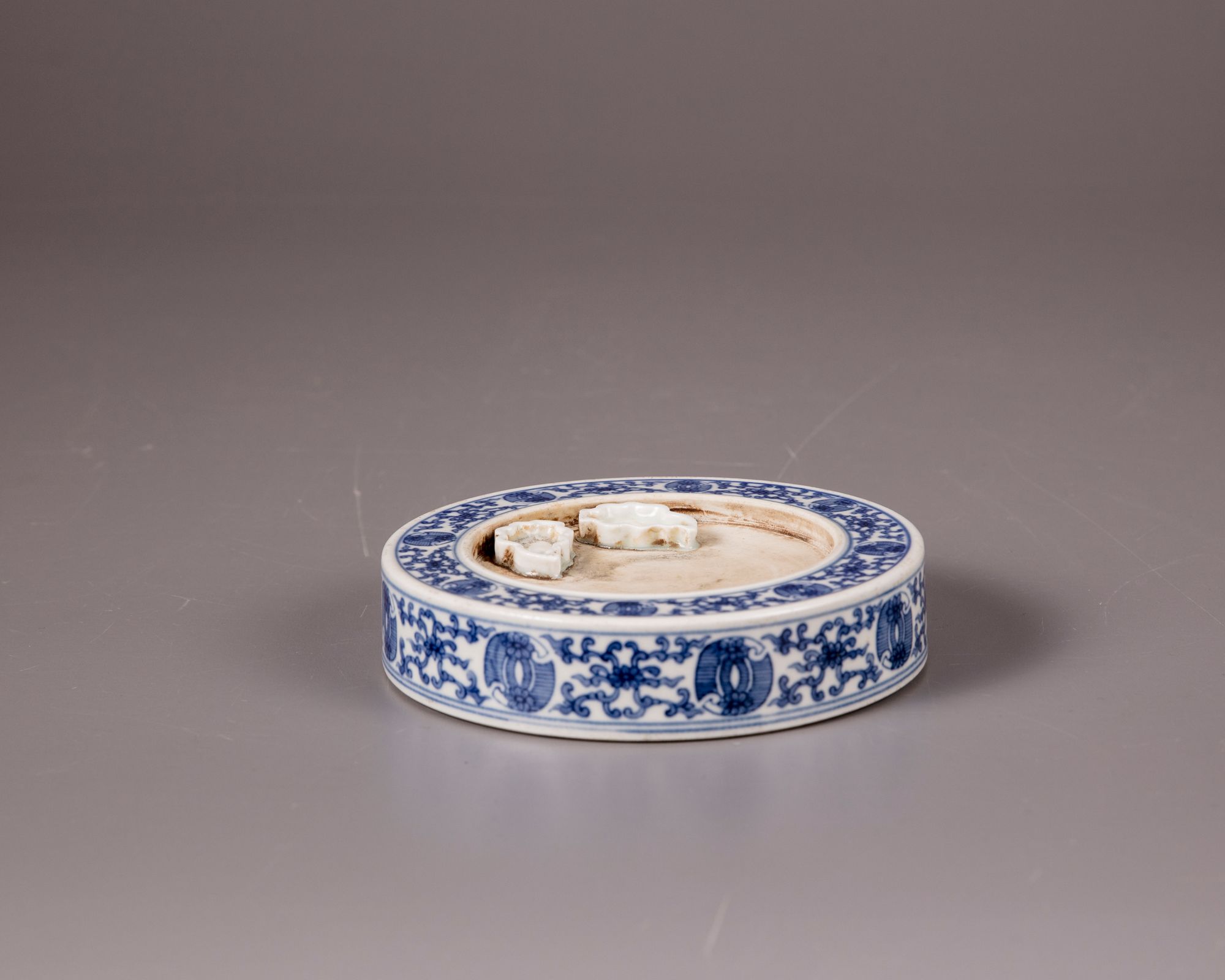 The round inkstone is decorated to the centre with two applique leaf-shaped containers. The walls of the vessel are decorated with oval roundels surrounding flower heads, separated by further scrolling flowers. The base with an apocryphal Daoguang mark.