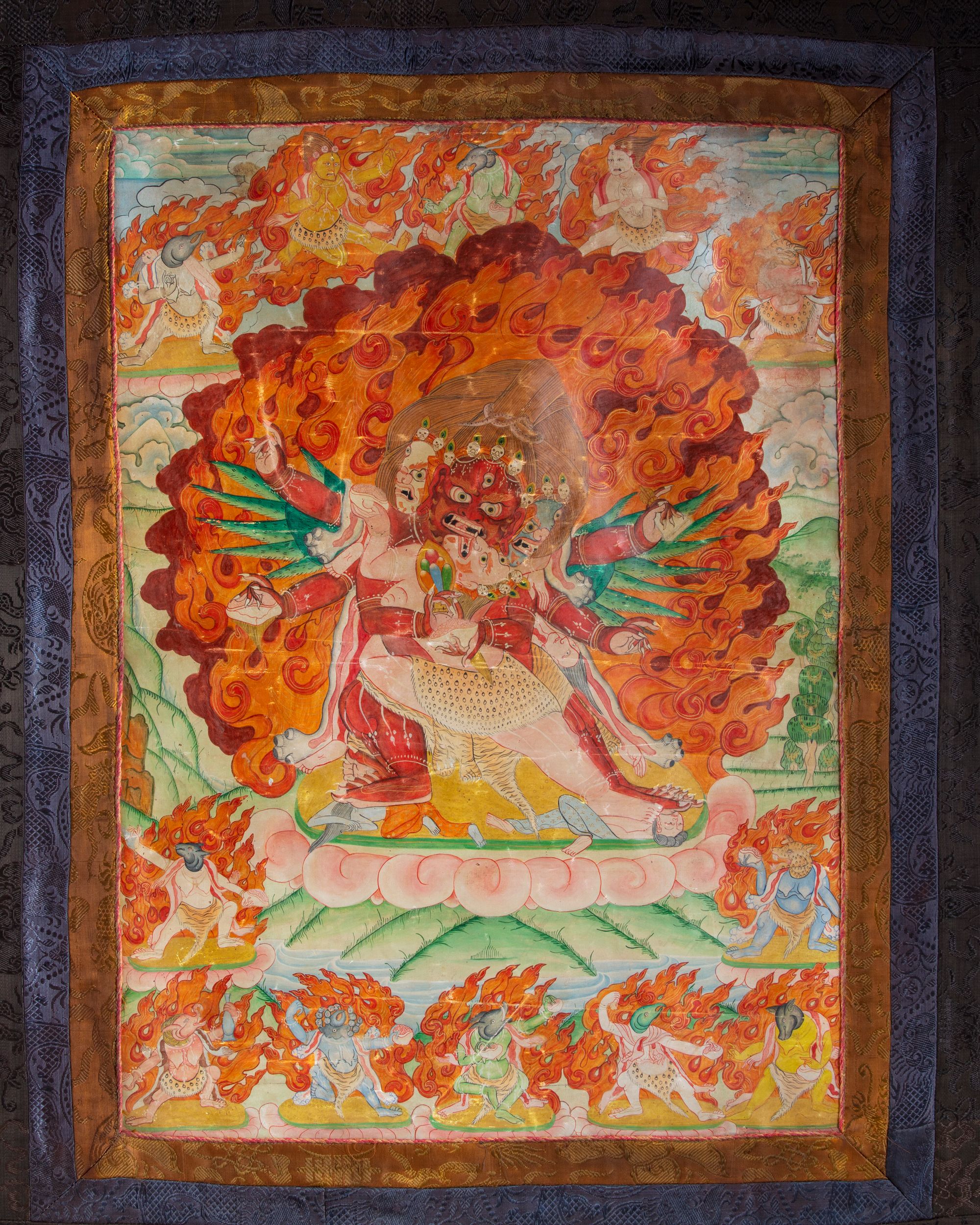 the wrathful deity Chakrasamvara with six arms standing in alidhasana with consort Vajravarahi, the three-faced deity striding in alidhasana on a lotus base at center, holding a vajra and a vase in his primary hands, clad in a tiger skin and adorned with beaded festoons and a garland of severed heads, the three wrathful faces with flaming beard and brows, bared fangs, surrounded by different flaming deities. The painting: 63 by 46 cm. The textile: 117 by 72 cm.