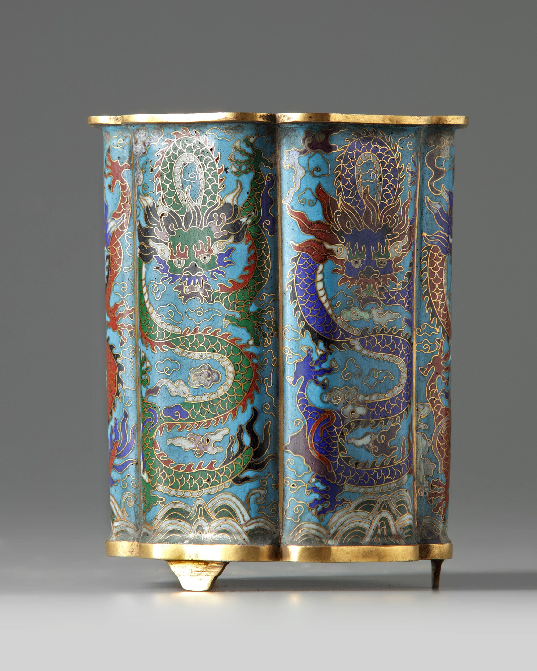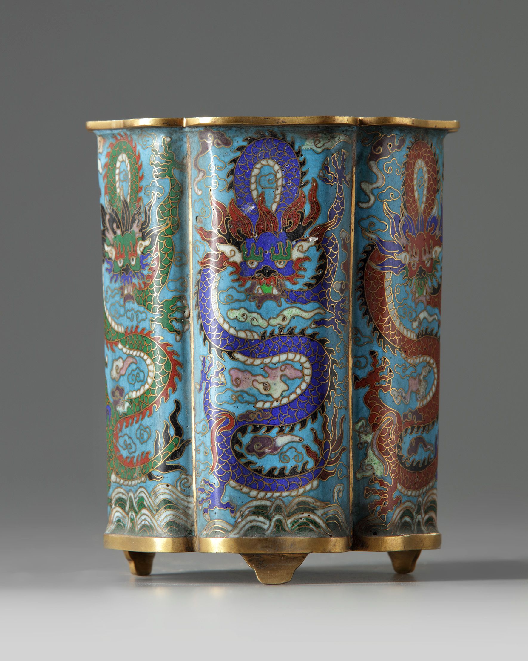 A Chinese cloisonné enamel 'dragon' foliate brush pot, bitong