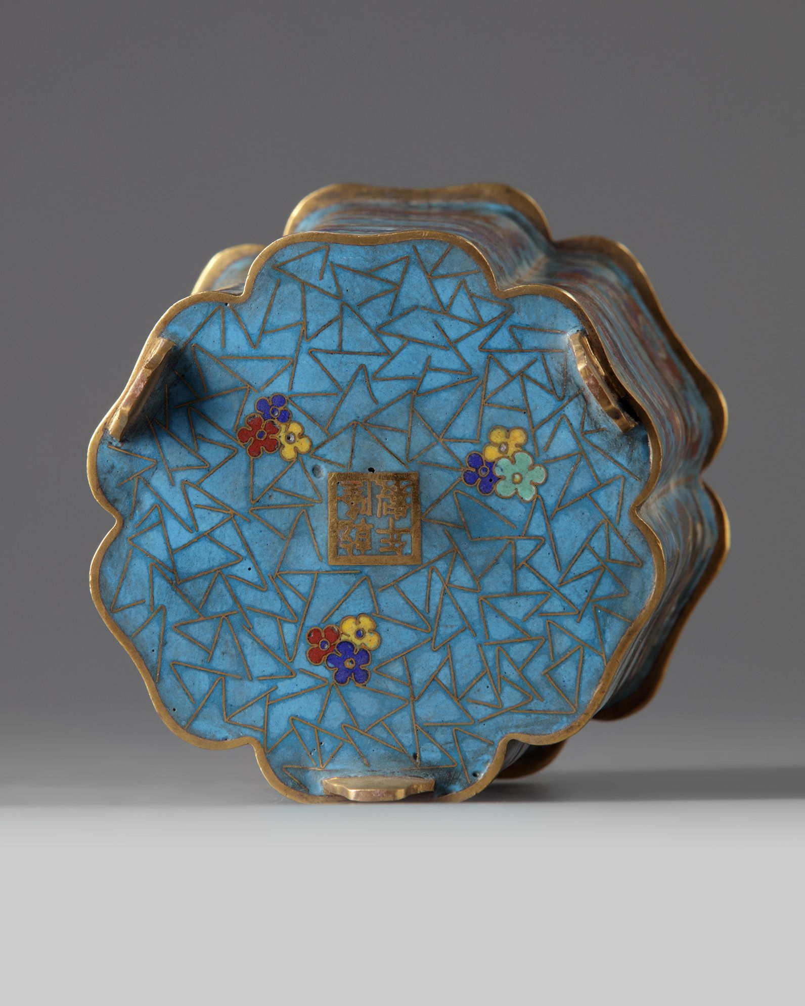 Each lobe is decorated with a front-facing dragon amongst cloud scrolls above waves. The base with an apocryphal Qianlong mark on a prunus and cracked ice ground.