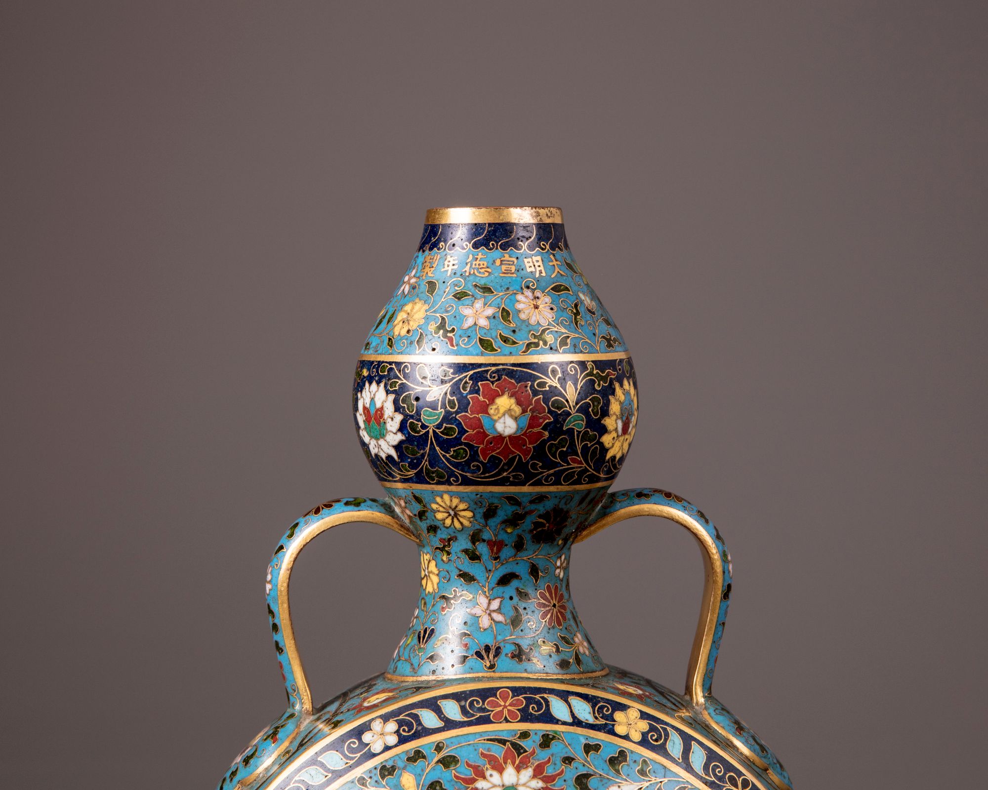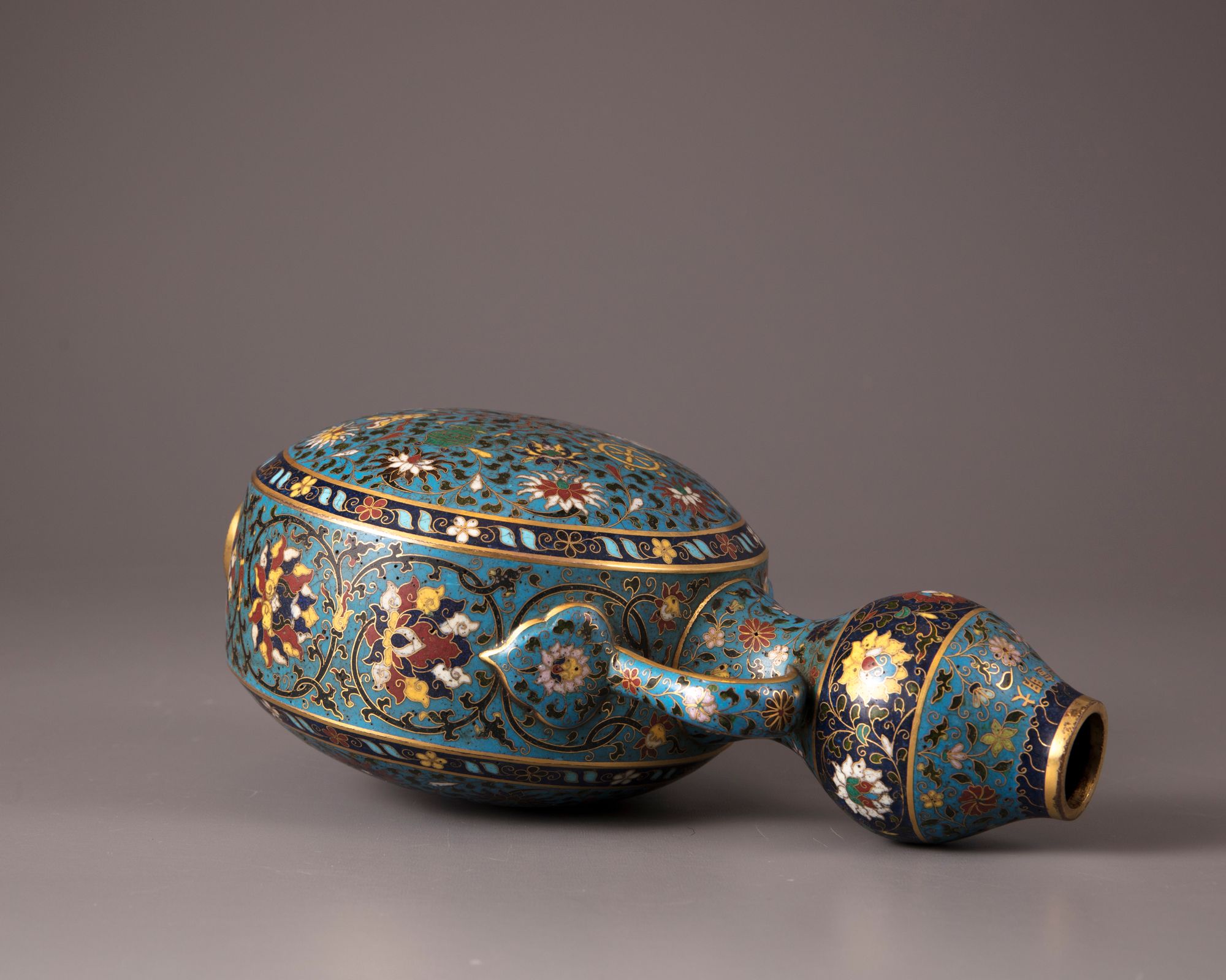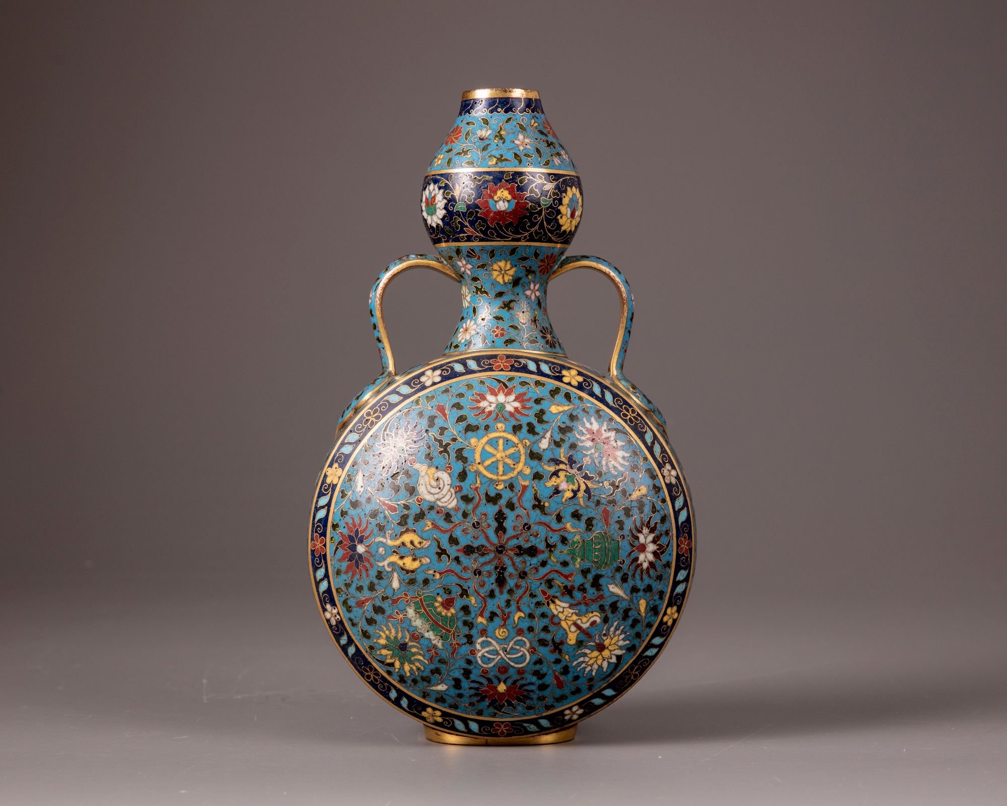 The moonflask is decorated with two ruyi-shaped strap handles to the neck and shoulders, each large circular side is decorated with the Eight Buddhist Emblems, bajixiang, surrounded by a lotus scroll, encircled by a further floral band. The neck, bulbous upper section, and narrow sides are decorated with further scrolling lotus. An apocryphal Xuande mark just below the rim.