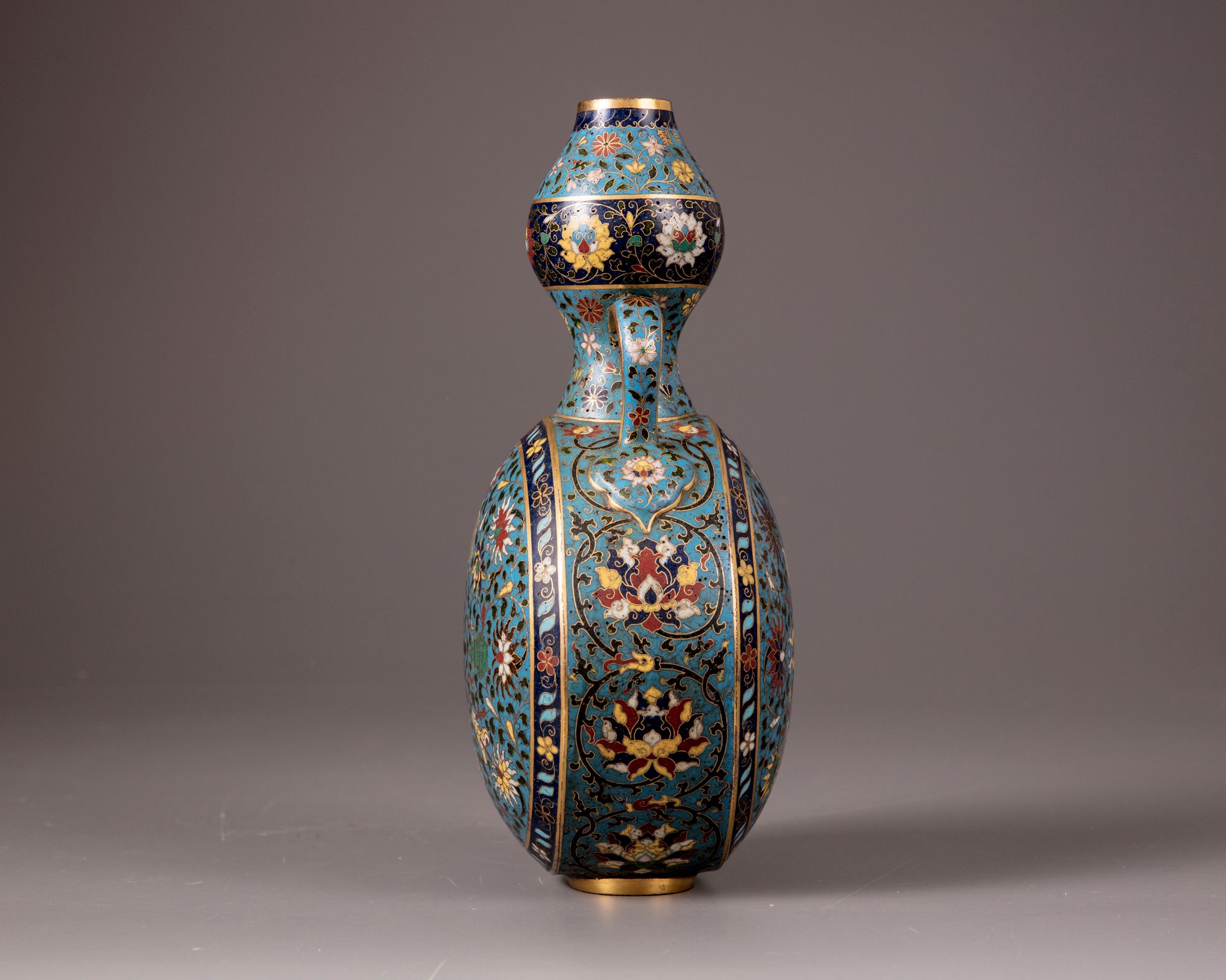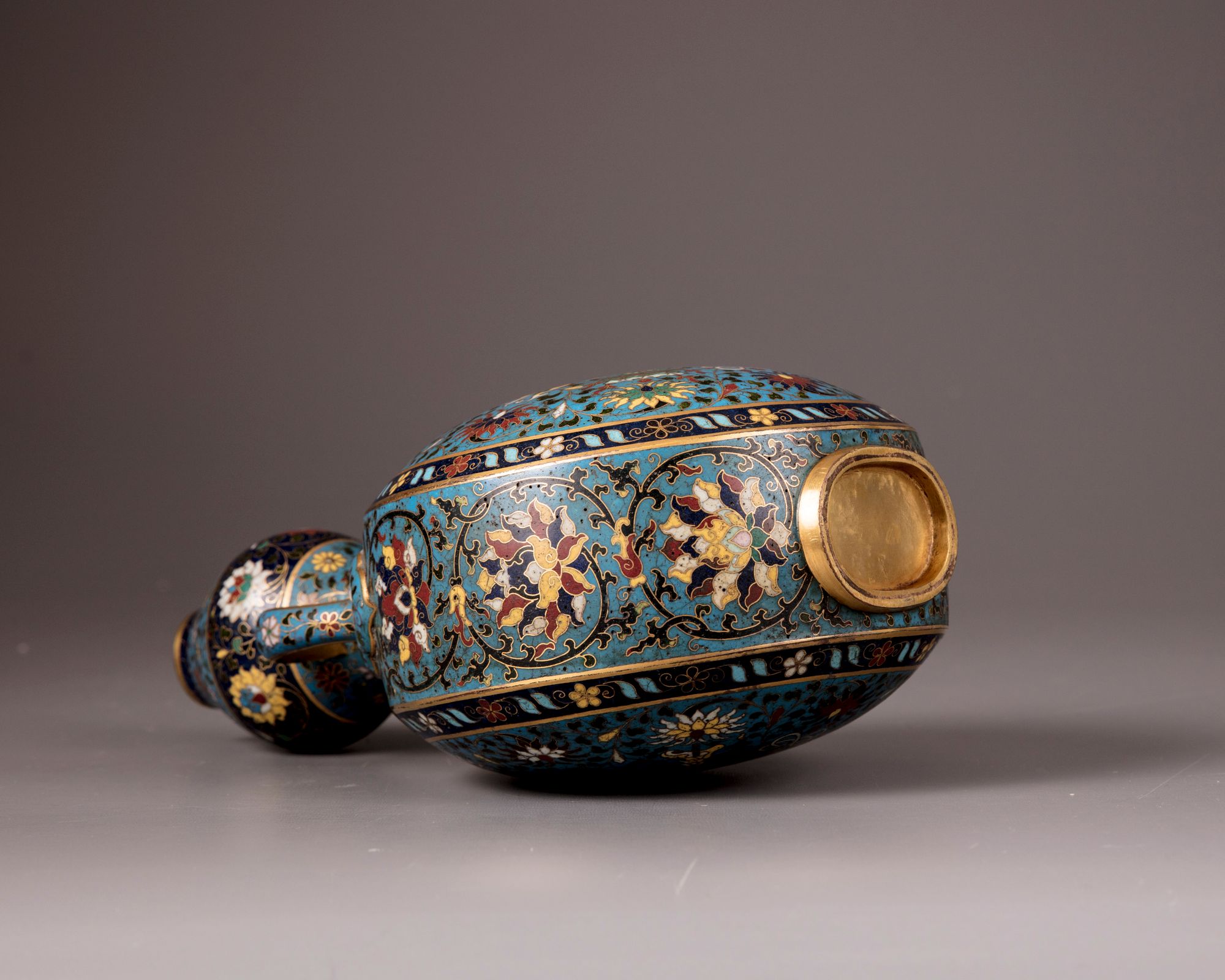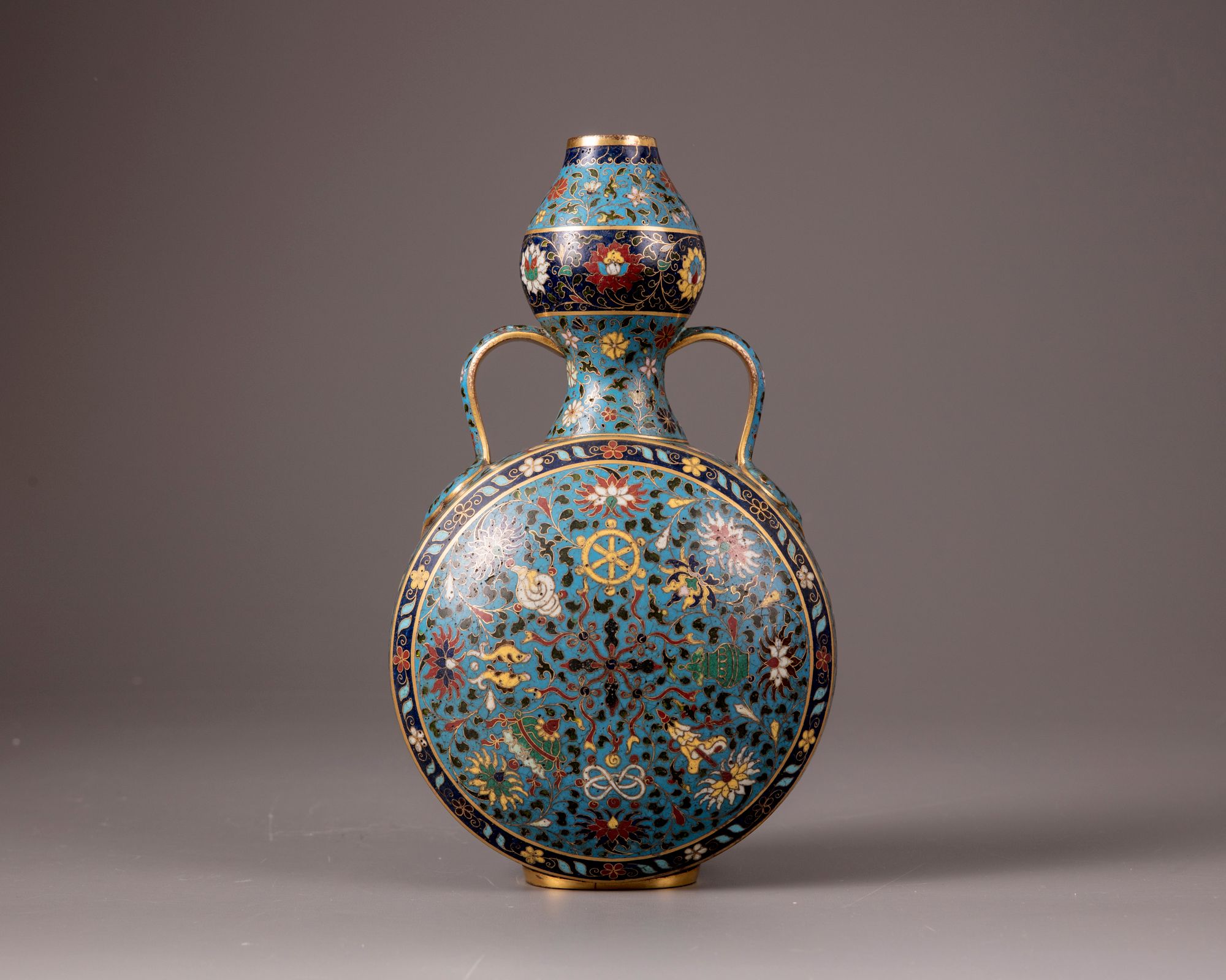 The moonflask is decorated with two ruyi-shaped strap handles to the neck and shoulders, each large circular side is decorated with the Eight Buddhist Emblems, bajixiang, surrounded by a lotus scroll, encircled by a further floral band. The neck, bulbous upper section, and narrow sides are decorated with further scrolling lotus. An apocryphal Xuande mark just below the rim.