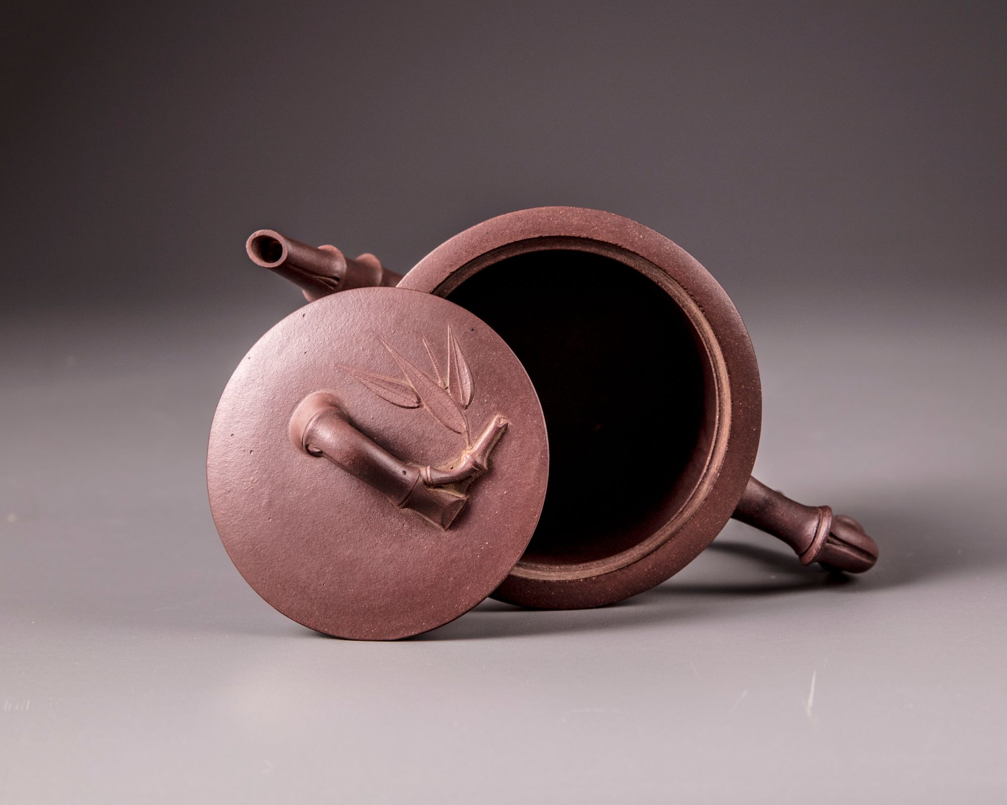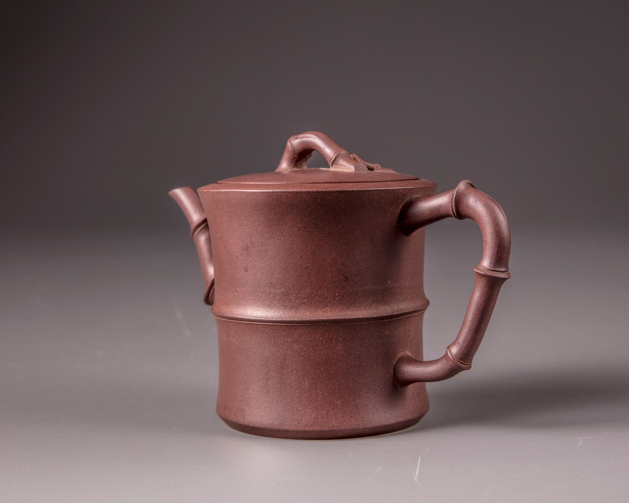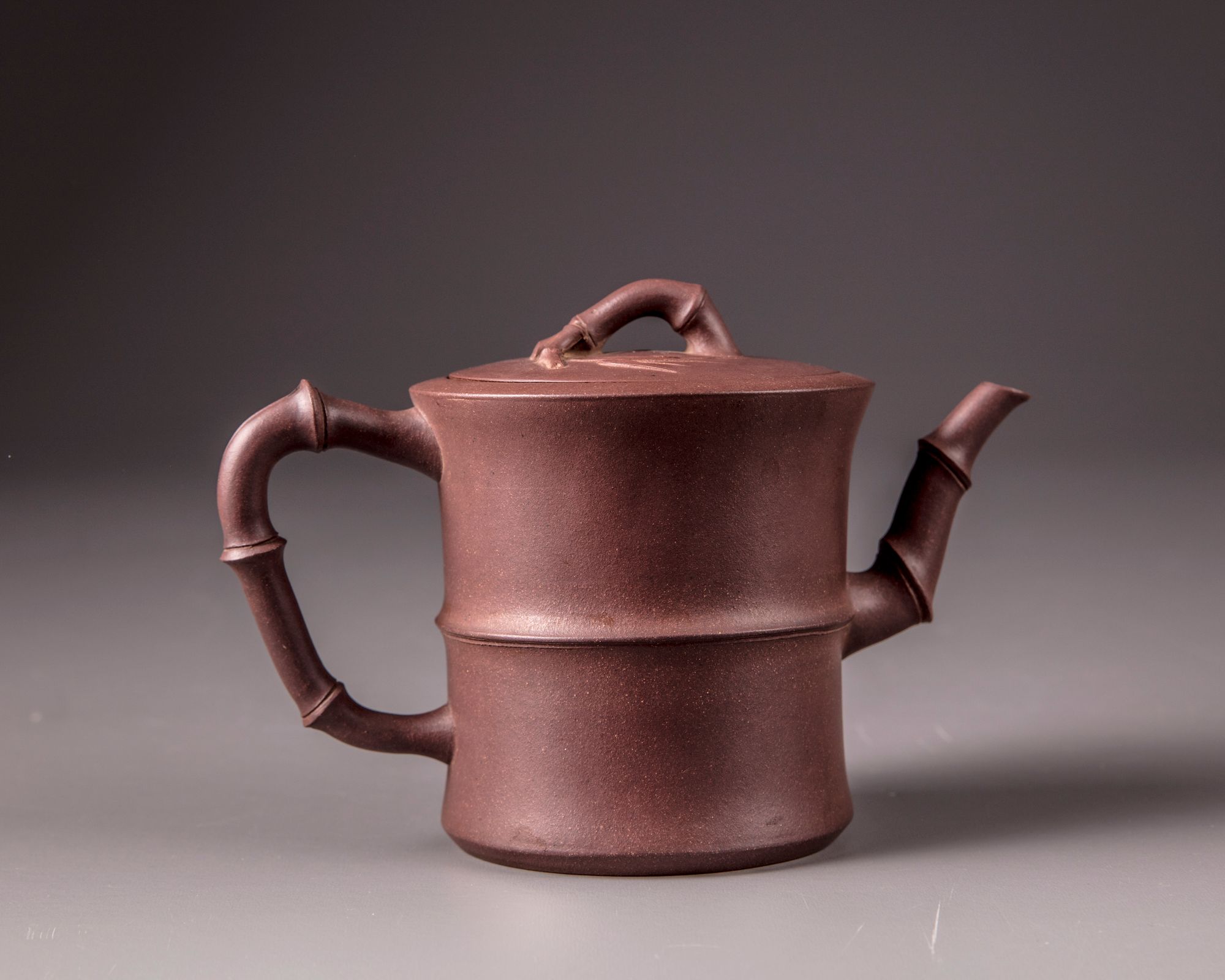 The body of the teapot is crafted as two bamboo sections, the spout and the handle are modelled imitating further sections of bamboo. The cover is decorated with a leafy bamboo finial.