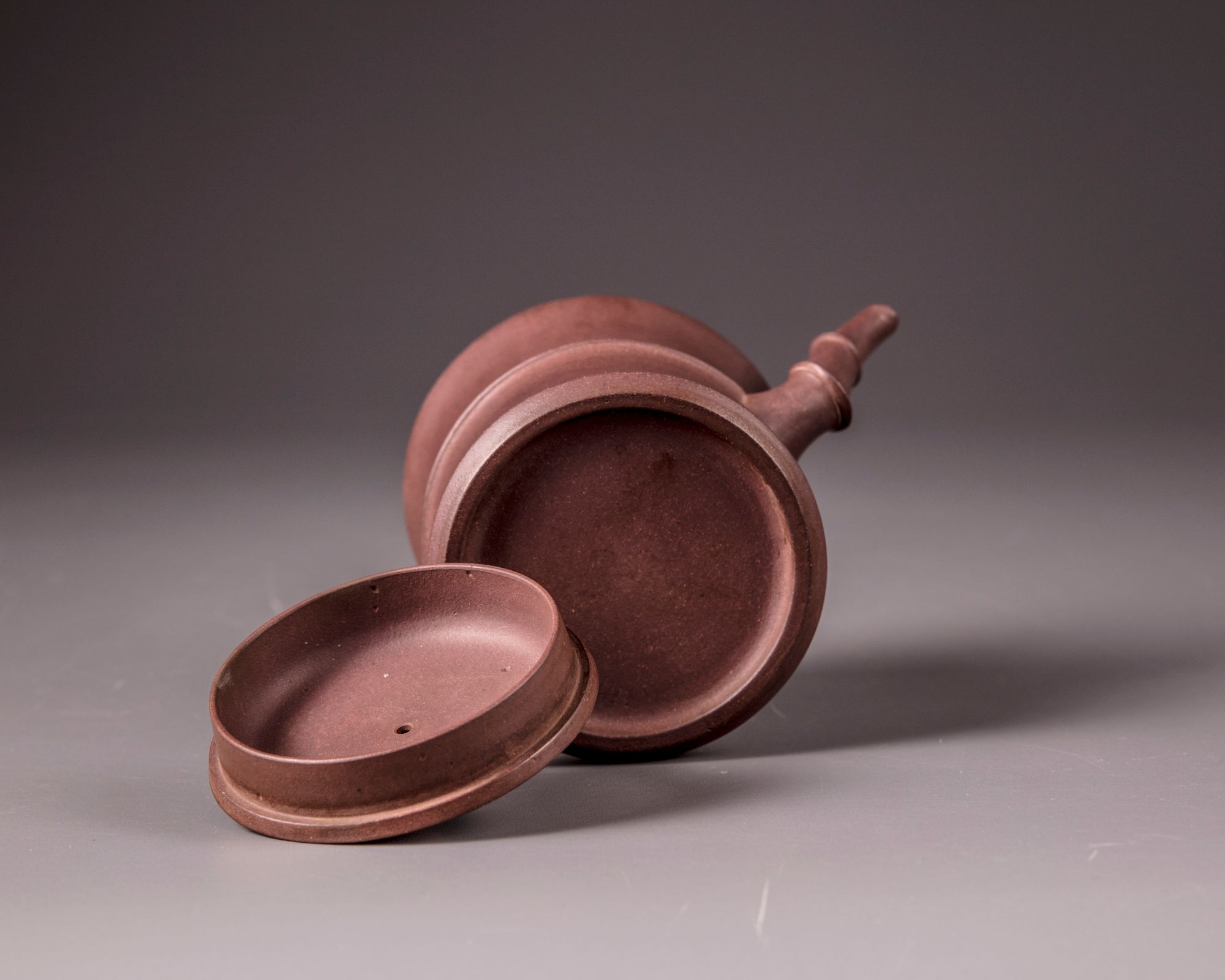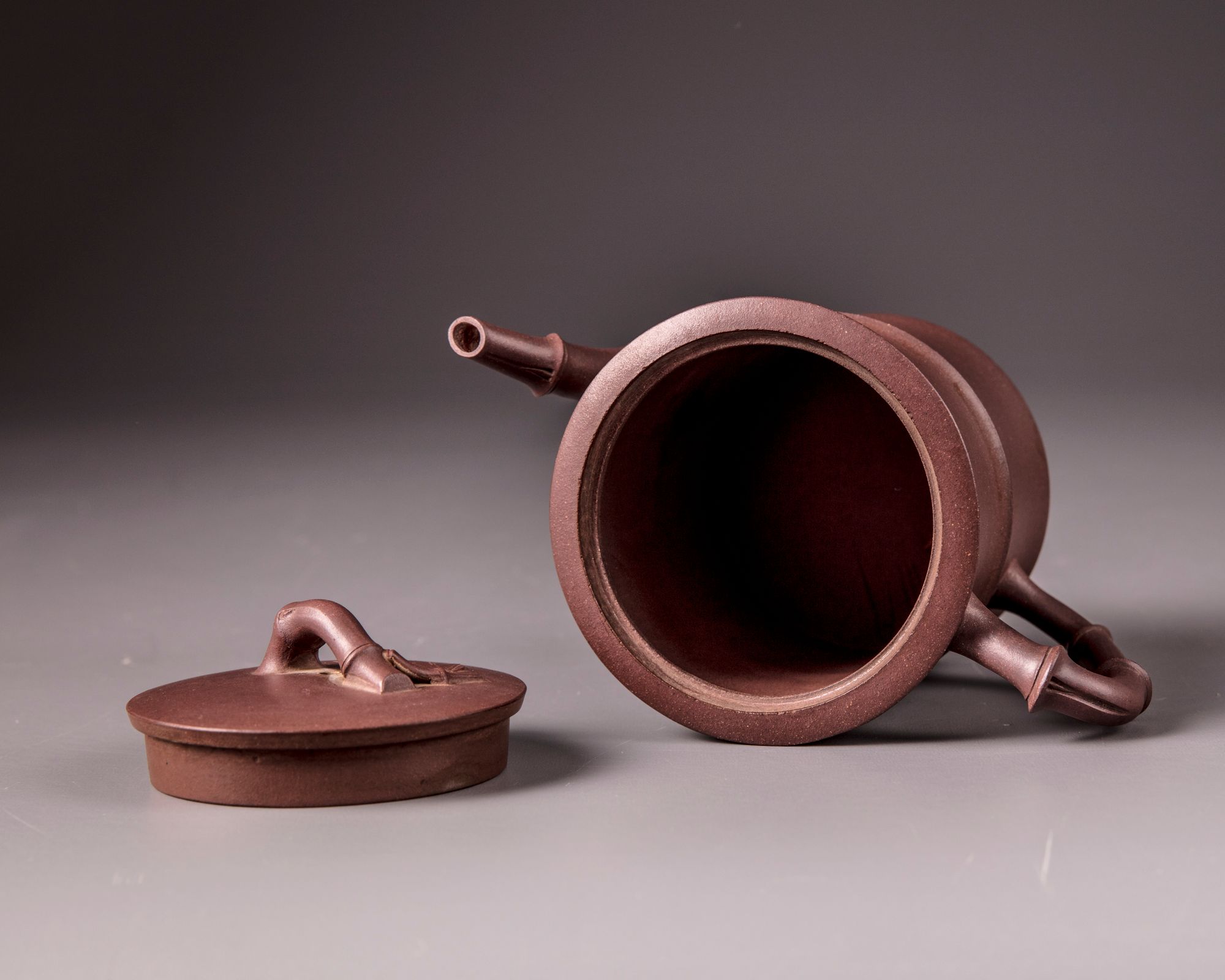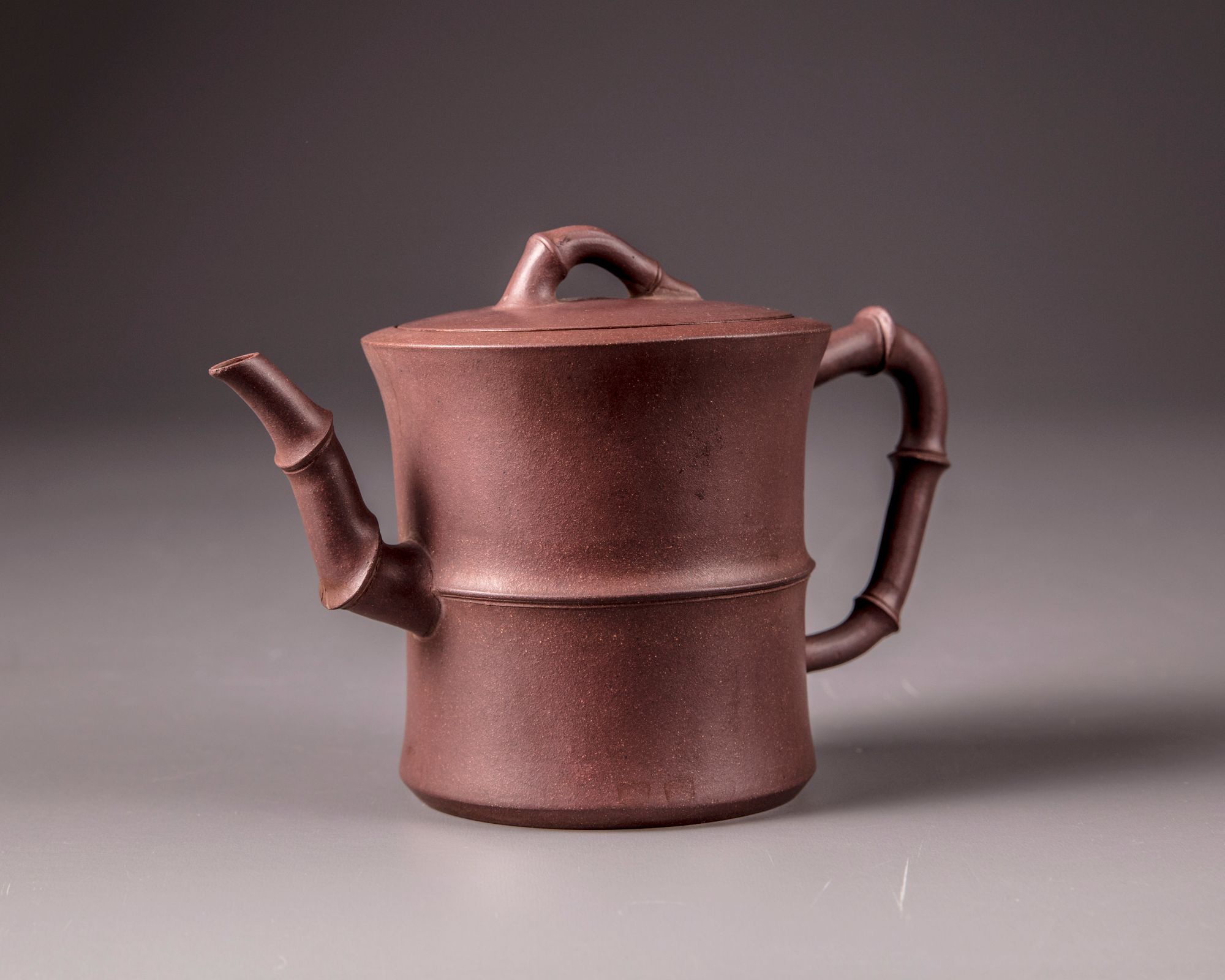 The body of the teapot is crafted as two bamboo sections, the spout and the handle are modelled imitating further sections of bamboo. The cover is decorated with a leafy bamboo finial.