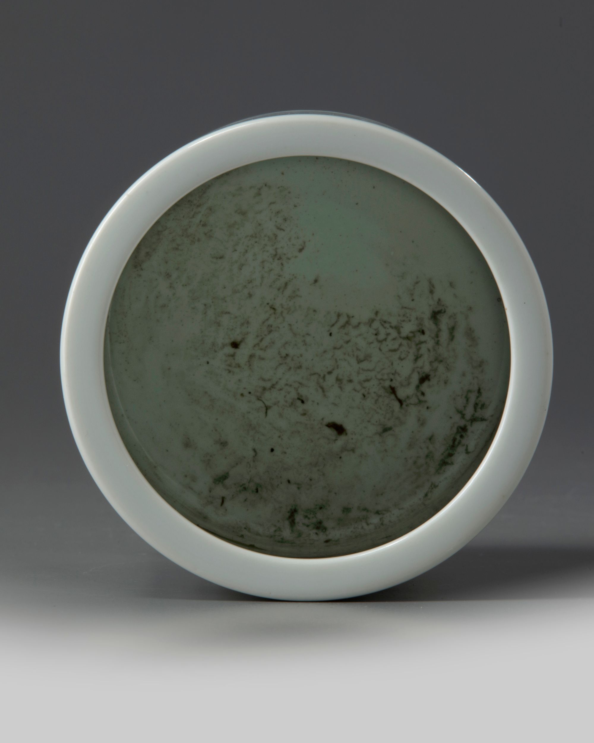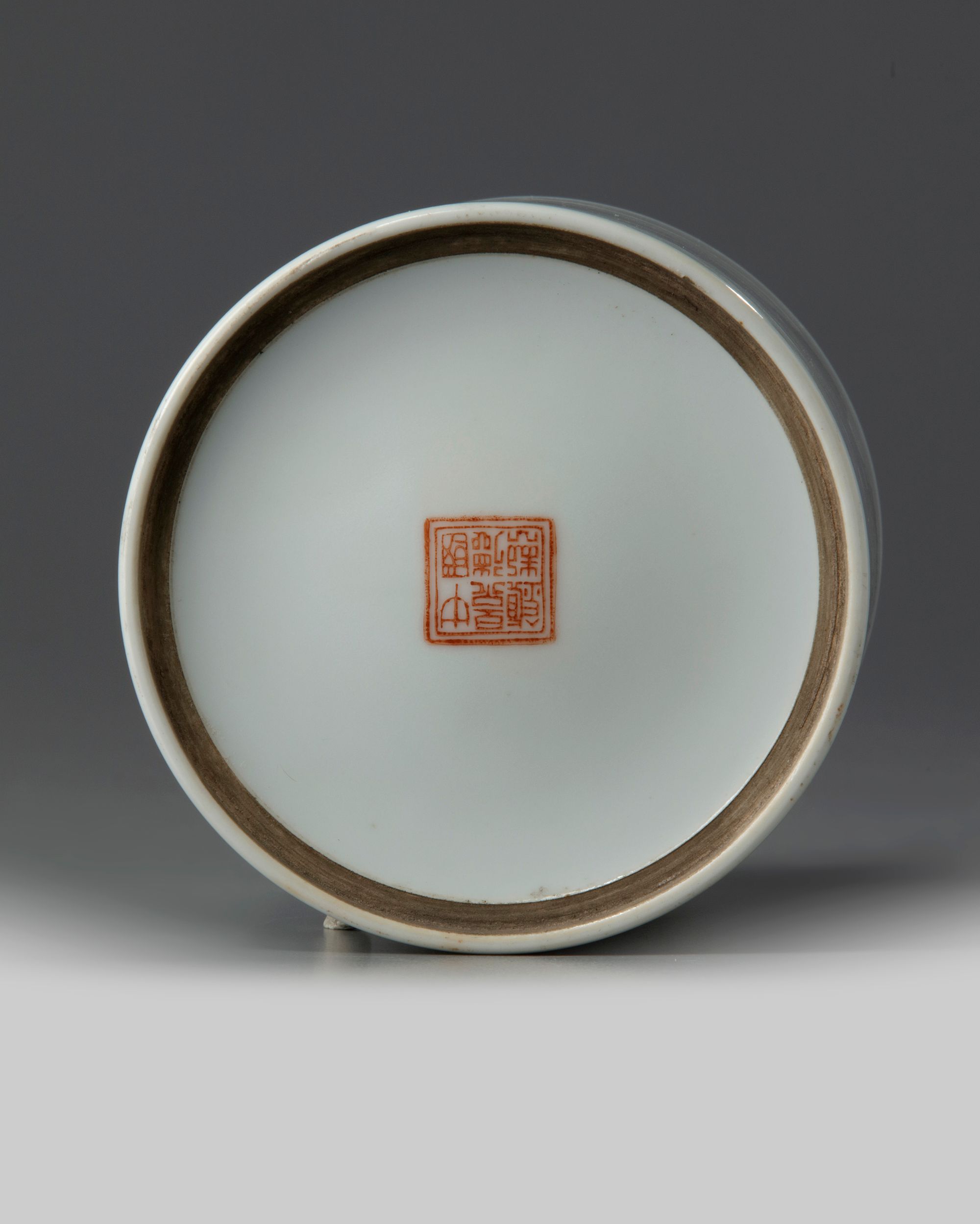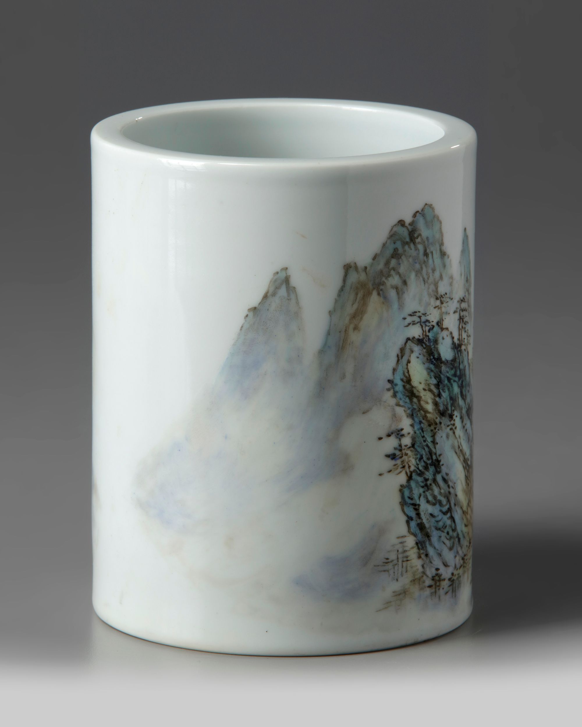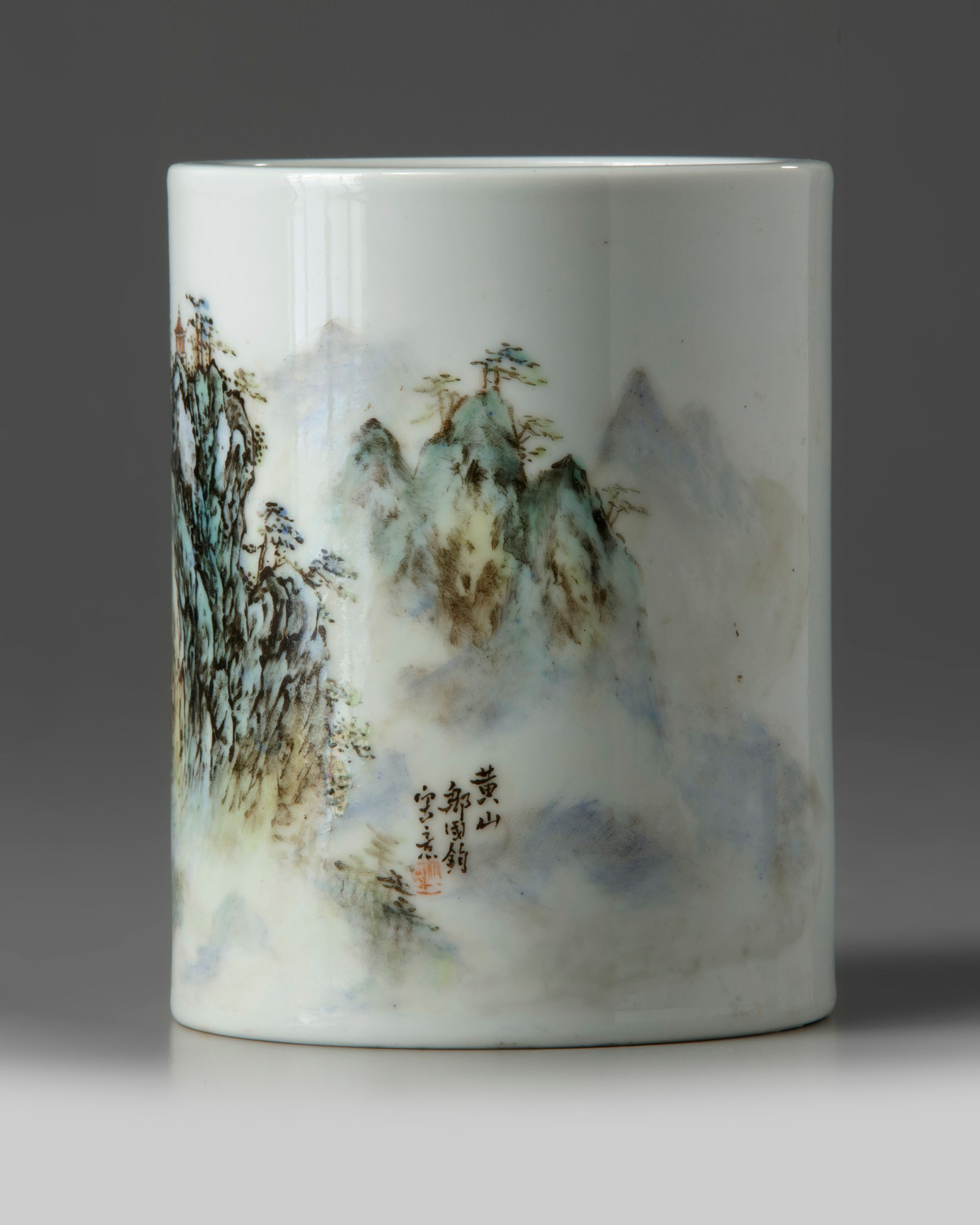 The exterior is decorated with figures mounting a long staircase in a mountainous landscape. The scene is inscribed 'Huang shan' (Yellow mountain) with the signature of Zou Guojun and a seal in iron red. The base is marked with a 'Zhongguo Jingdezhen zhi' stamped mark in red enamel.