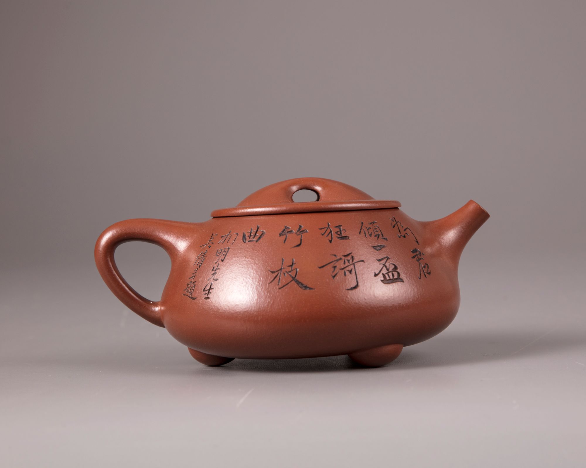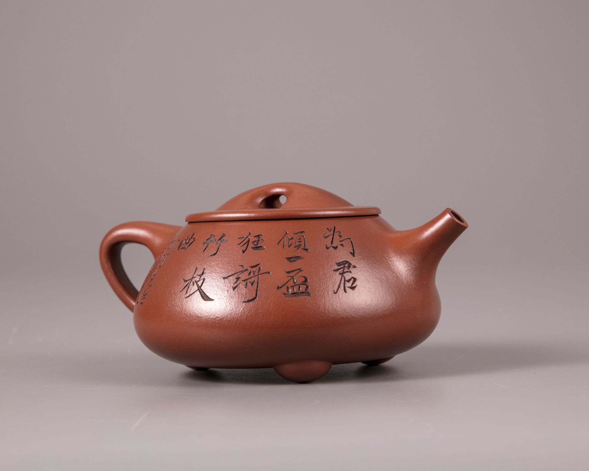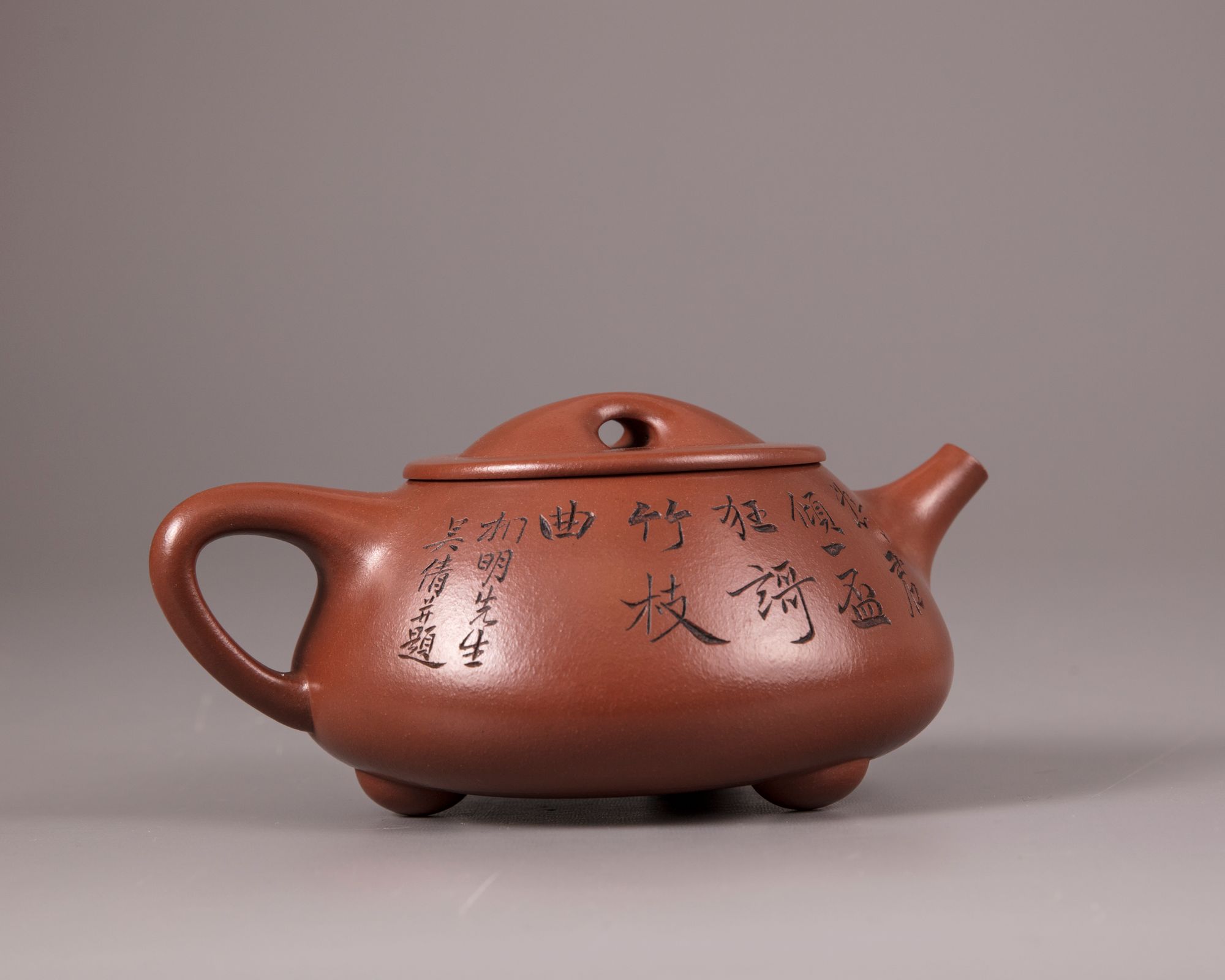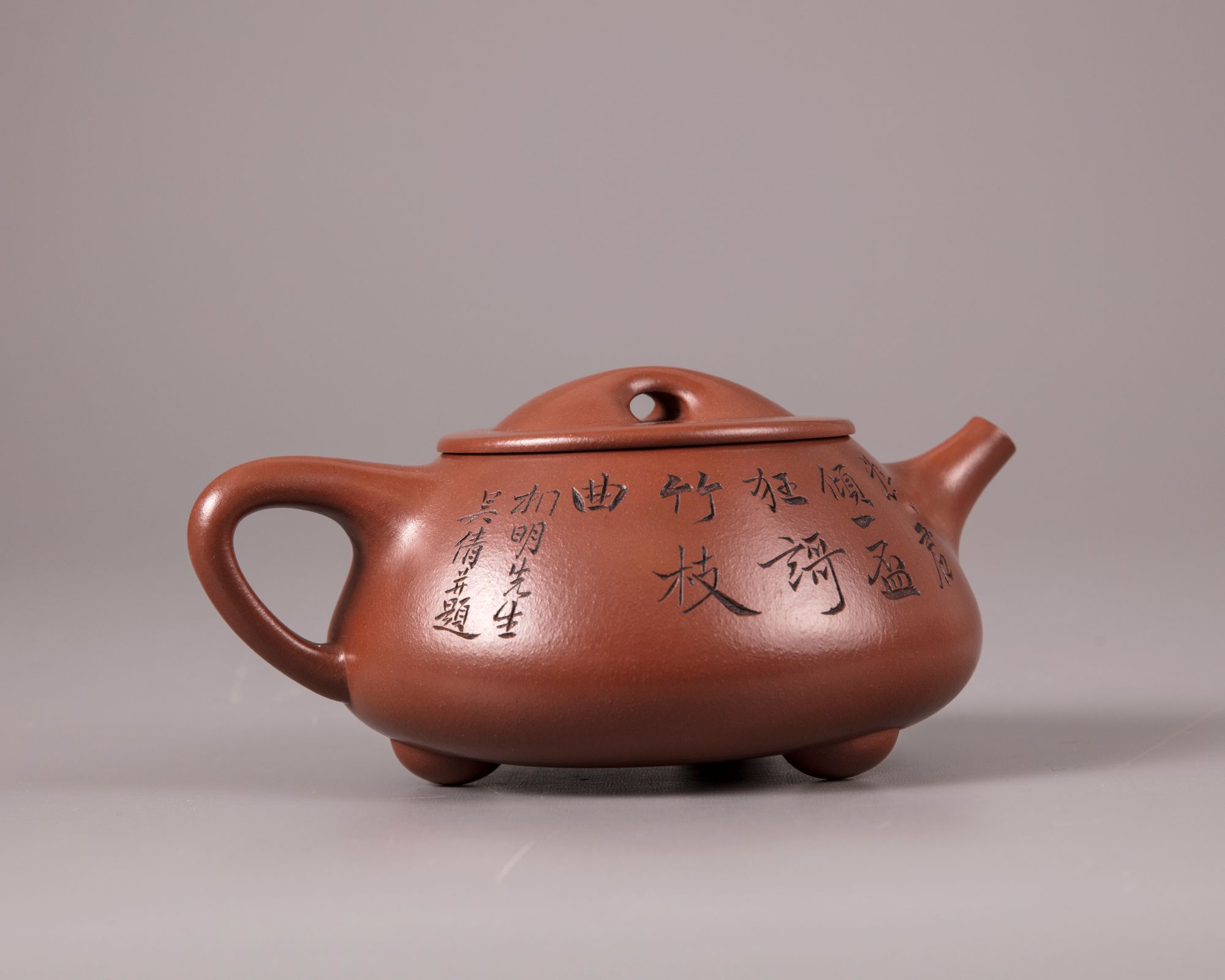 The squat teapot stands on three ball feet and is carved with a poem and a dedication, the reverse is with an incised bamboo spray and inscribed 'Hu Fan'. The base and underside of the cover are marked 'Gu Jingzhou' and 'Jingzhou' respectively.