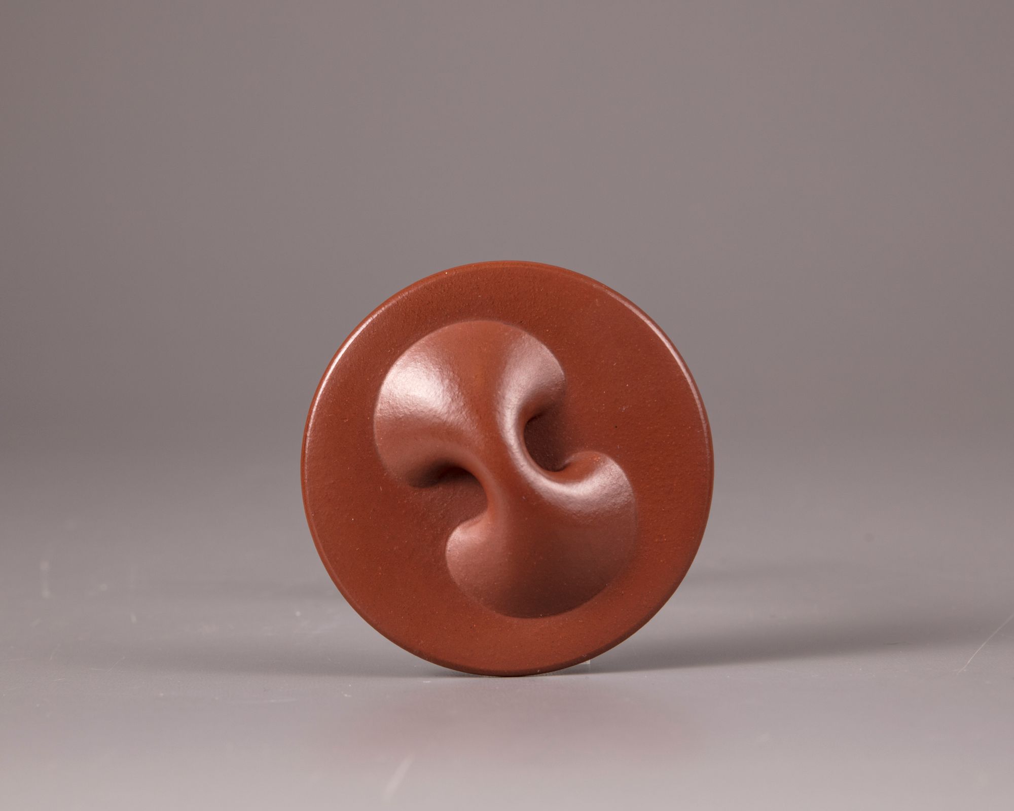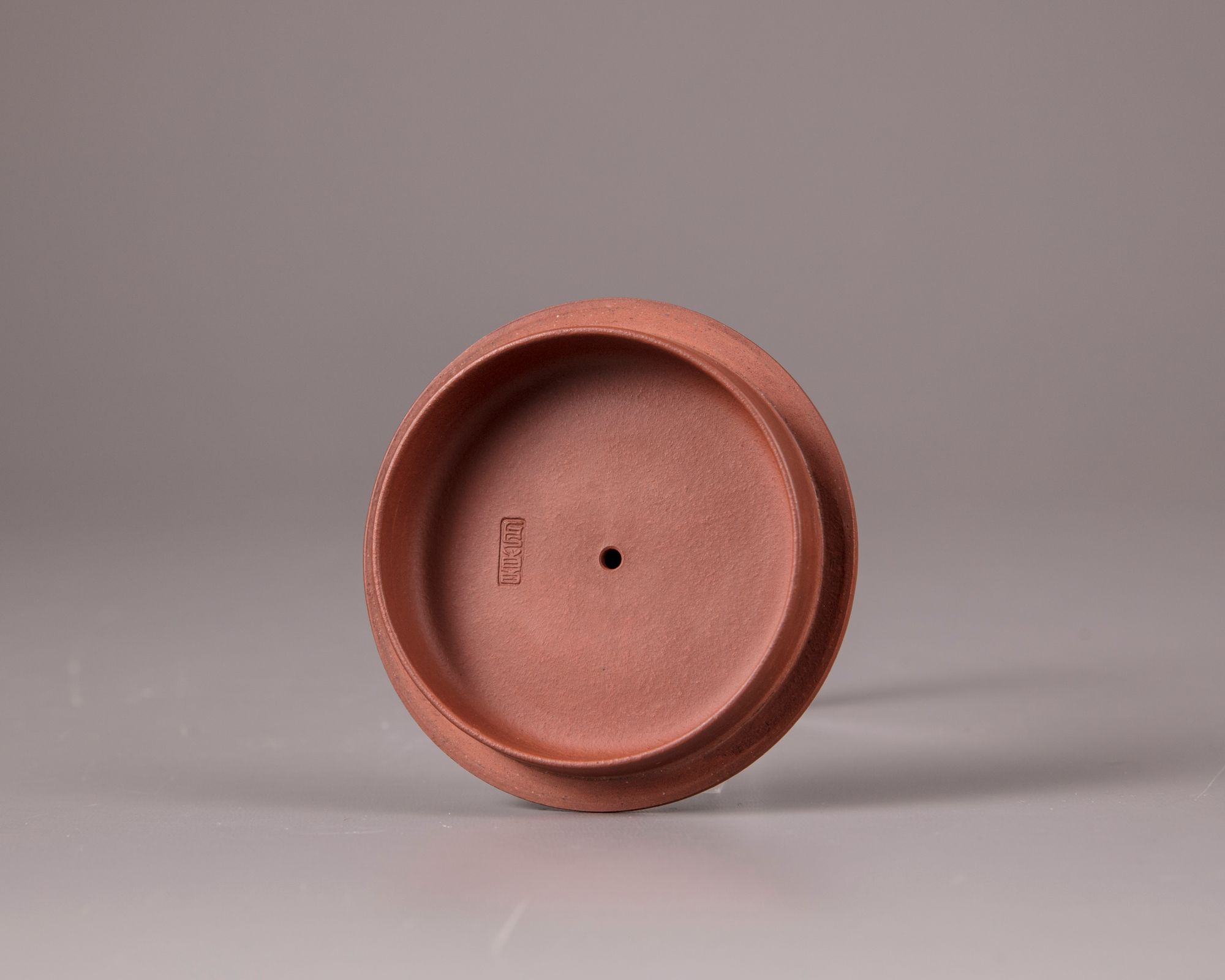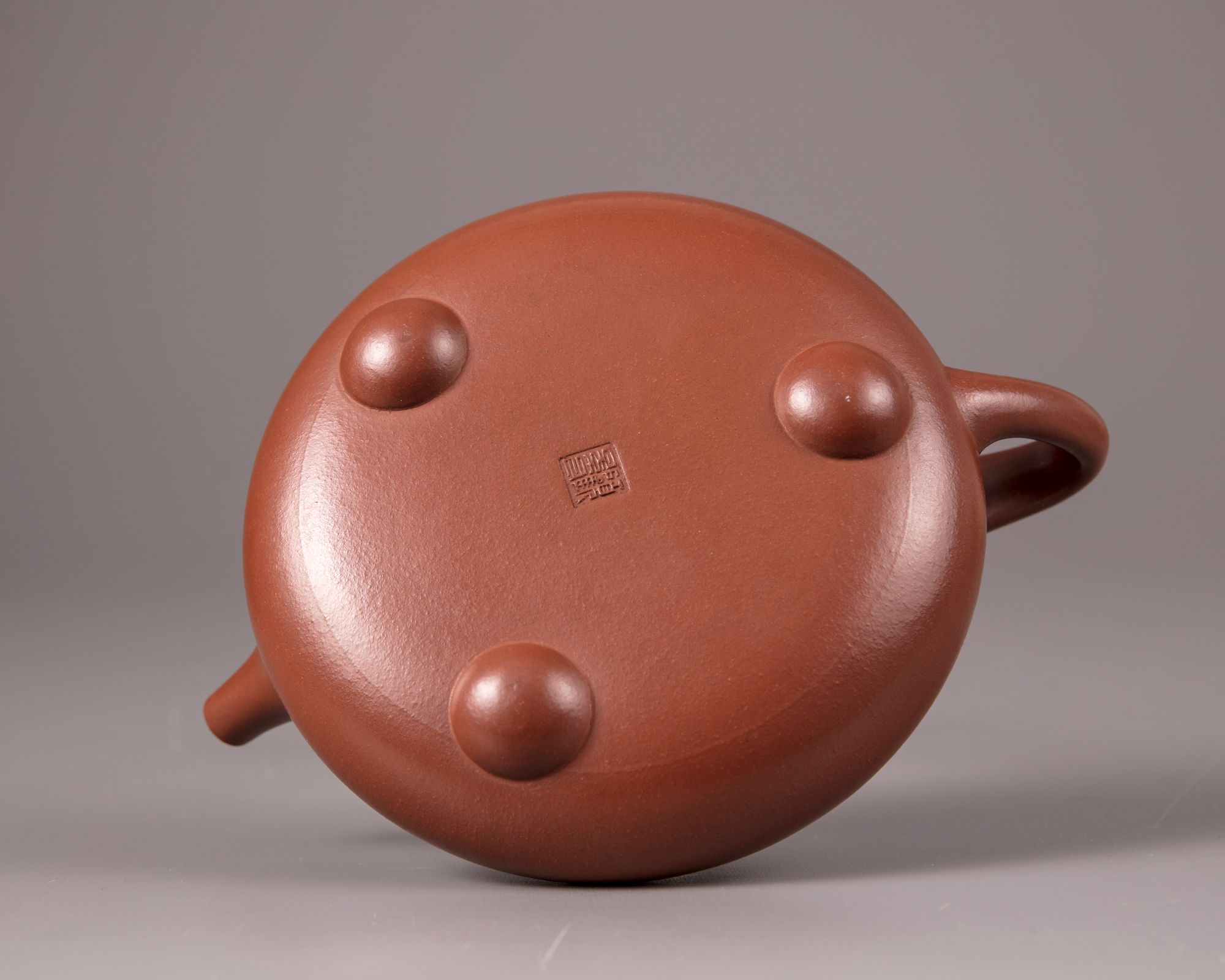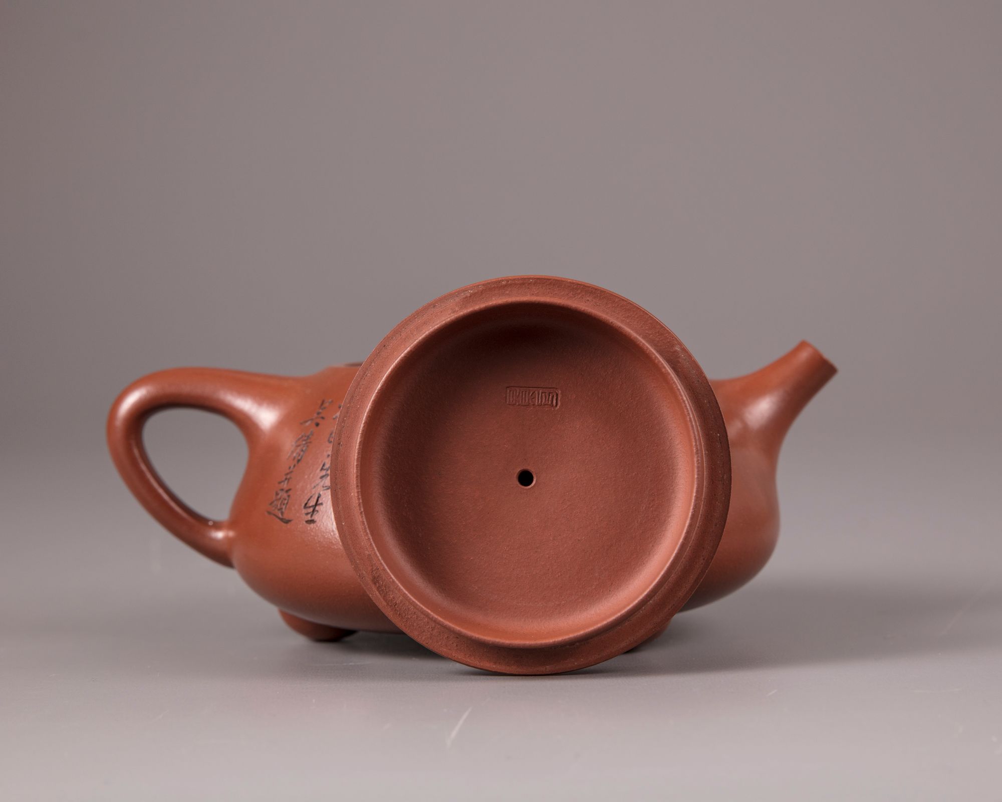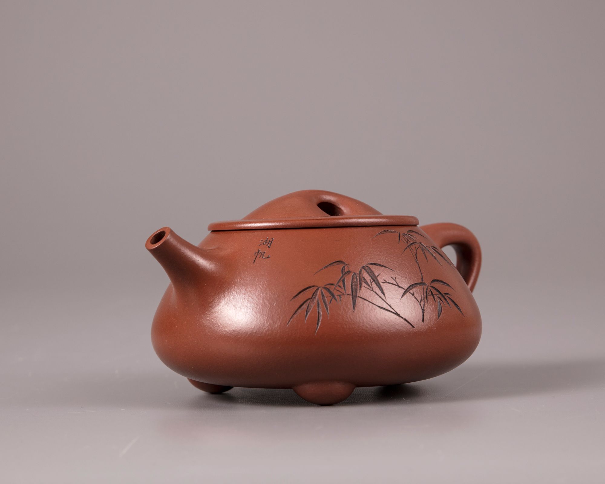 The squat teapot stands on three ball feet and is carved with a poem and a dedication, the reverse is with an incised bamboo spray and inscribed 'Hu Fan'. The base and underside of the cover are marked 'Gu Jingzhou' and 'Jingzhou' respectively.