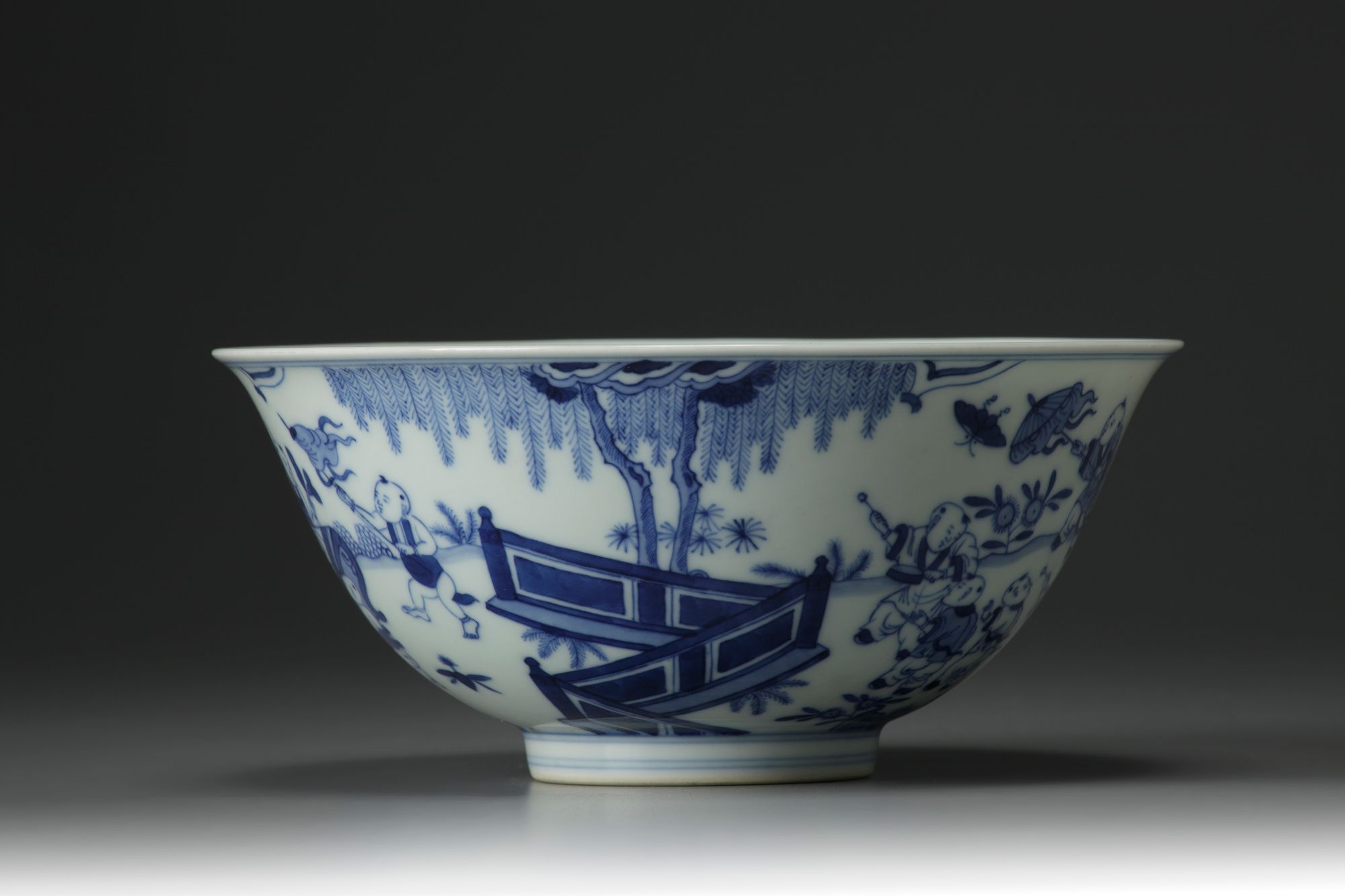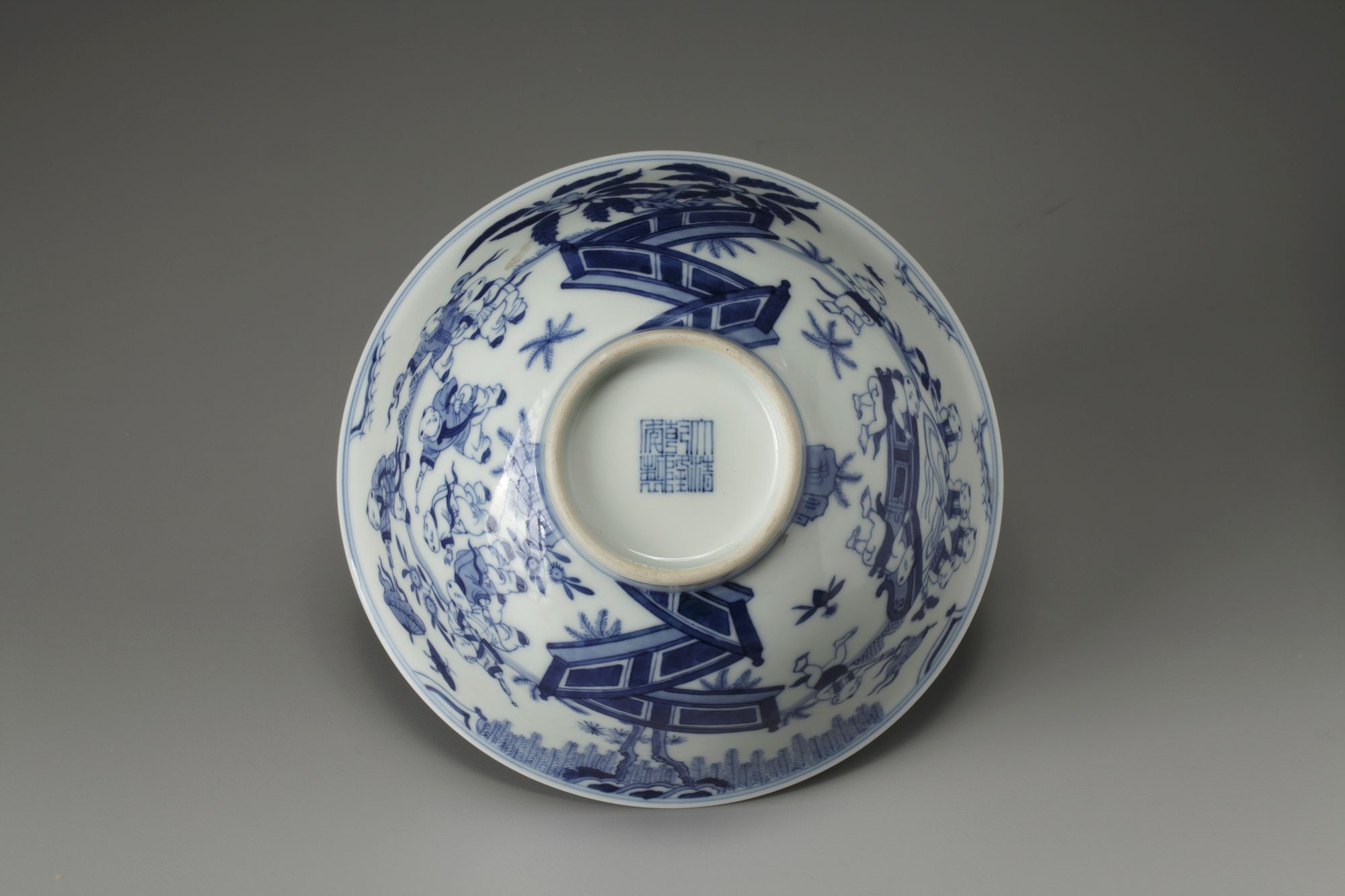 The exterior decorated with a scene of boys playing within a fenced garden scene, with Qianlong seal mark to the base.