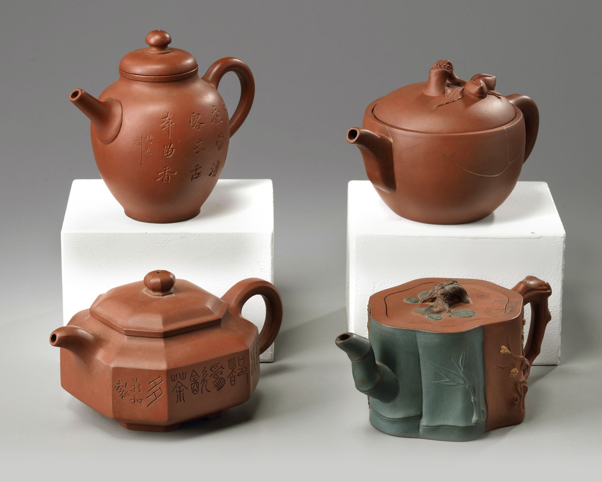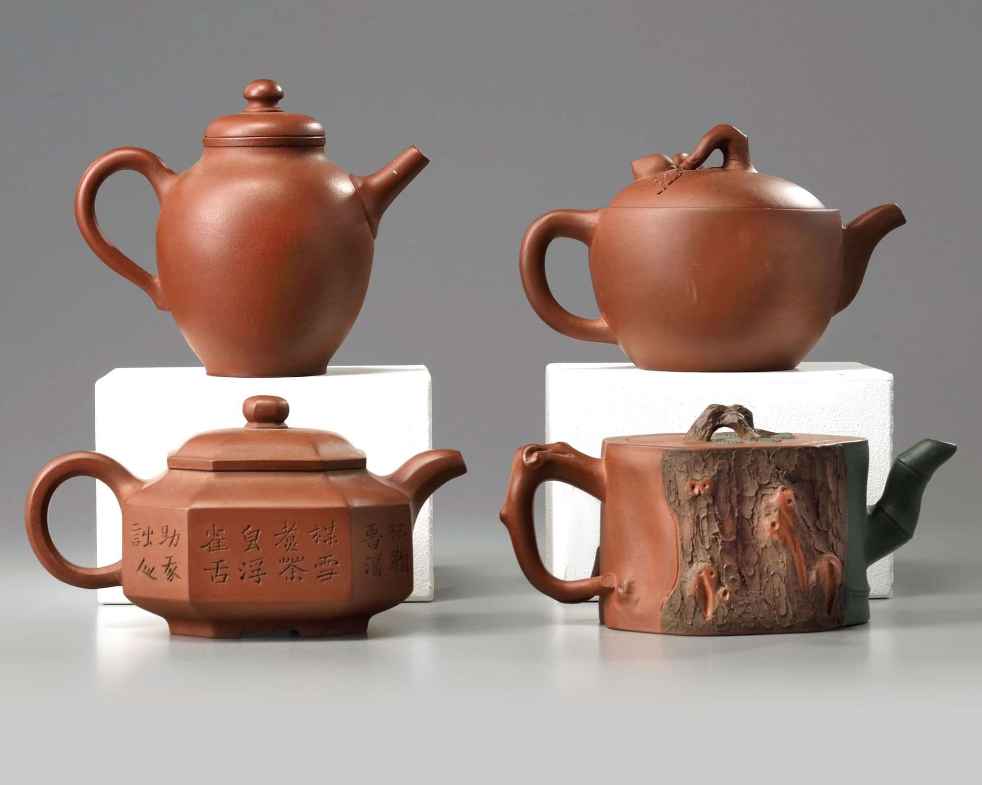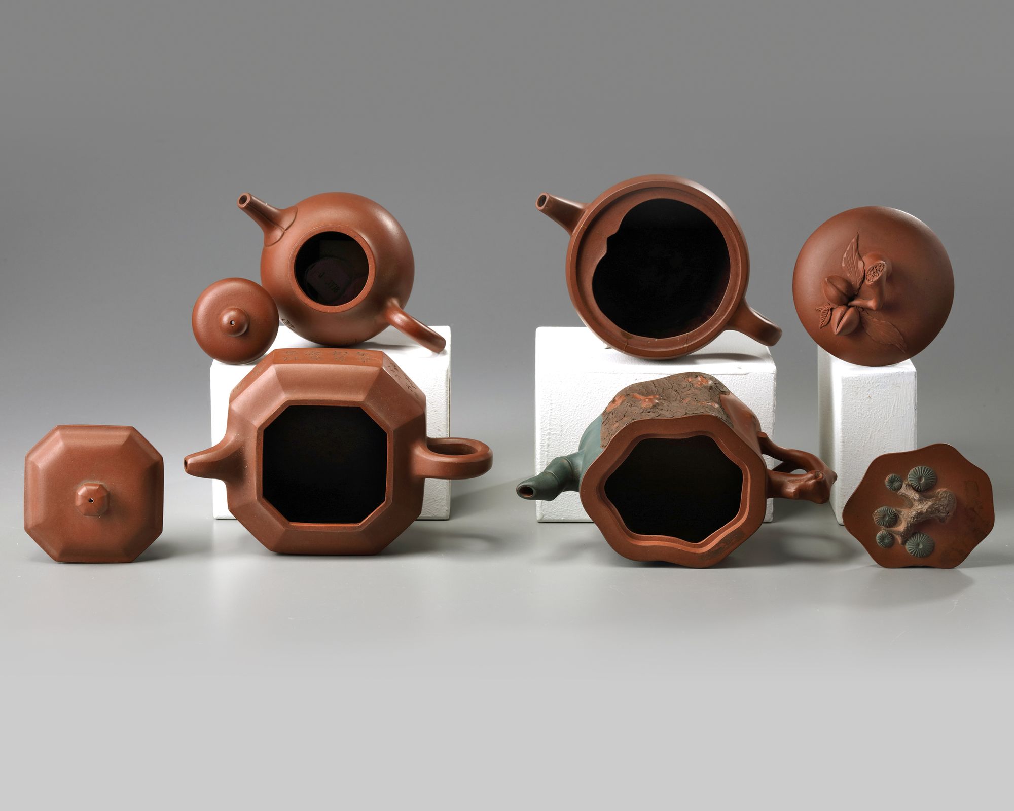 Comprising: A ‘Three Friends of Winter’ teapot, the underside of the cover marked; globular teapot is incised to one side with a poetic inscription, and the base stamped with a four-character 'Yixing Zisha'; a hexagonal teapot and cover; and a teapot and cover decorated with peaches to the finial, the base marked ‘Jiangsu Yixing zisha minghu’ (famous purple clay teapots of Yixing, Jiangsu’, and the cover is marked ‘yixing’ and ‘Yu Quan’.