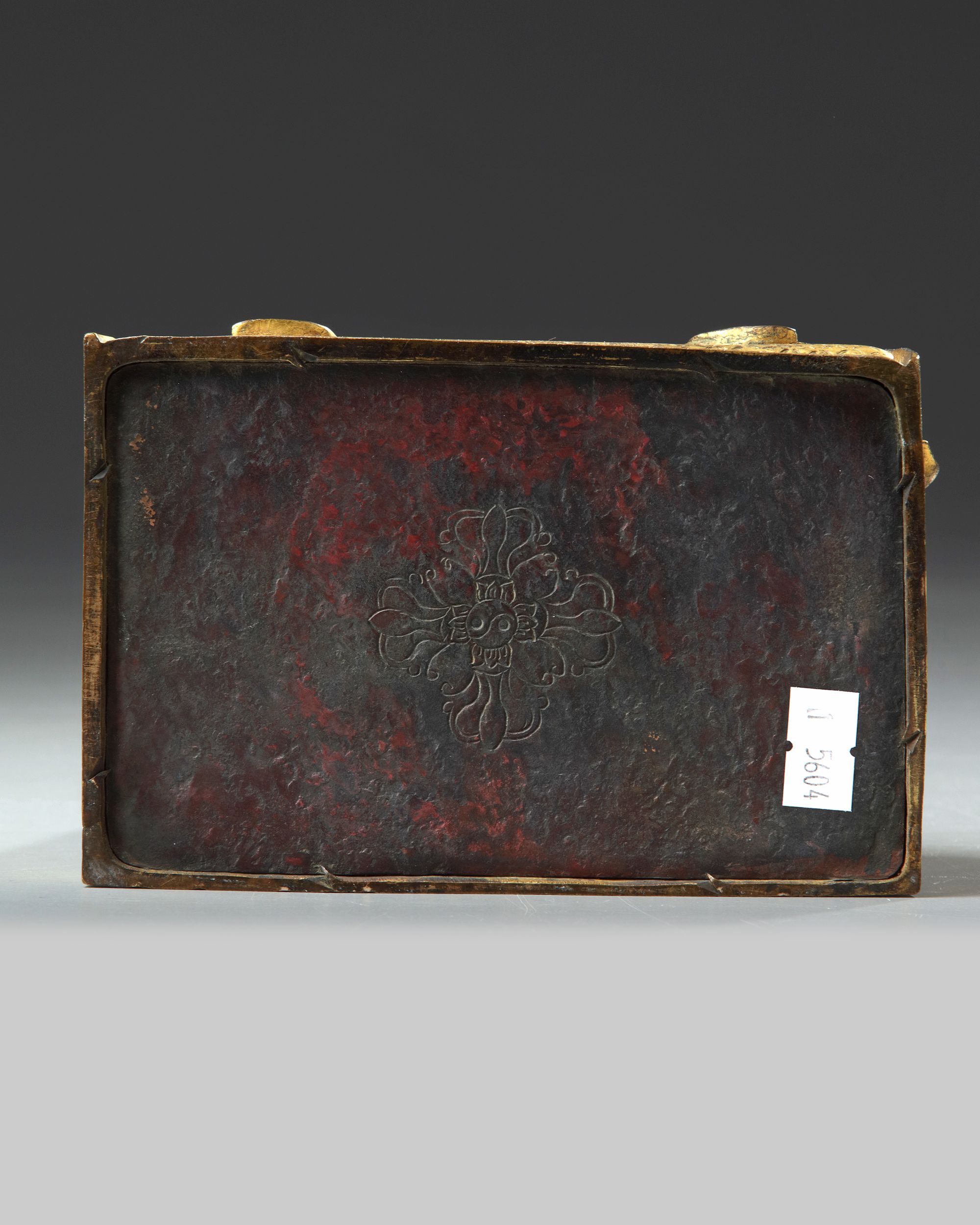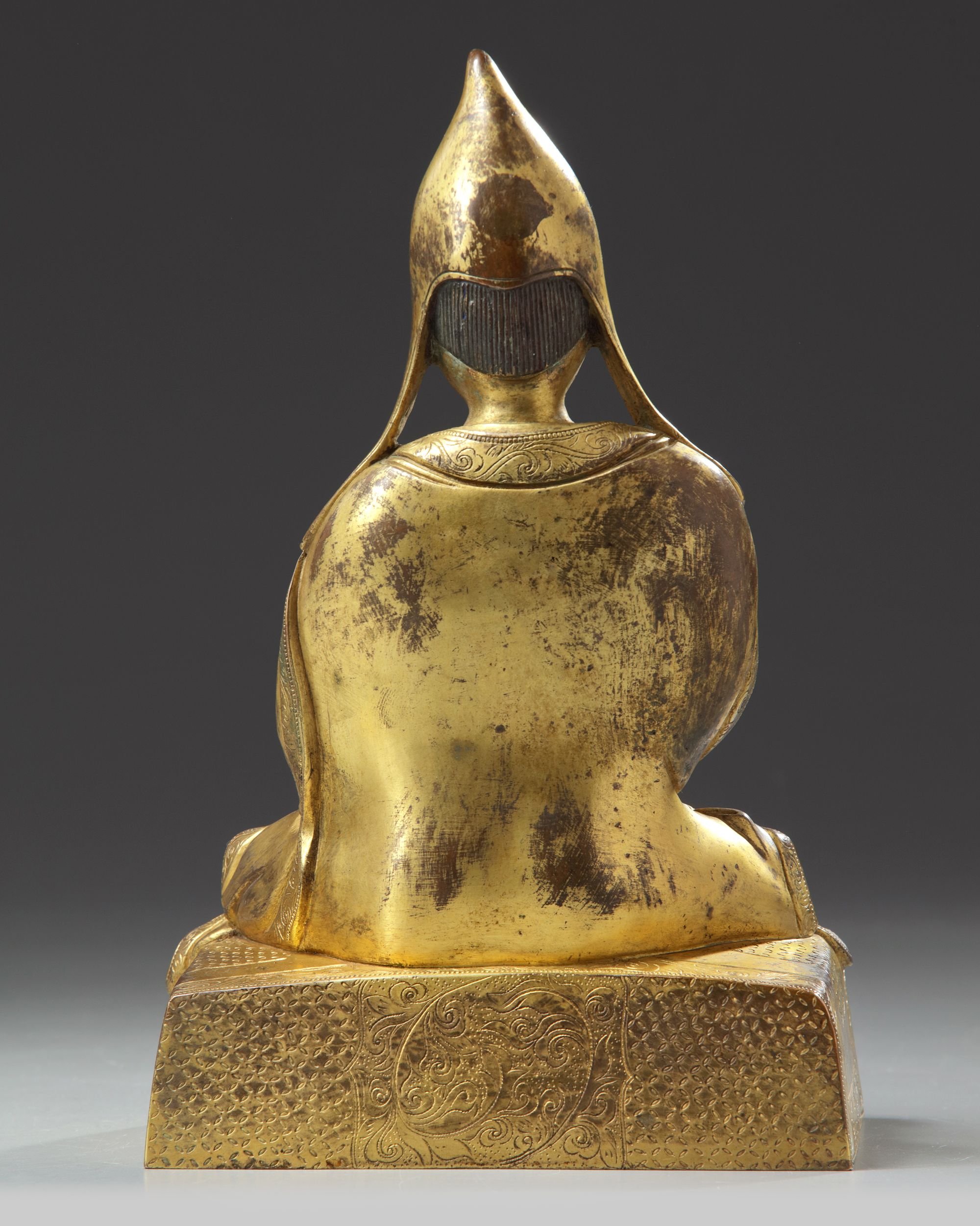 The figure is cast seated on a stepped base decorated with a chased foliate roundel design to the front on a trellis ground, he is wearing long flowing robes decorated with foliate and floral motifs and tall peaked hood, his two hands are held just above his lap. The baseplate is decorated with a double vajra.