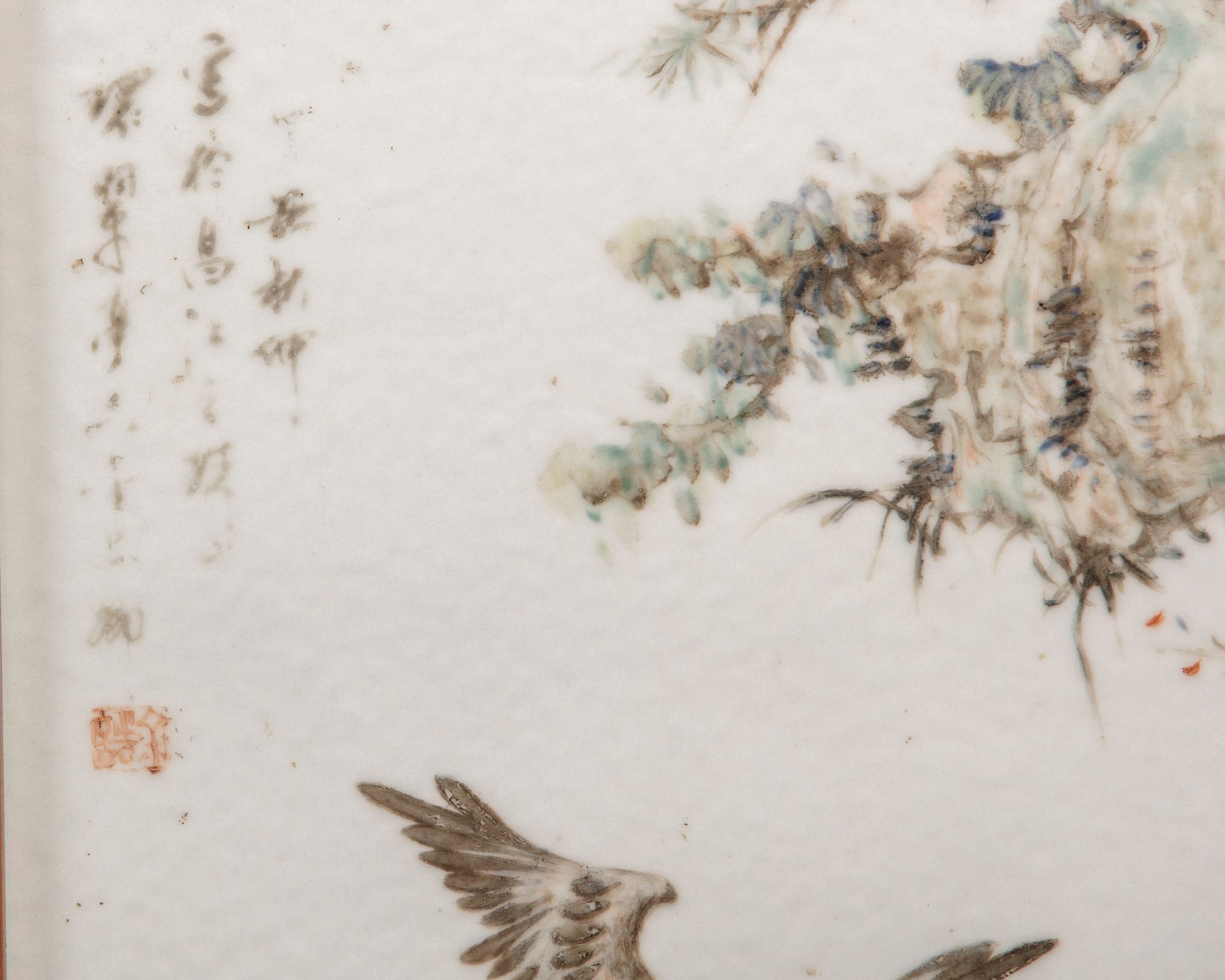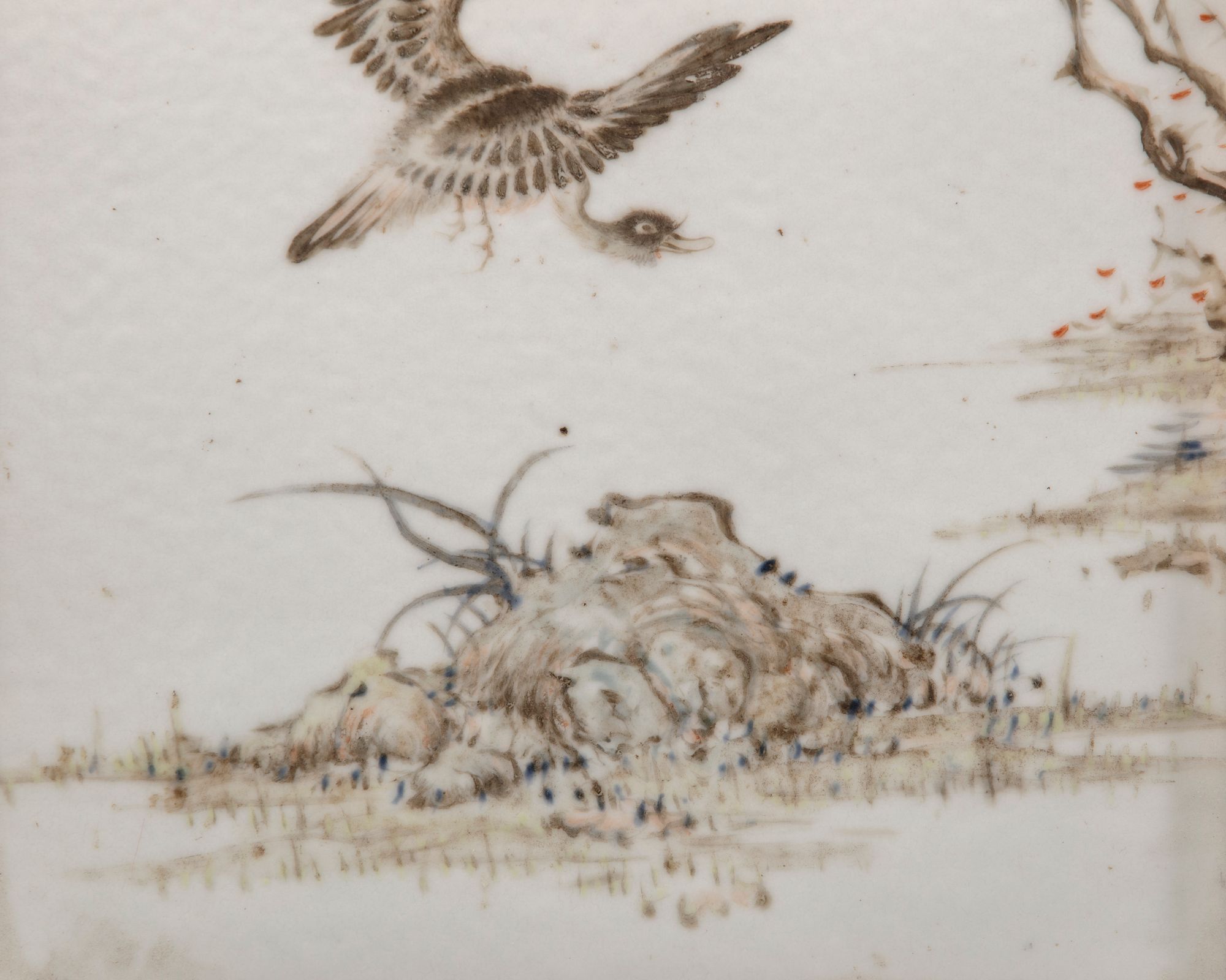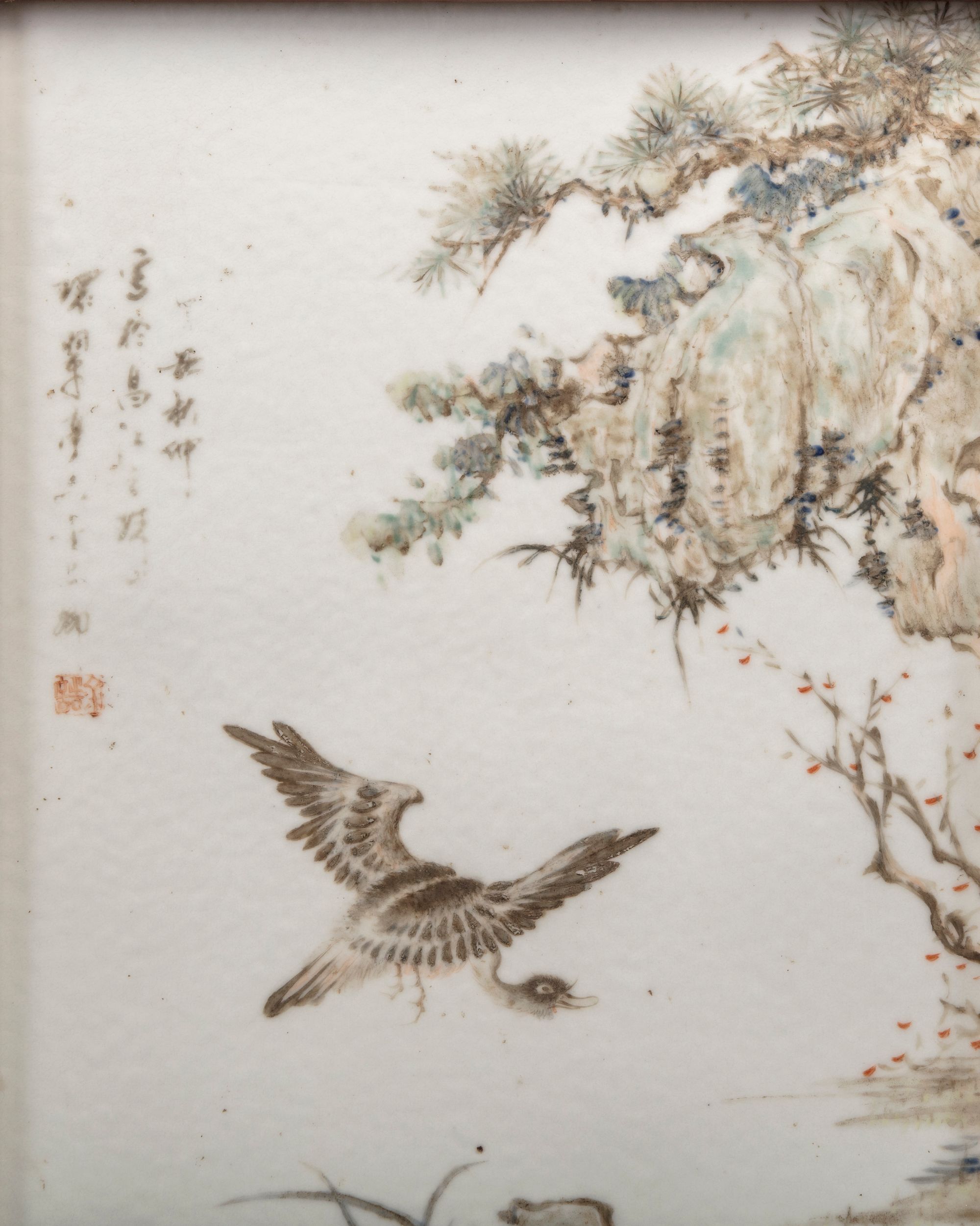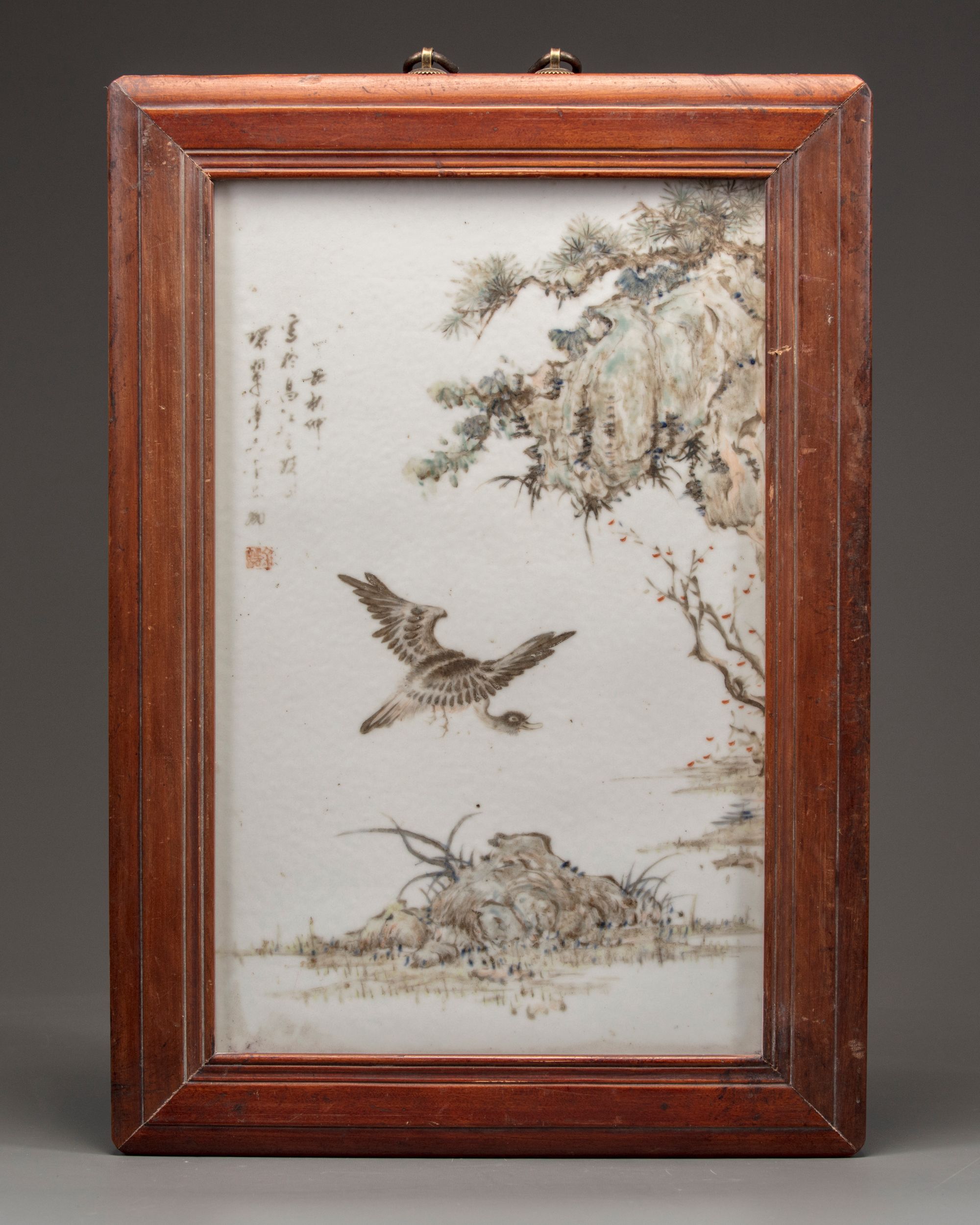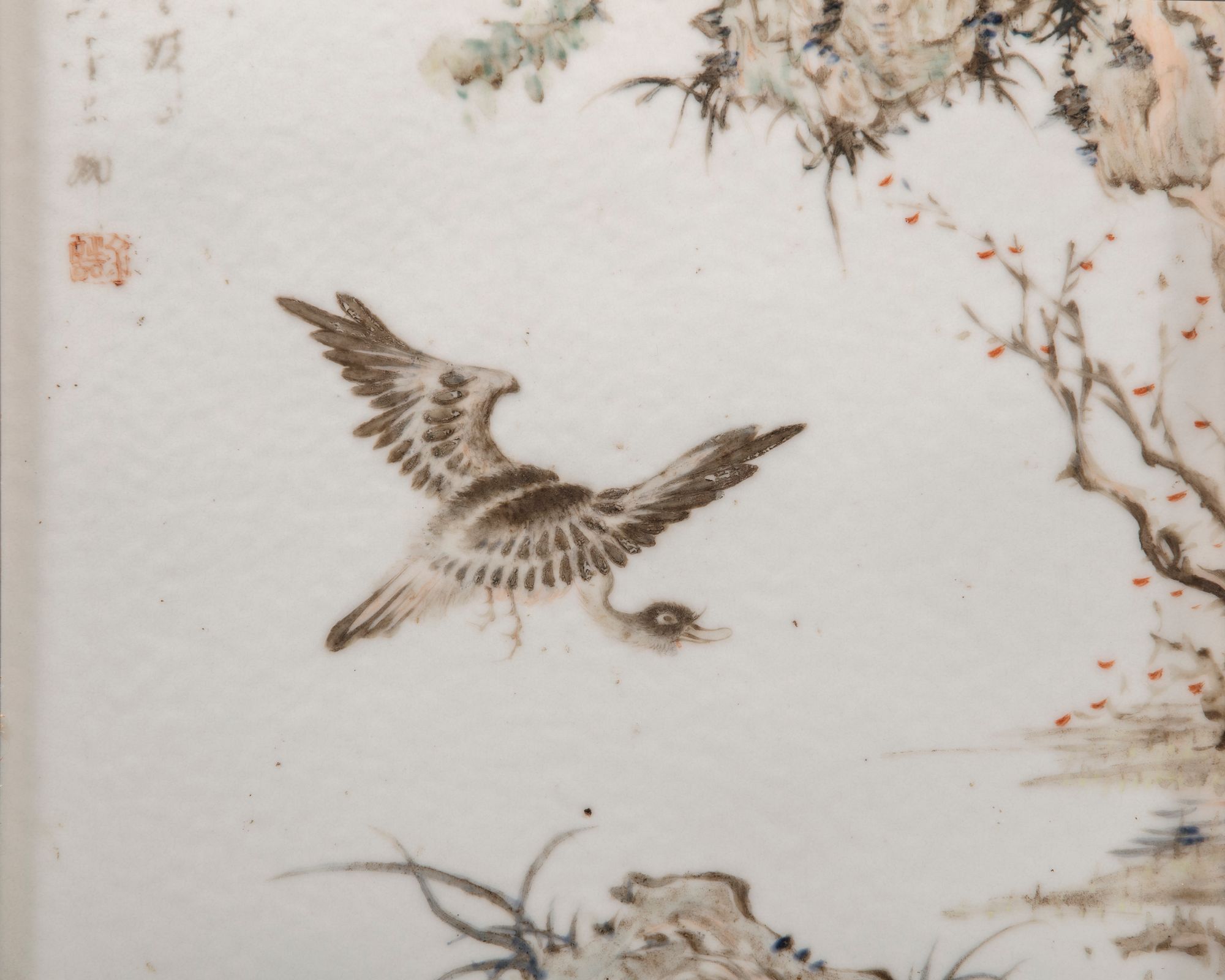 The rectangular plaque is decorated in washed enamels depicting a goose in flight below trees. The scene is entitled 'Ping sha luo yan' and inscribed with the signature Jin Pinqing.