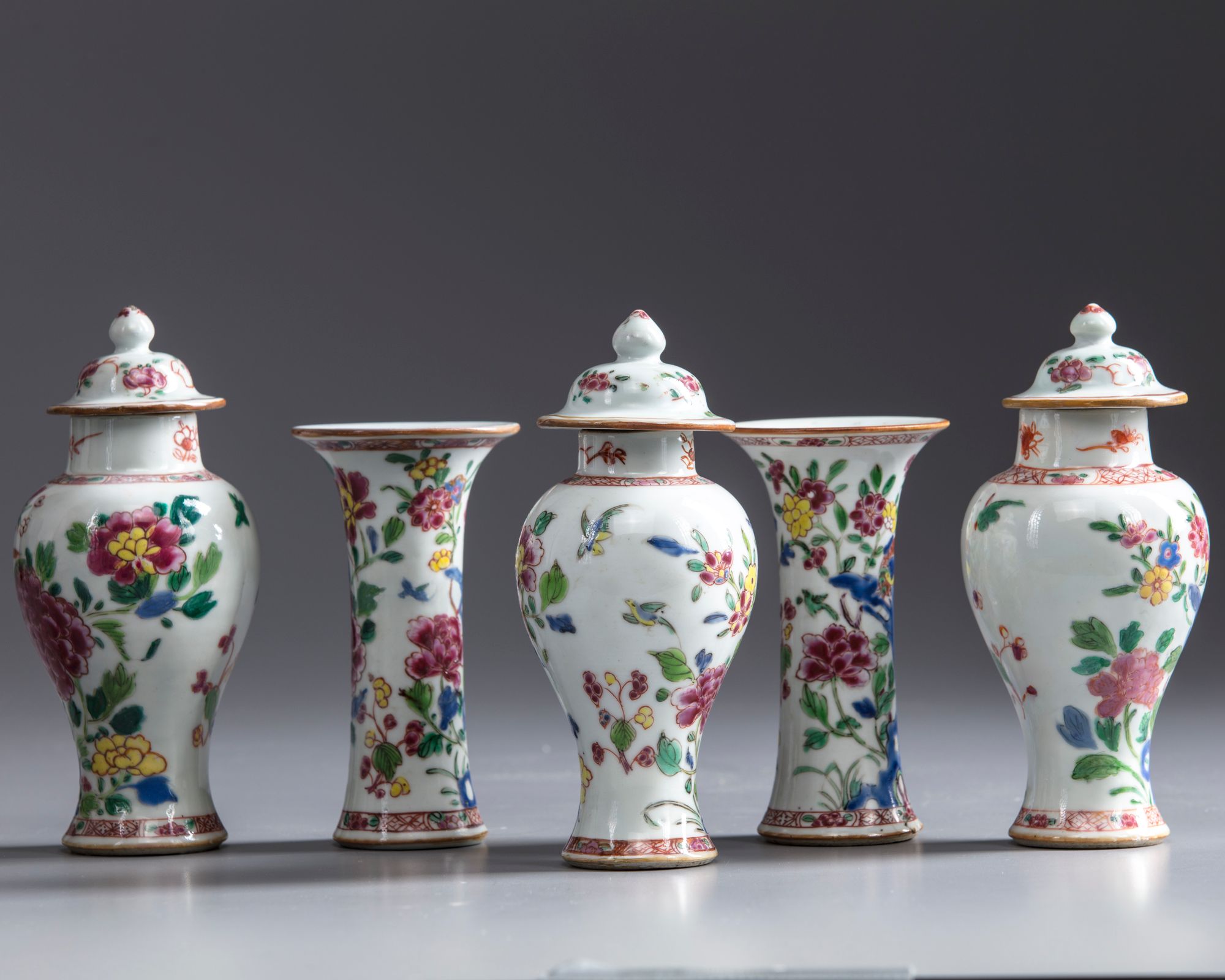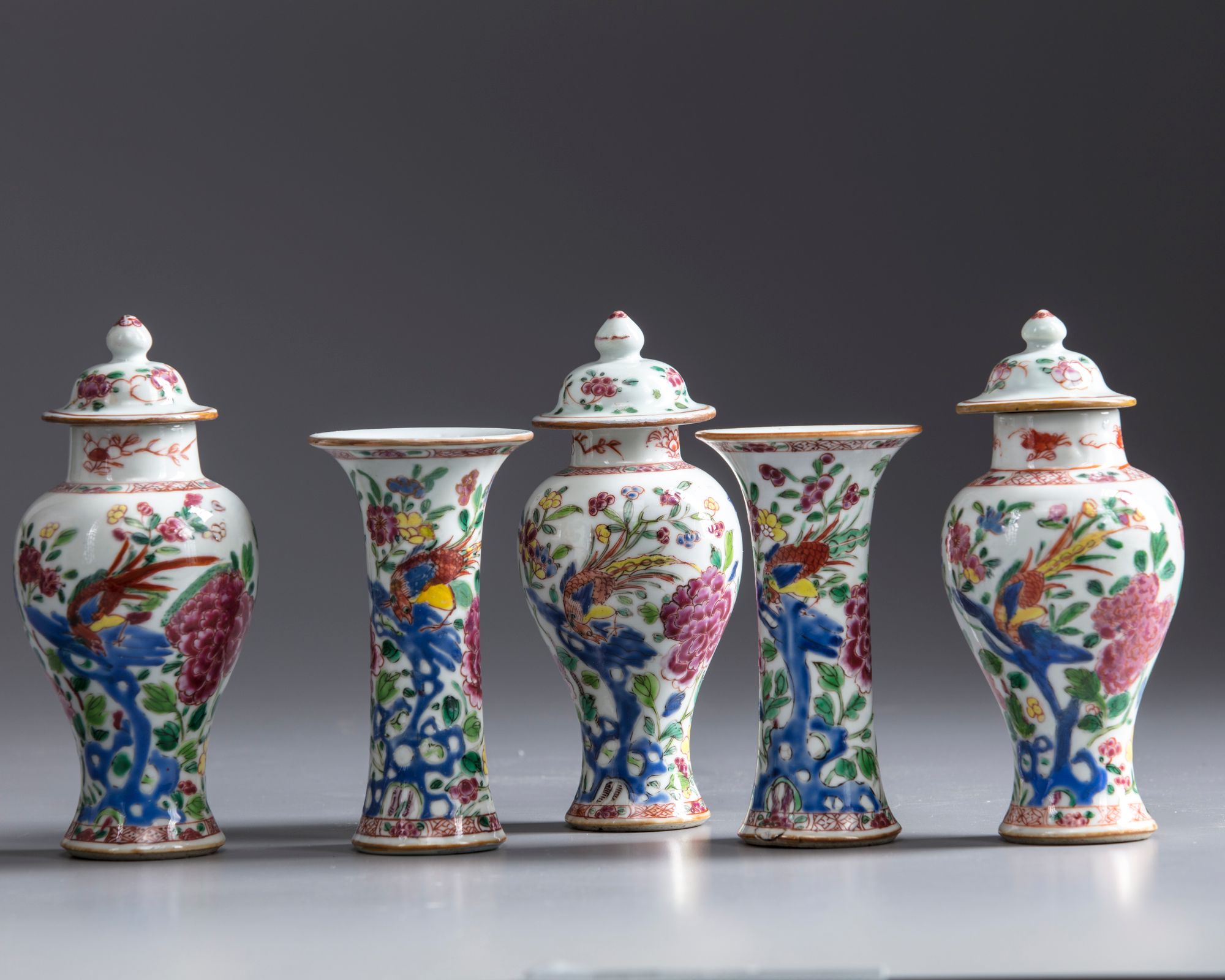 The garniture consists of three baluster vases and covers, and two gu vases, each decorated with a colourful pheasant perched on a pierced rock amongst large flowering peonies, all between two trellis bands. The domed covers are decorated with further flower sprays and are surmounted by lotus bud finials.