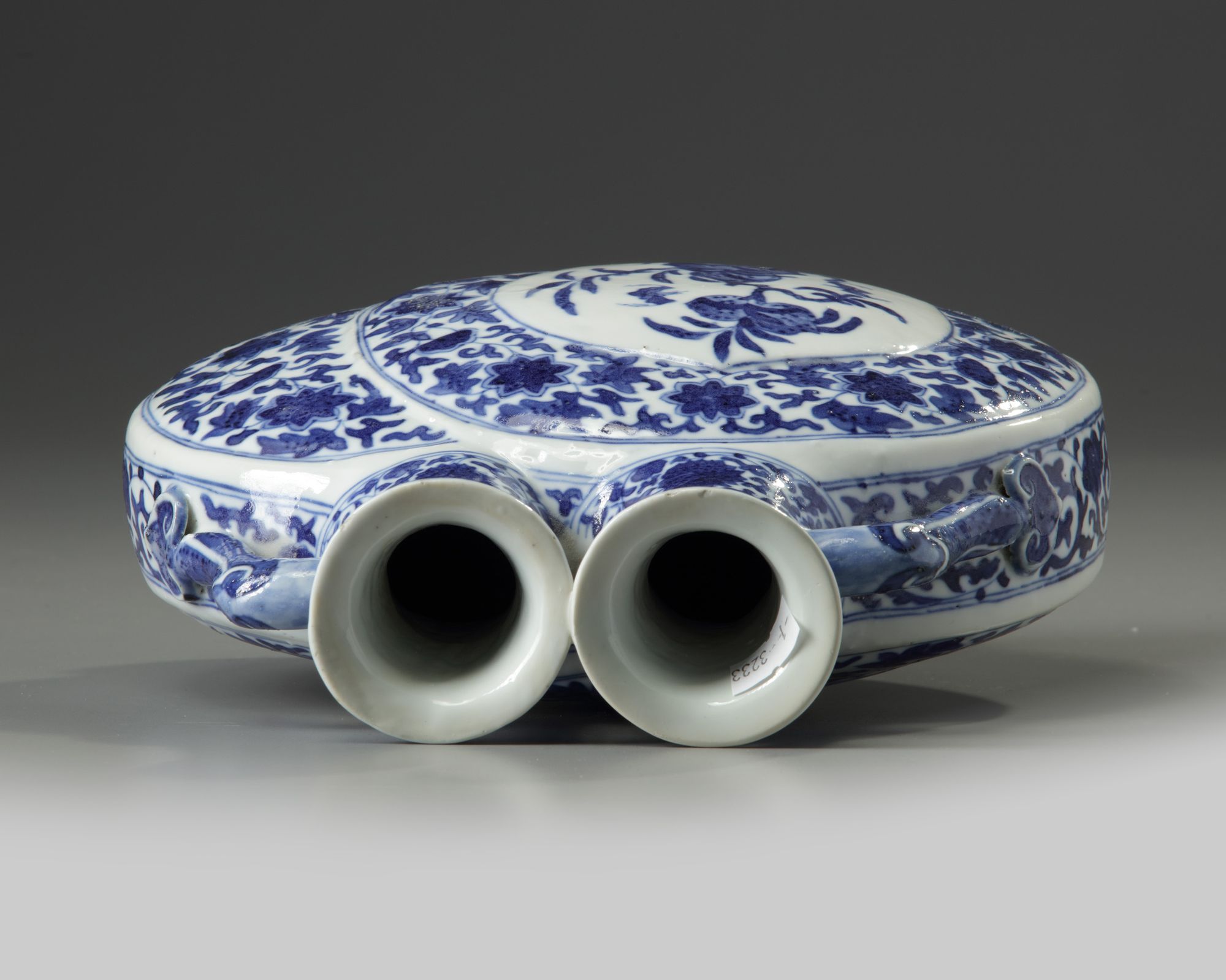 The vase is modelled as two moonflasks, each with one ruyi-head handle to the neck and shoulder. The vase is decorated to each side with a peach-shaped panel enclosing five peaches and two bats, all surrounded by a flower scroll. The narrow sides and neck are decorated with further foliate scrolls. The base with two Daoguang marks.