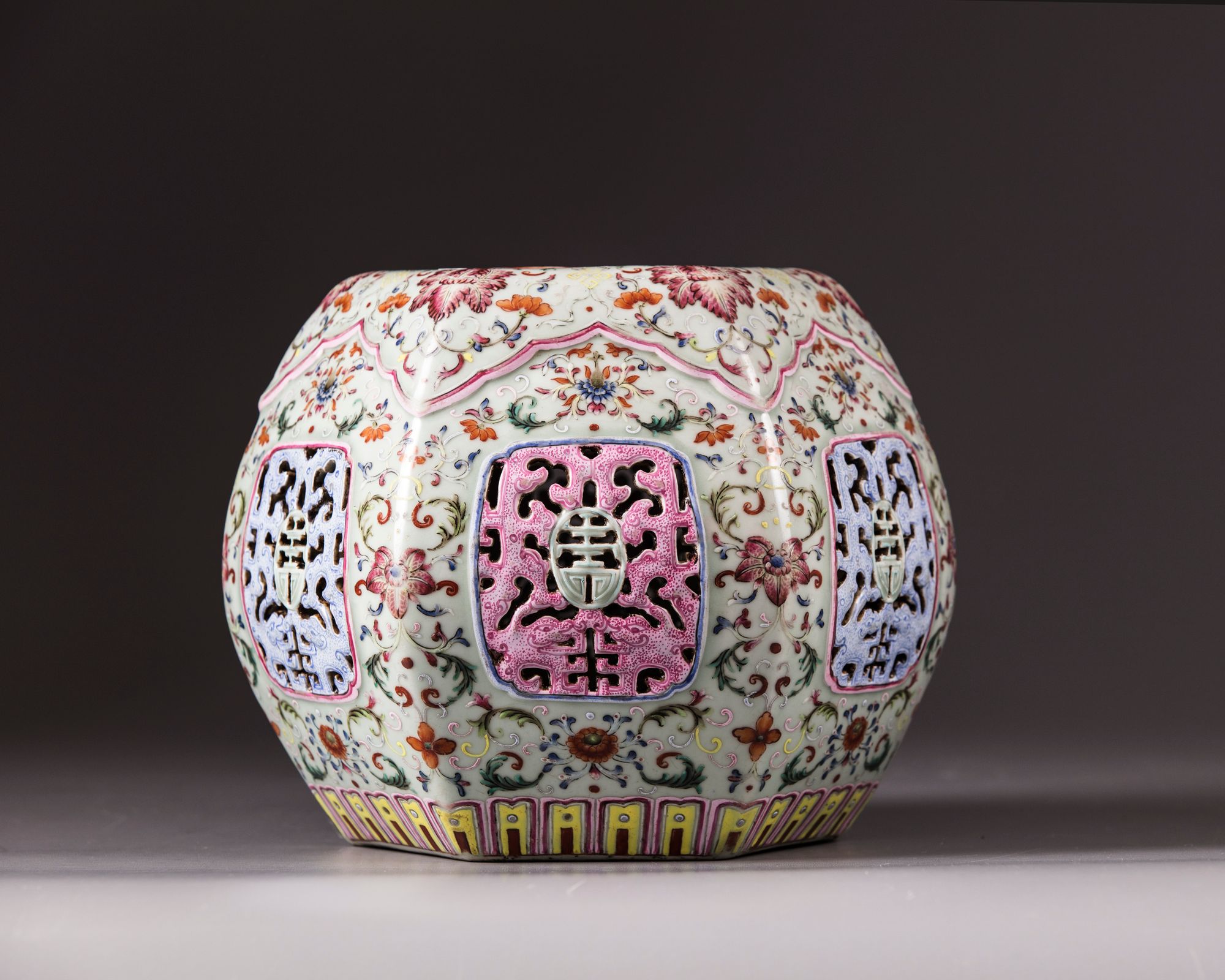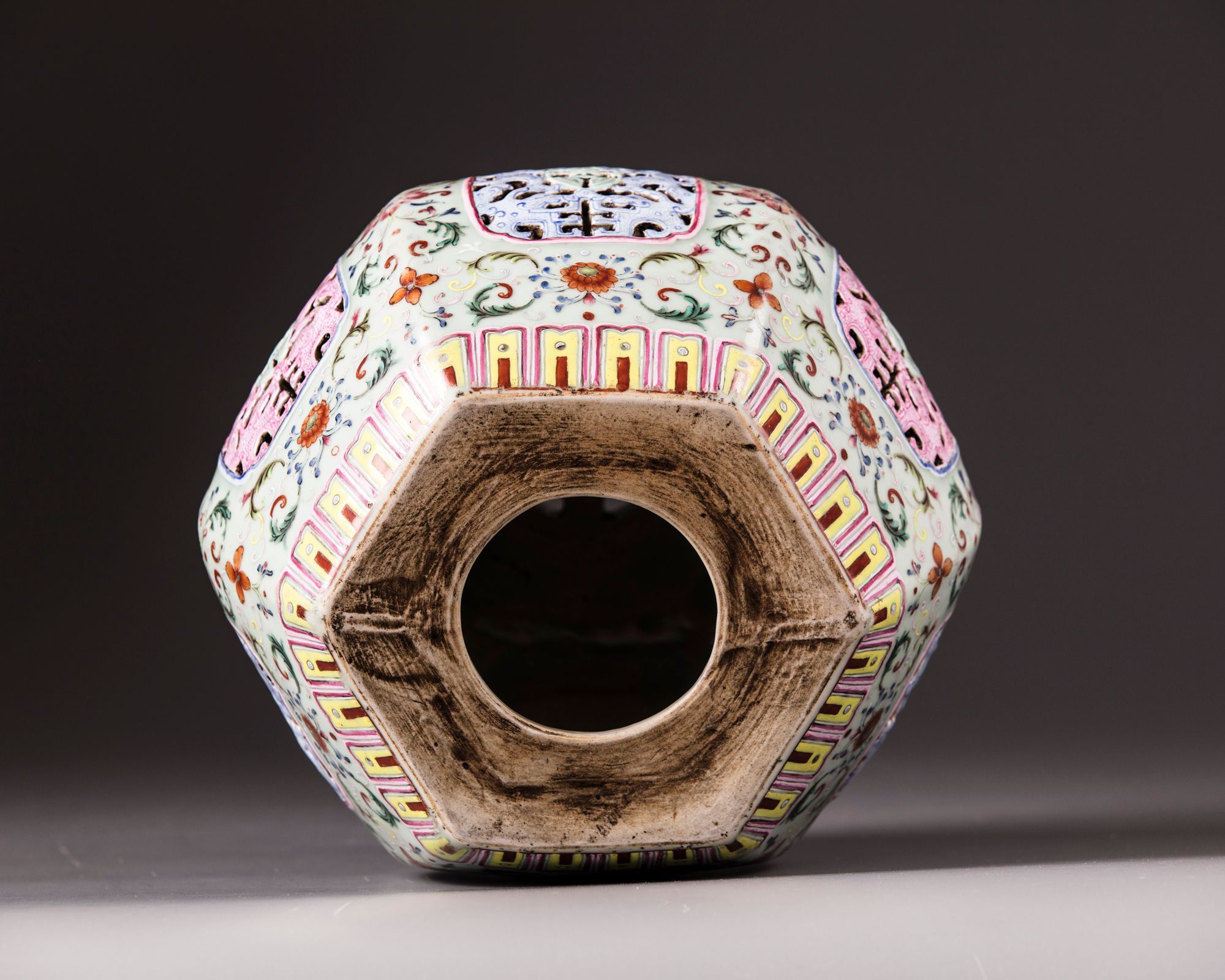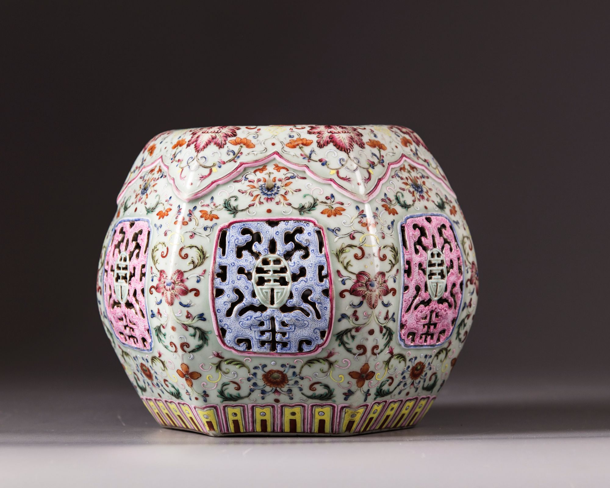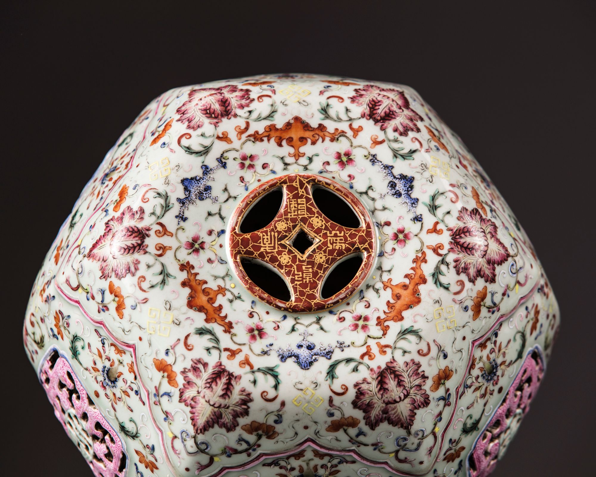 The celadon-ground pillow is decorated to each side with an openwork shou symbol surrounded by two openwork dragons with alternating colors either pink or blue, further painted with lotus flowers and foliage. The top is decorated with three iron-red bats, three small blue bats, flowers and foliage, all enclosing the rim,with Chinese character, the base with upright panels.