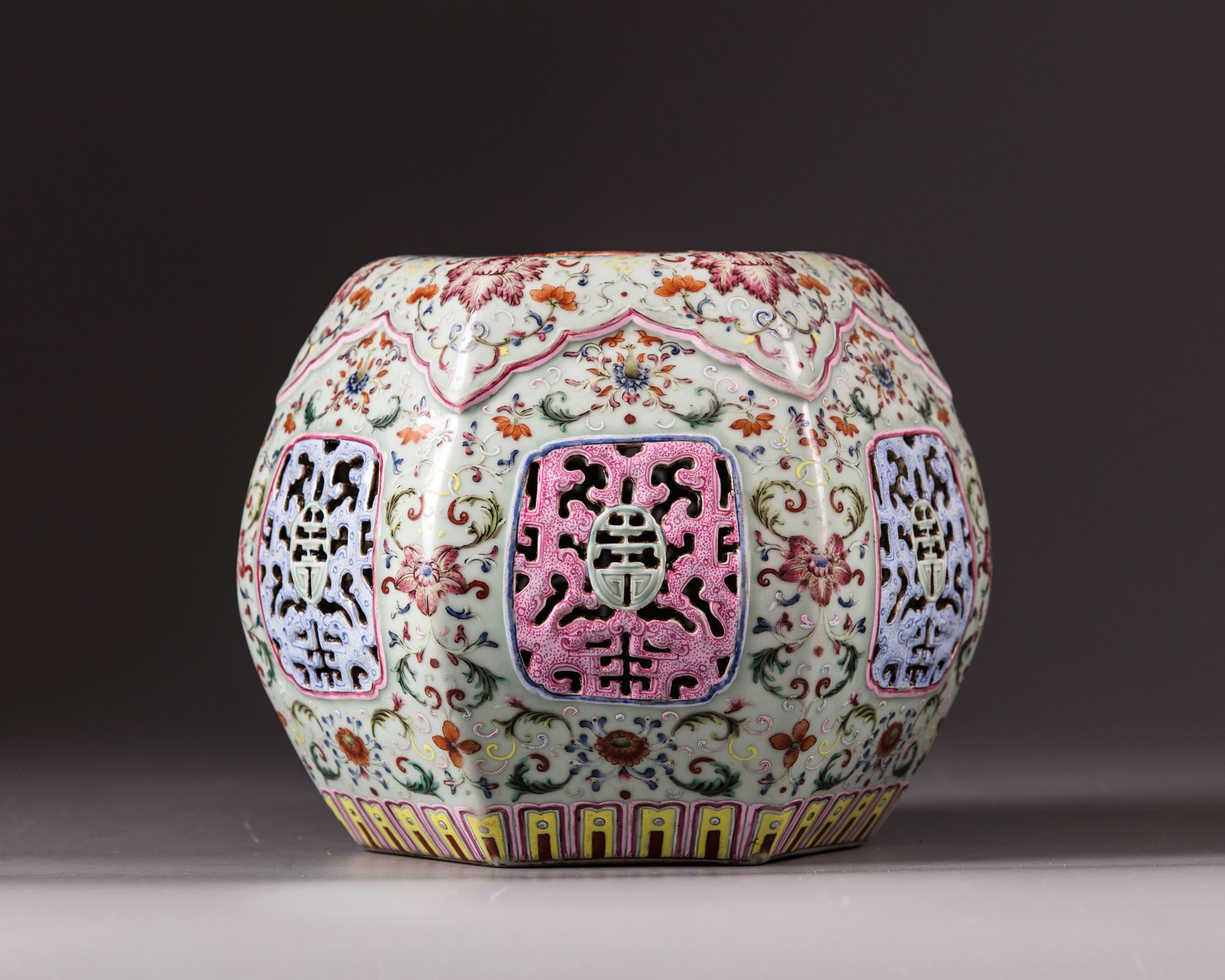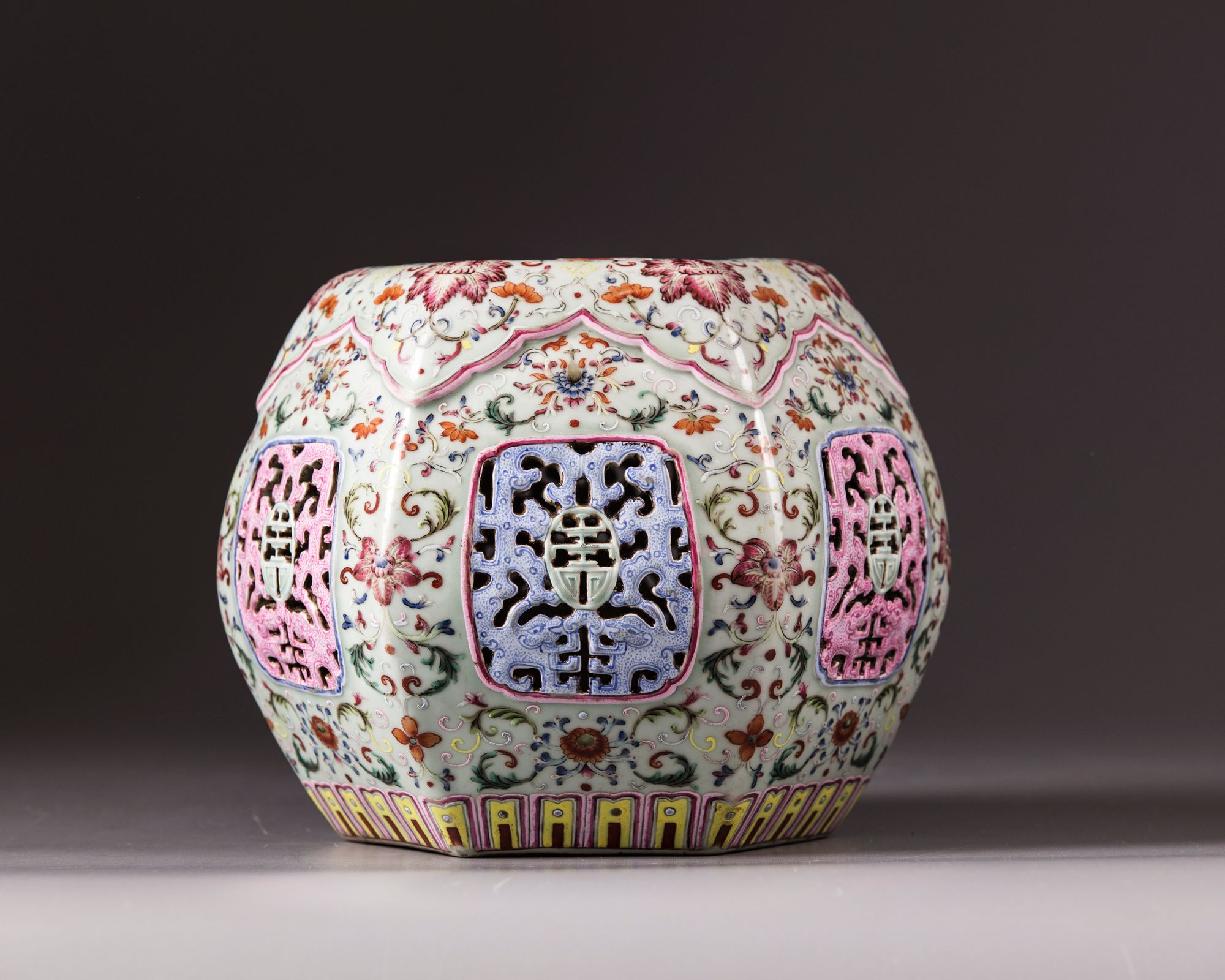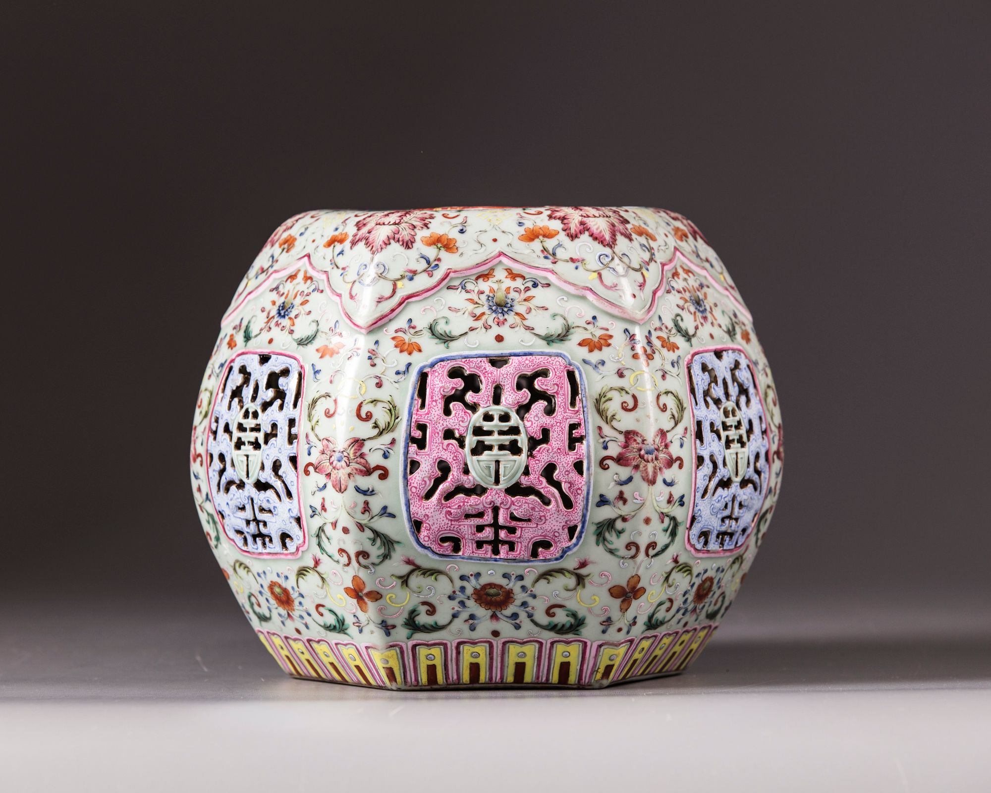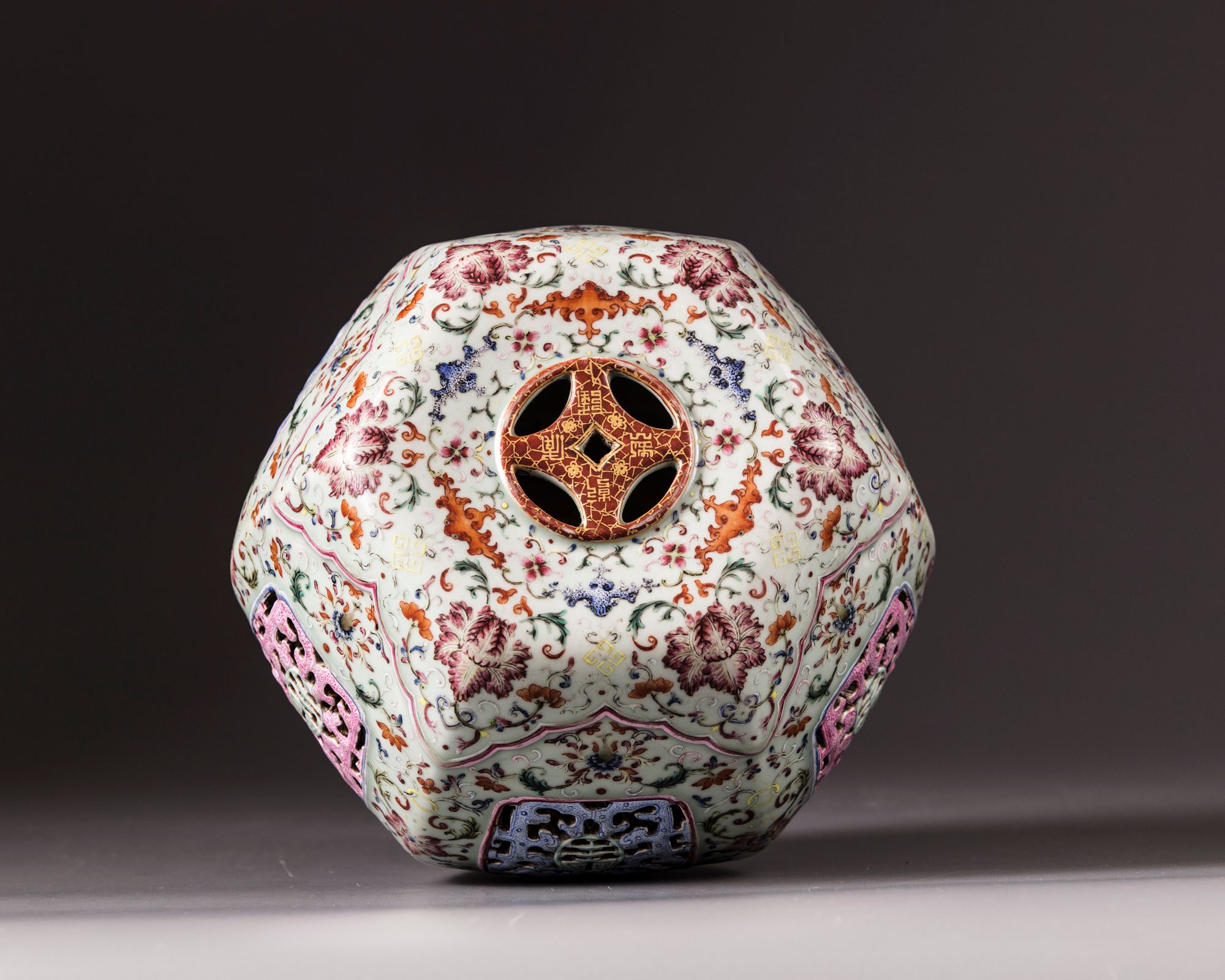 The celadon-ground pillow is decorated to each side with an openwork shou symbol surrounded by two openwork dragons with alternating colors either pink or blue, further painted with lotus flowers and foliage. The top is decorated with three iron-red bats, three small blue bats, flowers and foliage, all enclosing the rim,with Chinese character, the base with upright panels.