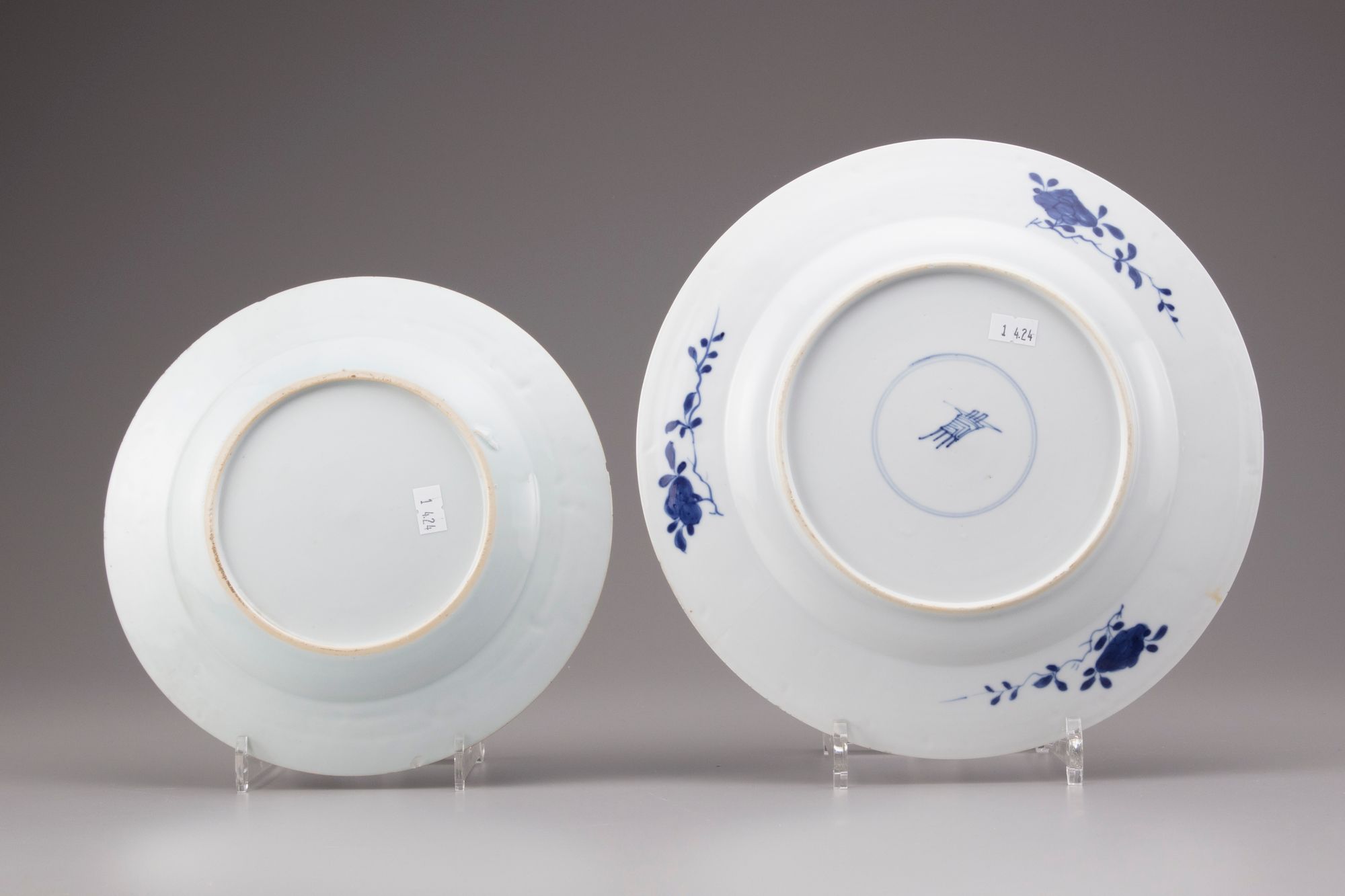 Decorated in underglaze blue with a vase with flowers to the center, one with a border with lappet the other with flowers growing from rocks to the rim.