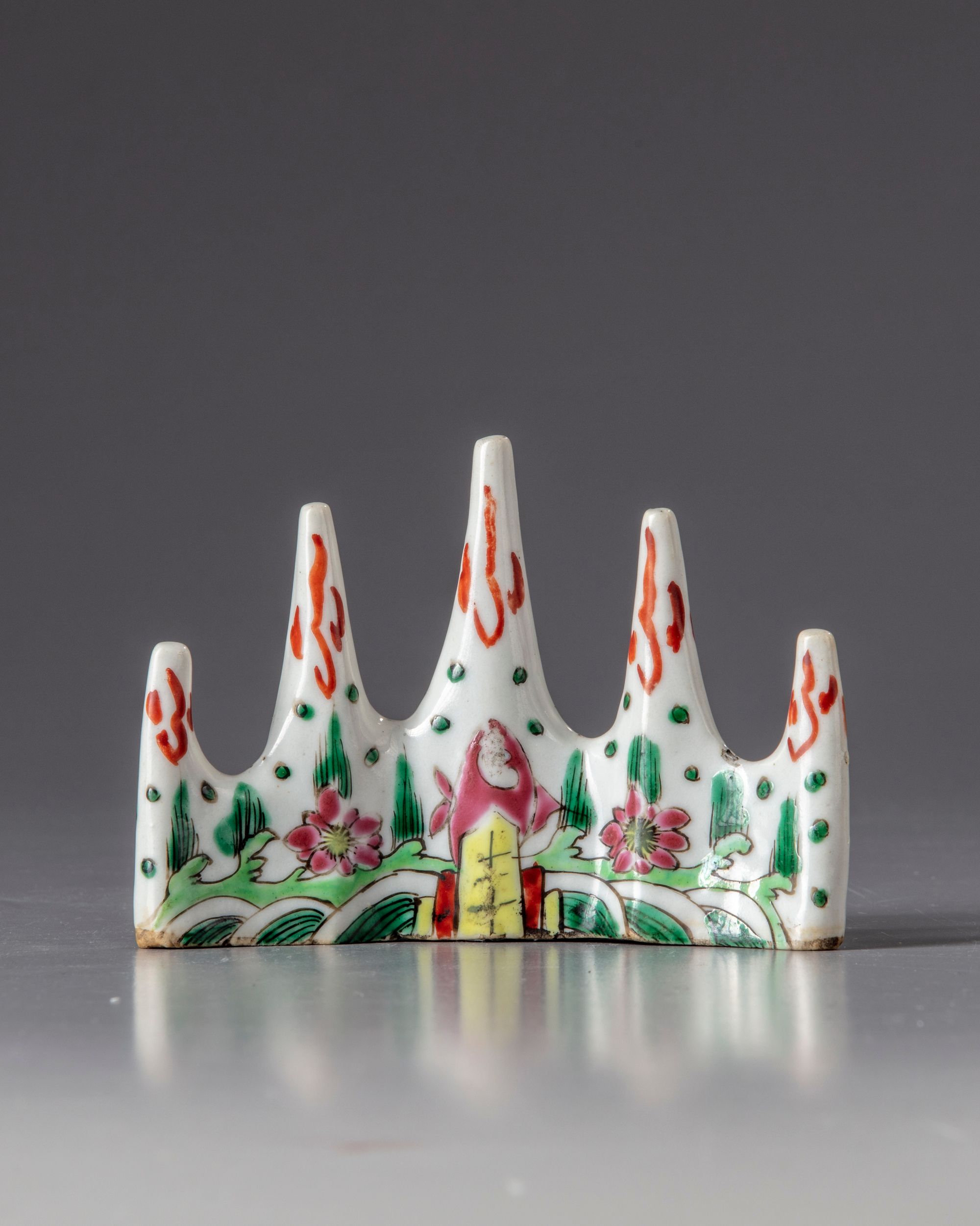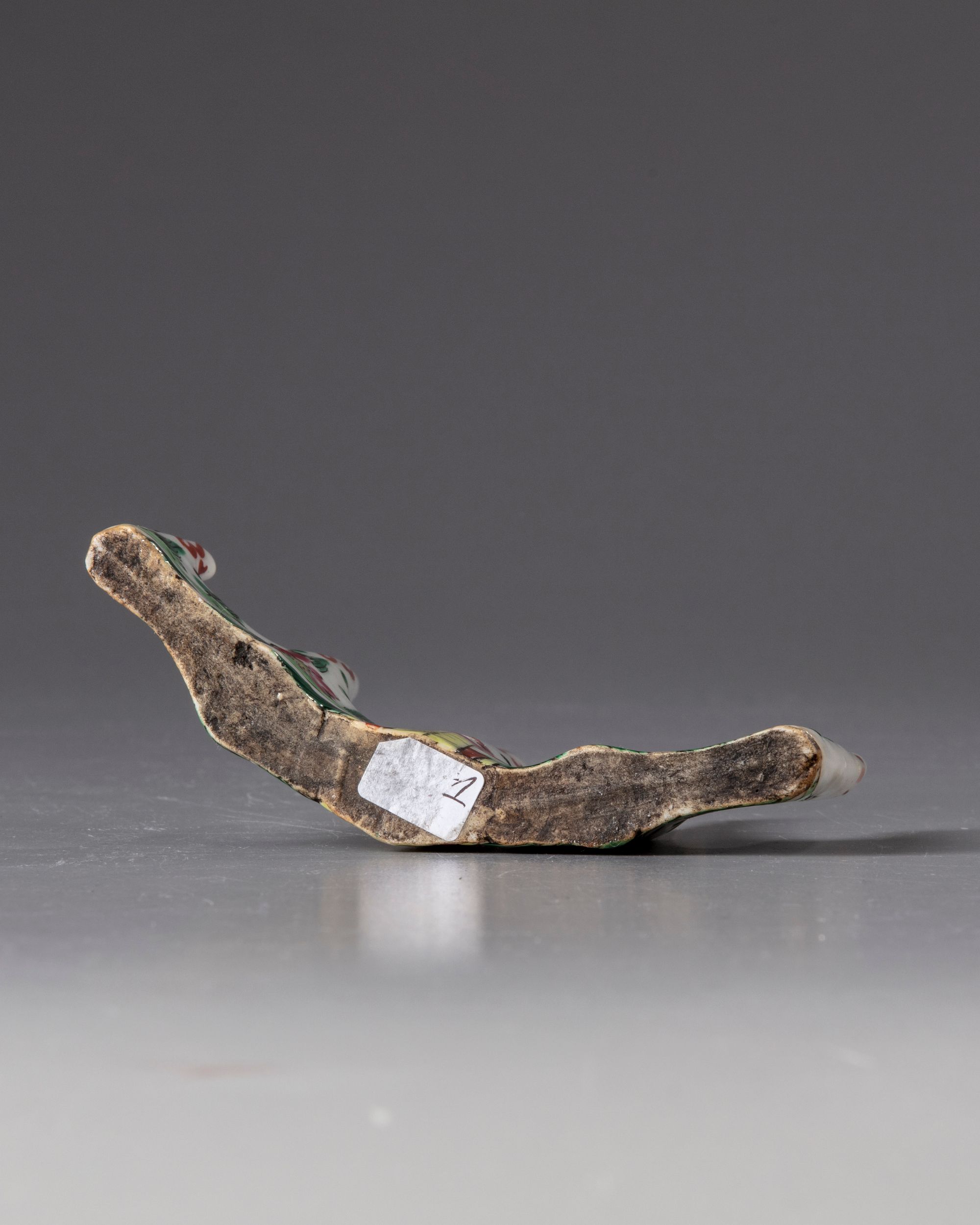 The brush rest is decorated in famille rose enamels with a fish in seawaves amongst flowers.