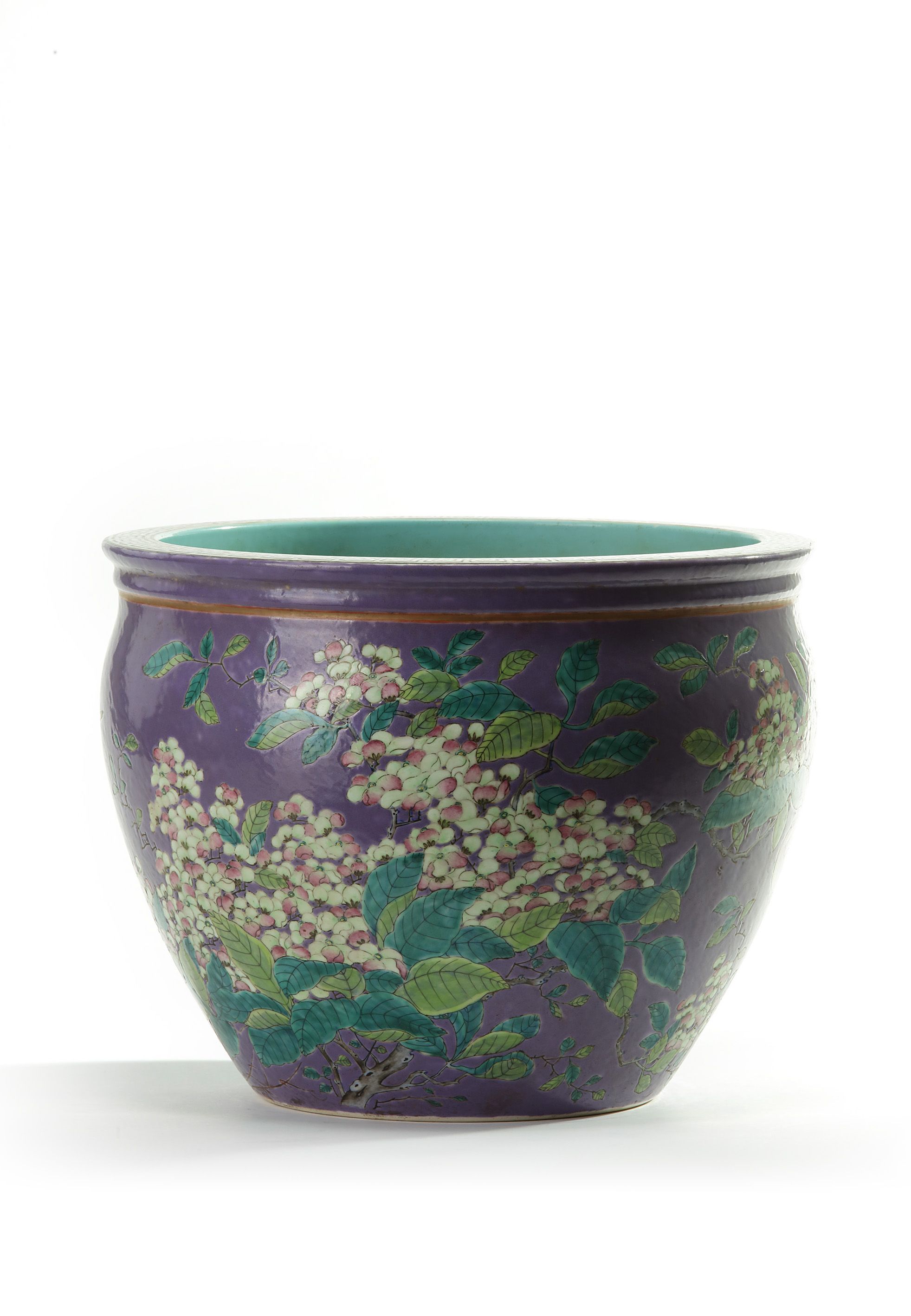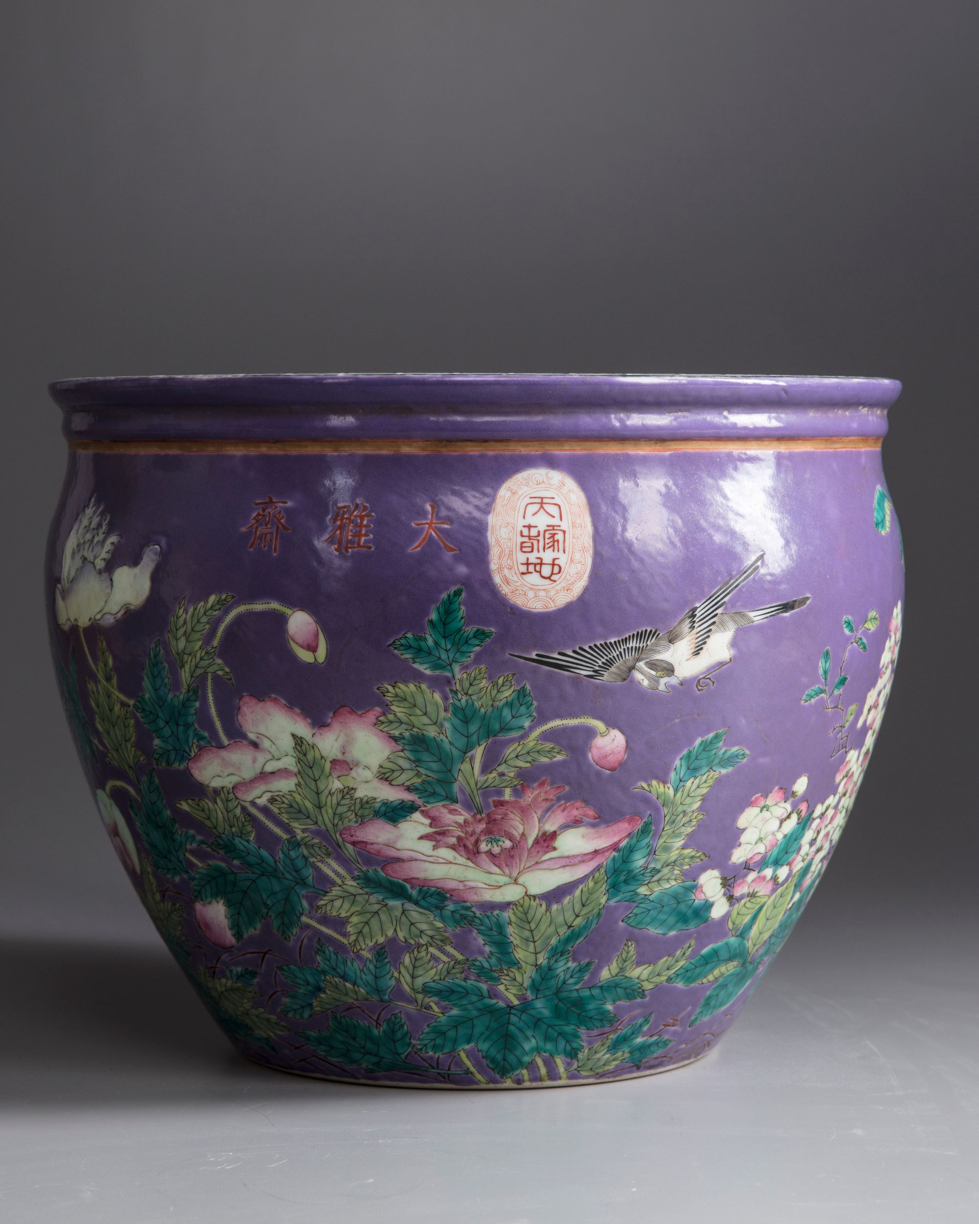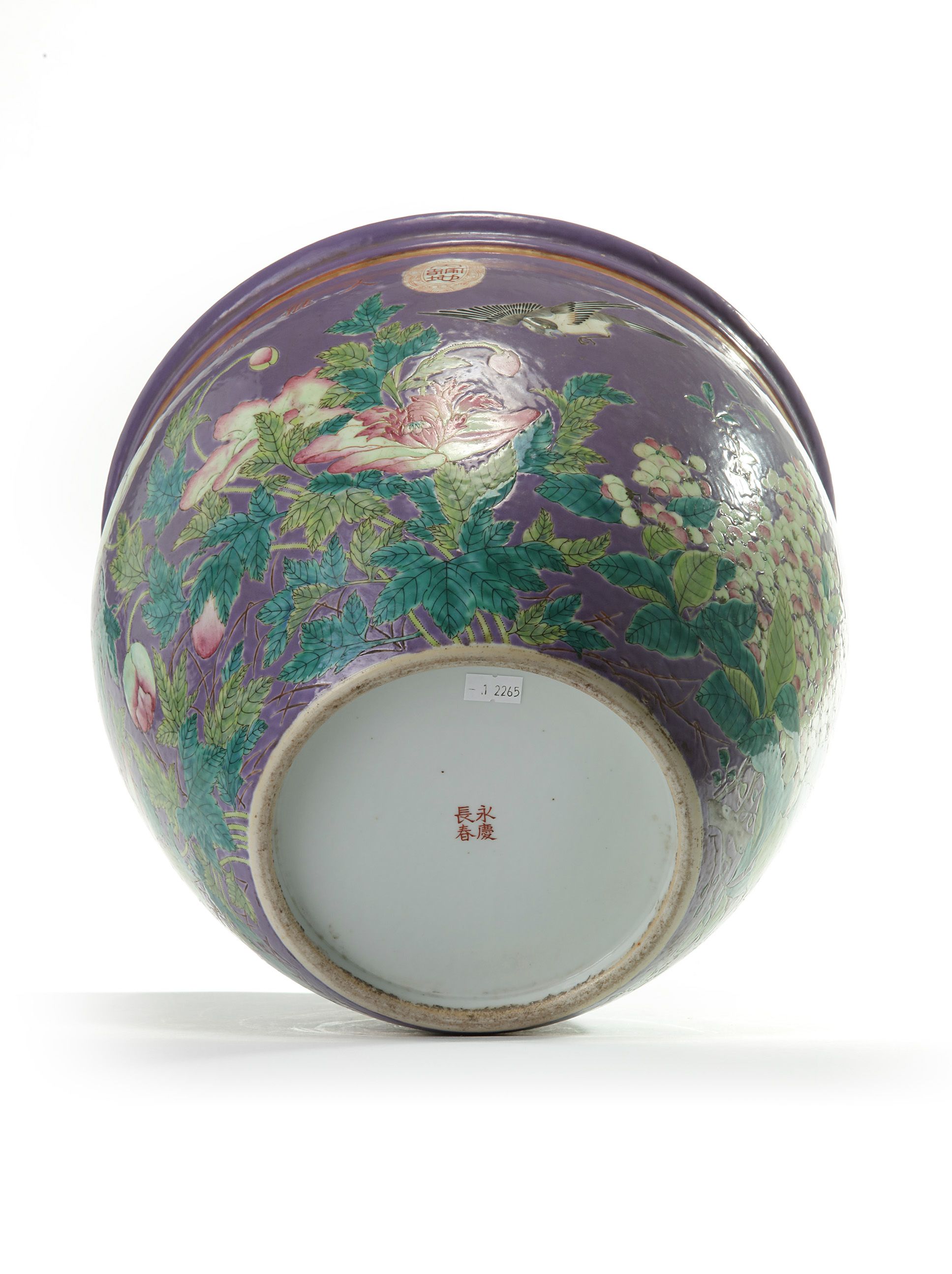 The jardinere is decorated on the exterior with leafy branches bearing large blossoms including, peonies and hydrangea, all reserved on a vivid purple ground. Just below the rim is inscribed with the mark 'Dayazhai', beside an iron-red zhuanshu seal mark reading 'Tiandi yijiachun' surrounded by confronting dragons chasing a flaming pearl. The interior is covered in a turquoise glaze, and the base with a four-character 'yongqing changchun' mark in iron red.