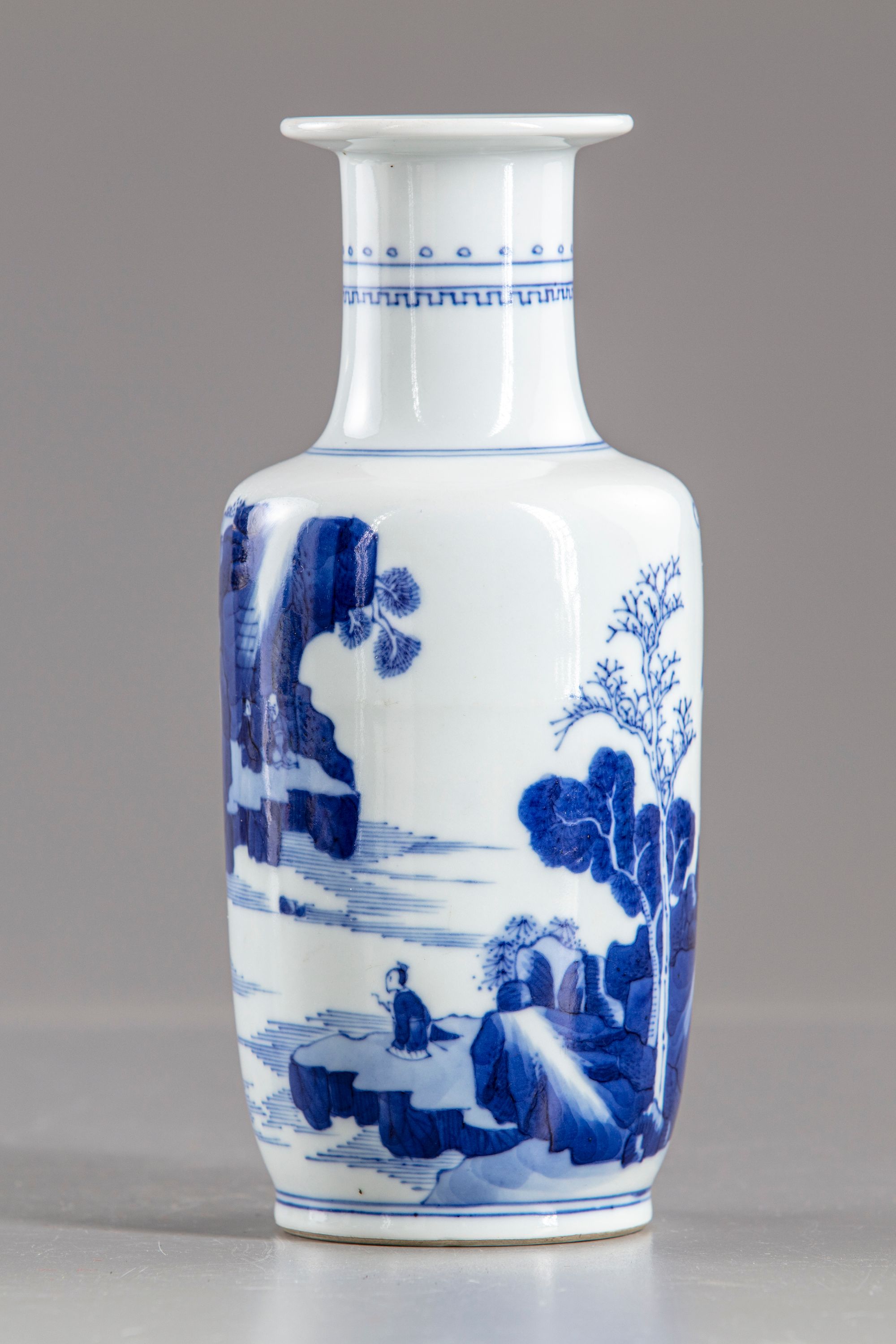 The vase is decorated with a continuous scene of various figures, fisherman, boats and pagoda in a rocky river landscape .The neck is encircled by a band of circles and a key fret border. The base with a double circle.