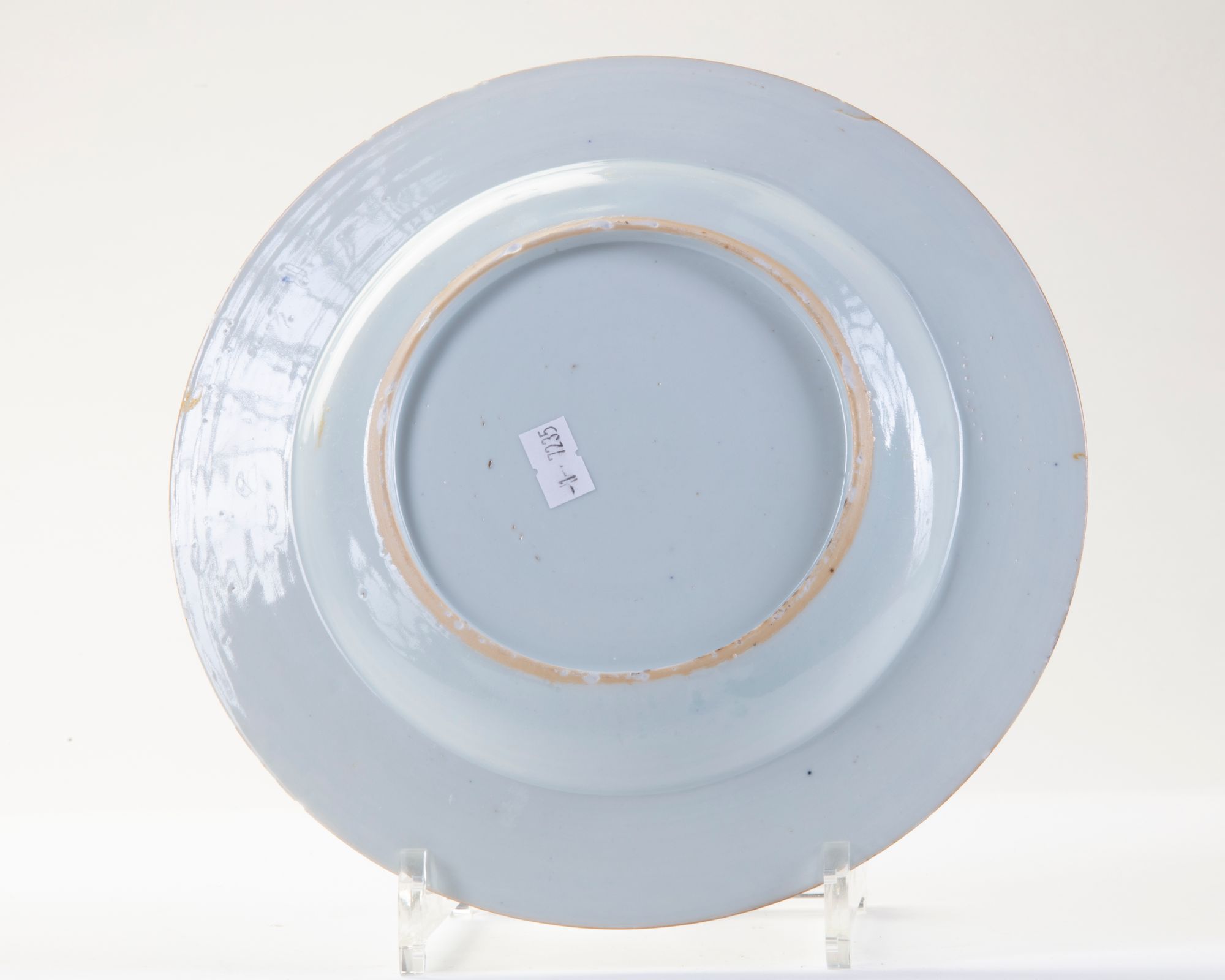 Decorated to the centre with blue and white floral sprays, surrounded by a band of famille verte flower sprays and cartouches containing shrimps. Furthermore a blue and white band of geometric pattern to the rim.