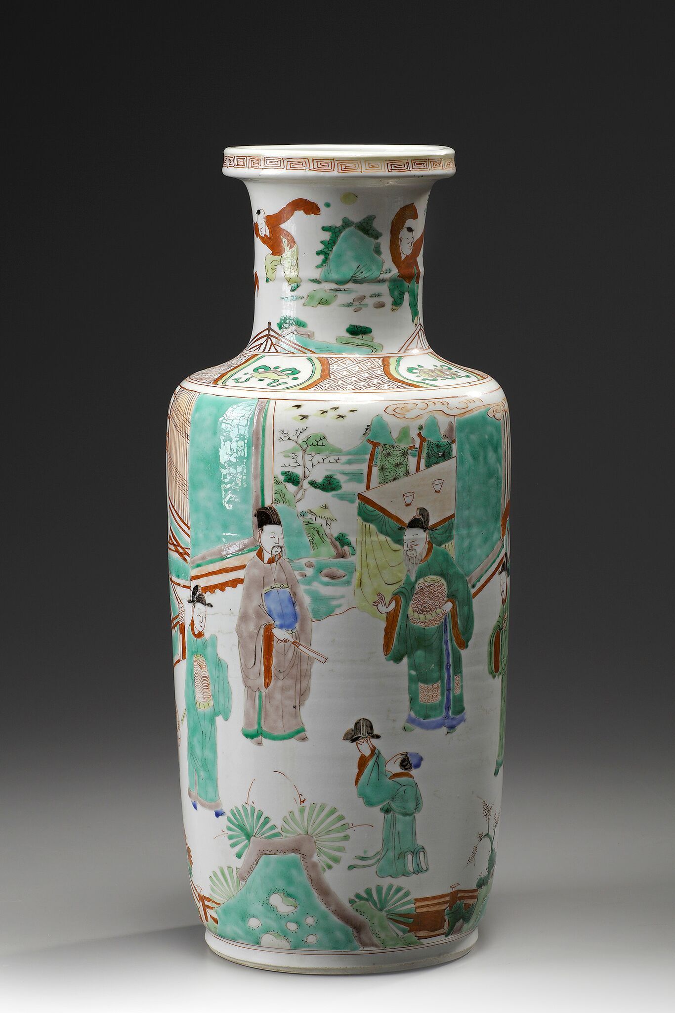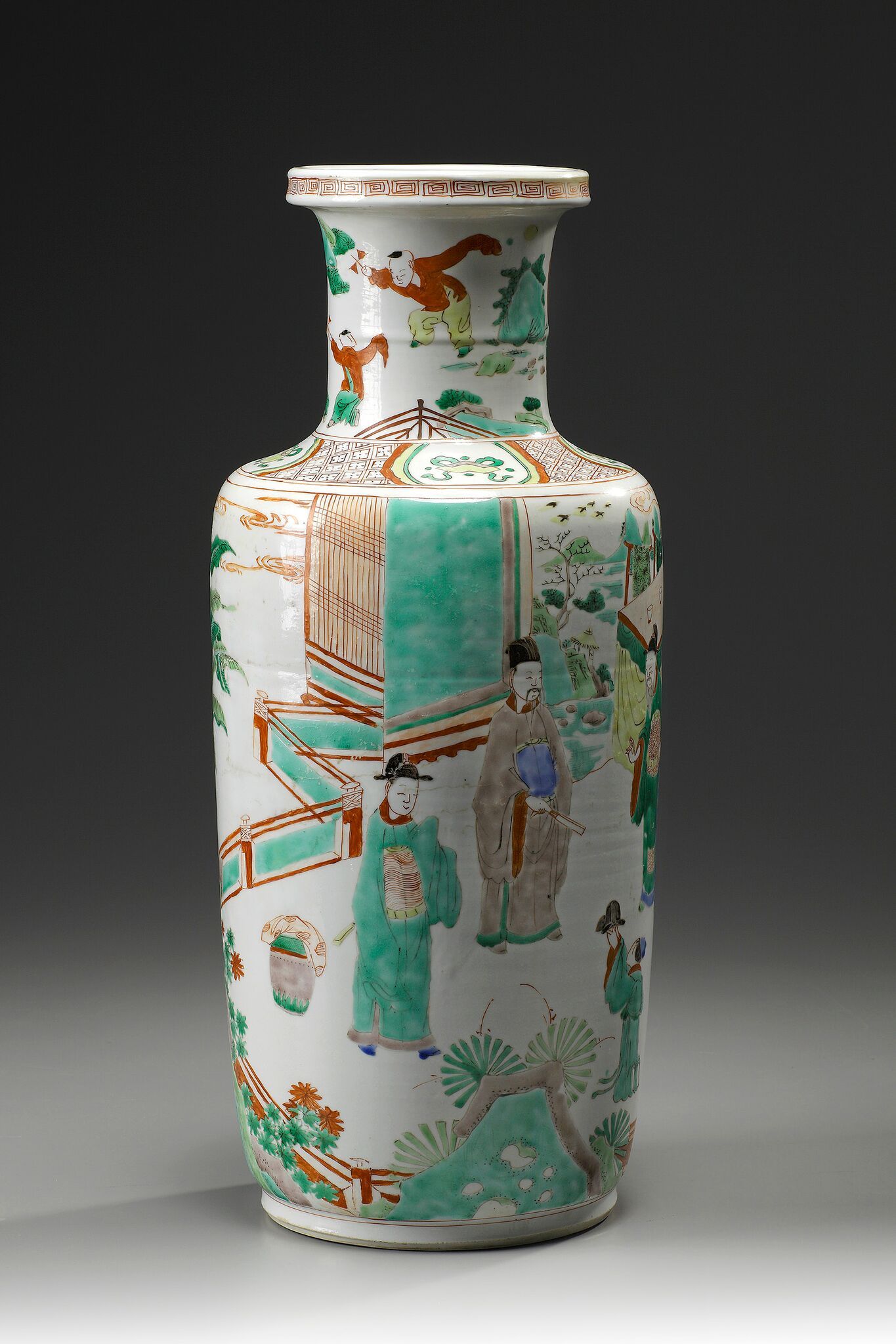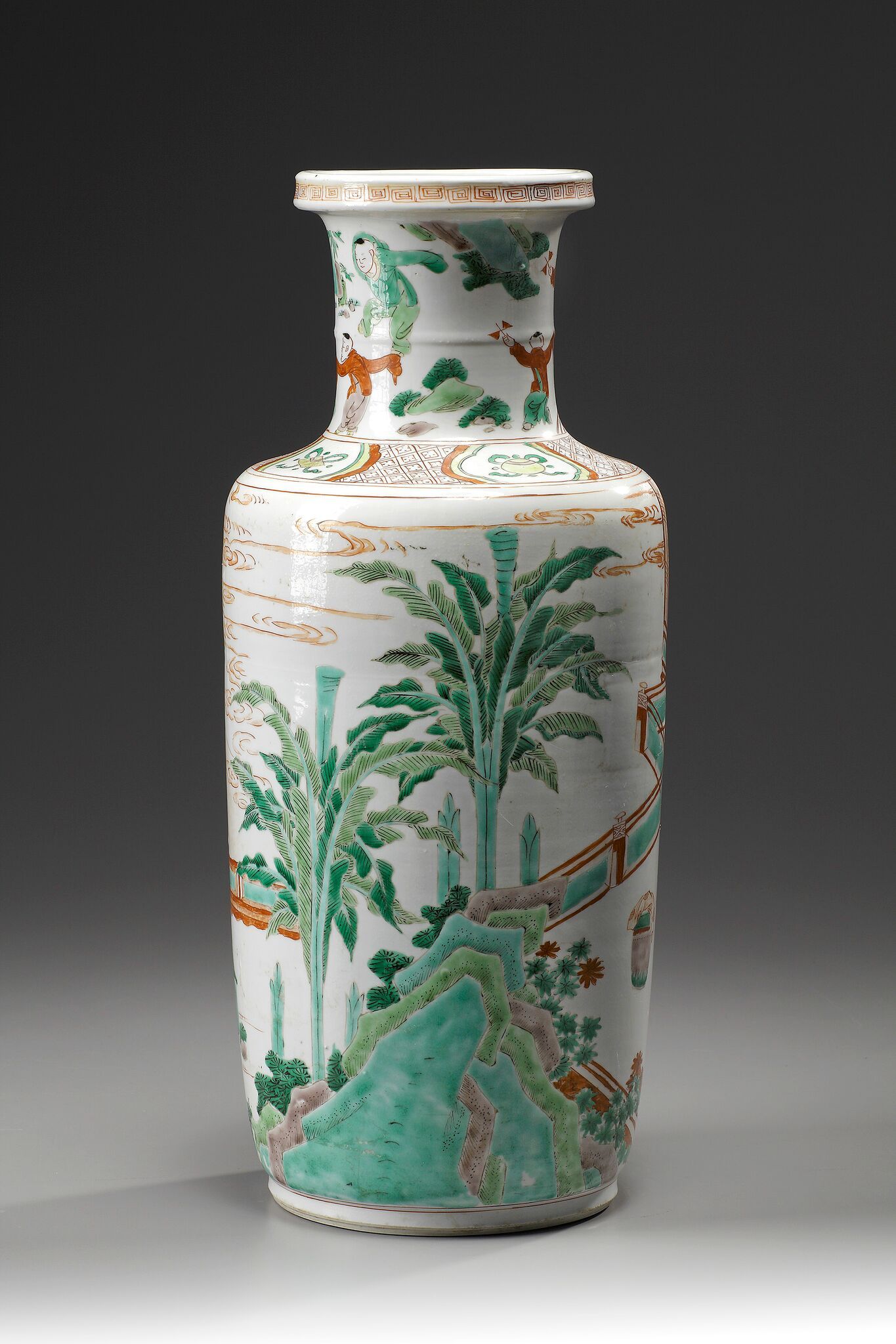 The body is with a continuous scene of three dignitaries and a servant standing on a terrace with rocks and plantain, all below a diaper border on the shoulder and a garden scene with boys at the neck. Underglaze blue double circle to the base.