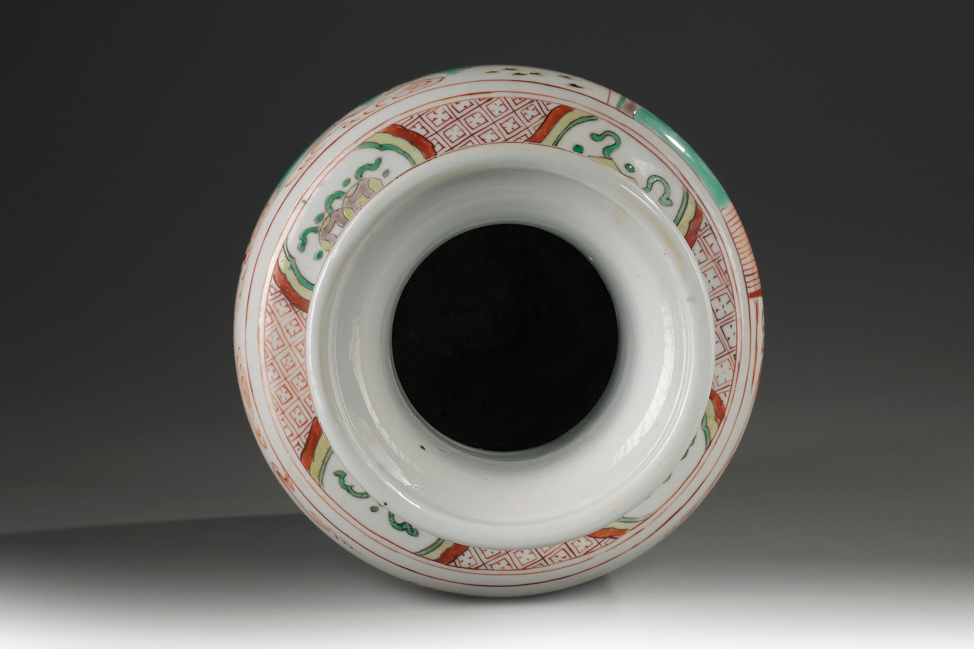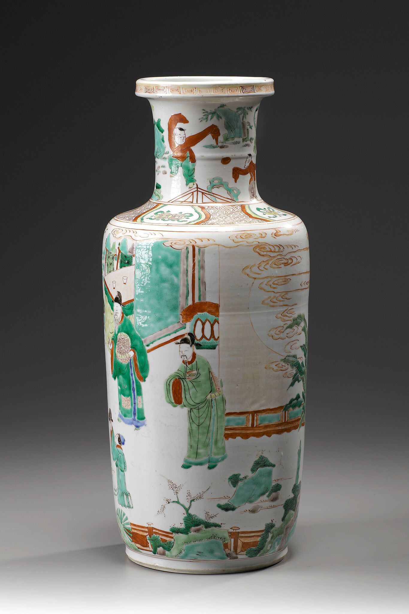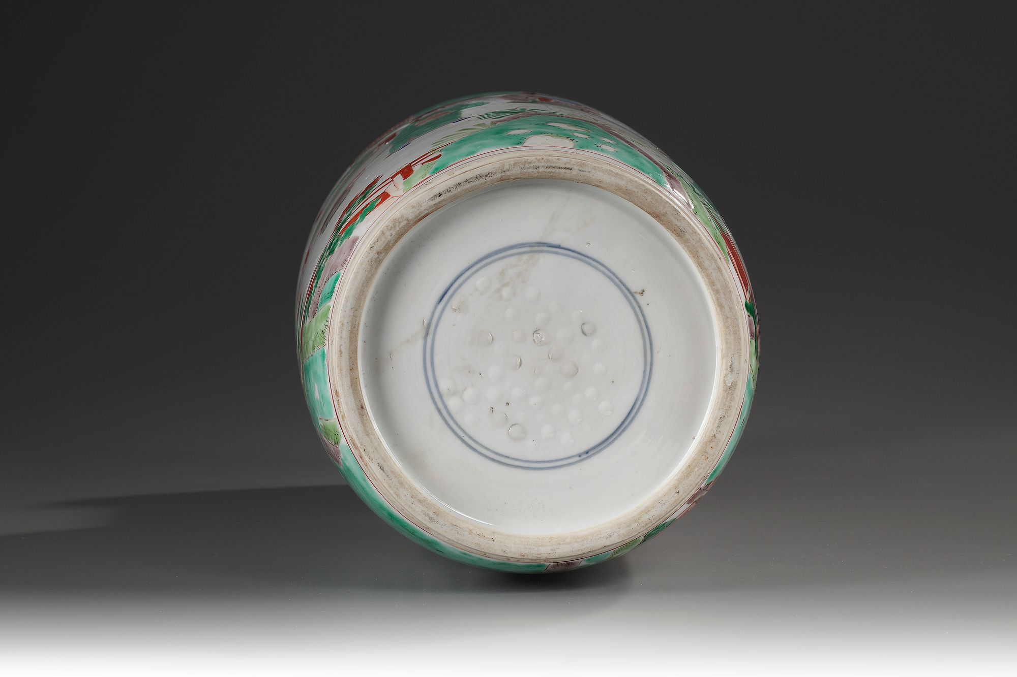 The body is with a continuous scene of three dignitaries and a servant standing on a terrace with rocks and plantain, all below a diaper border on the shoulder and a garden scene with boys at the neck. Underglaze blue double circle to the base.