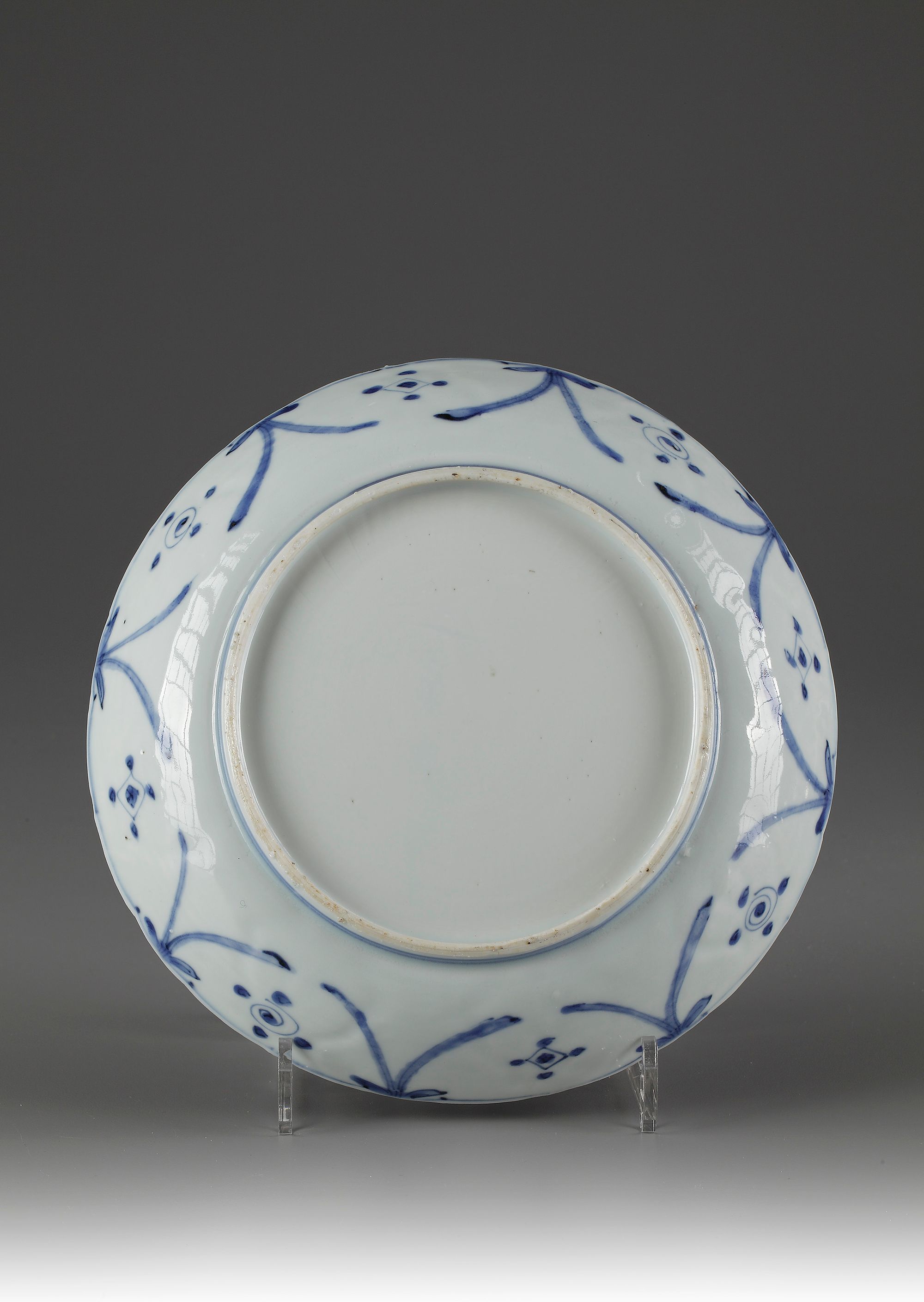 The centre of the dish is decorated with two horses within a fenced garden. The panel is encircled by a band of pomegranates.