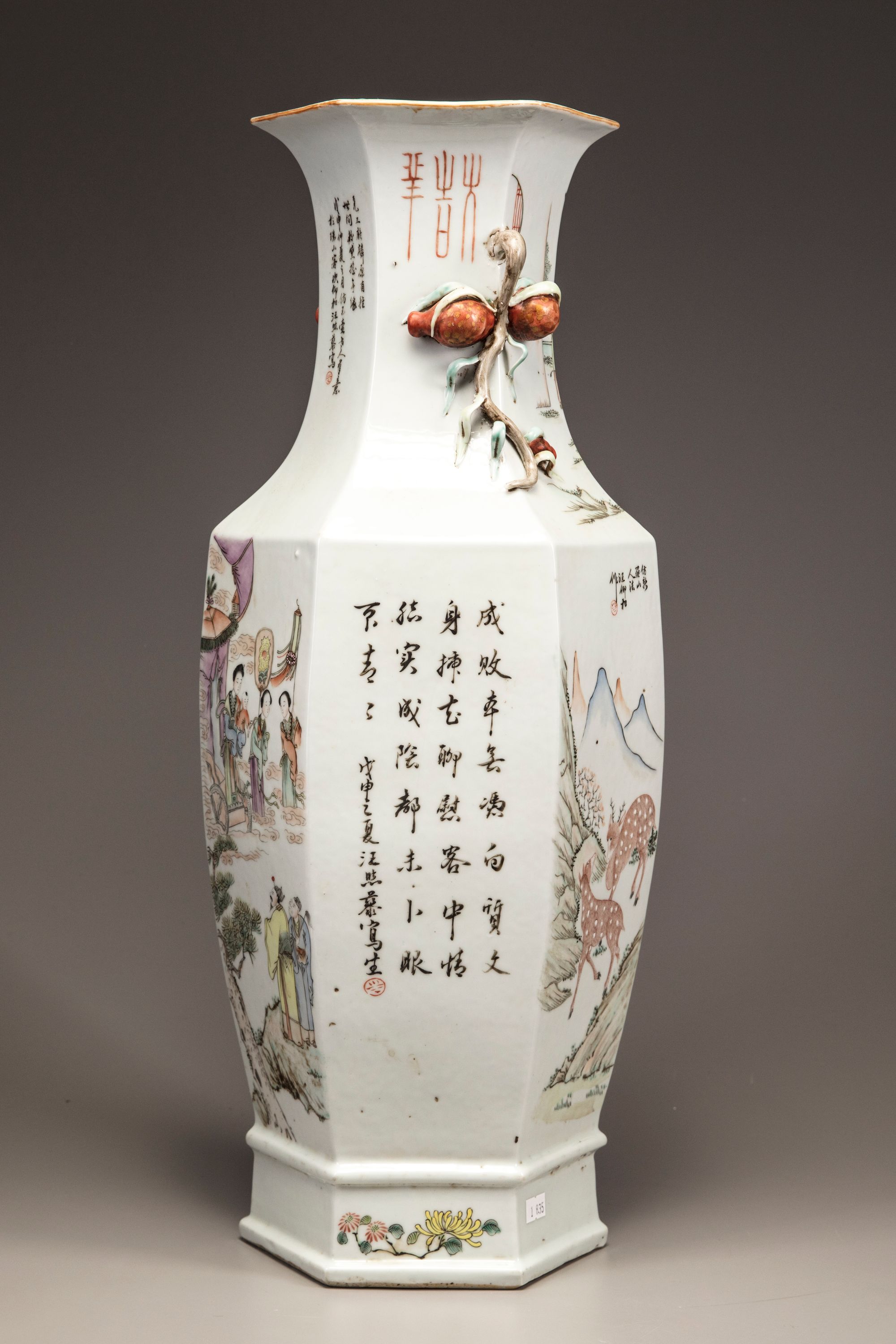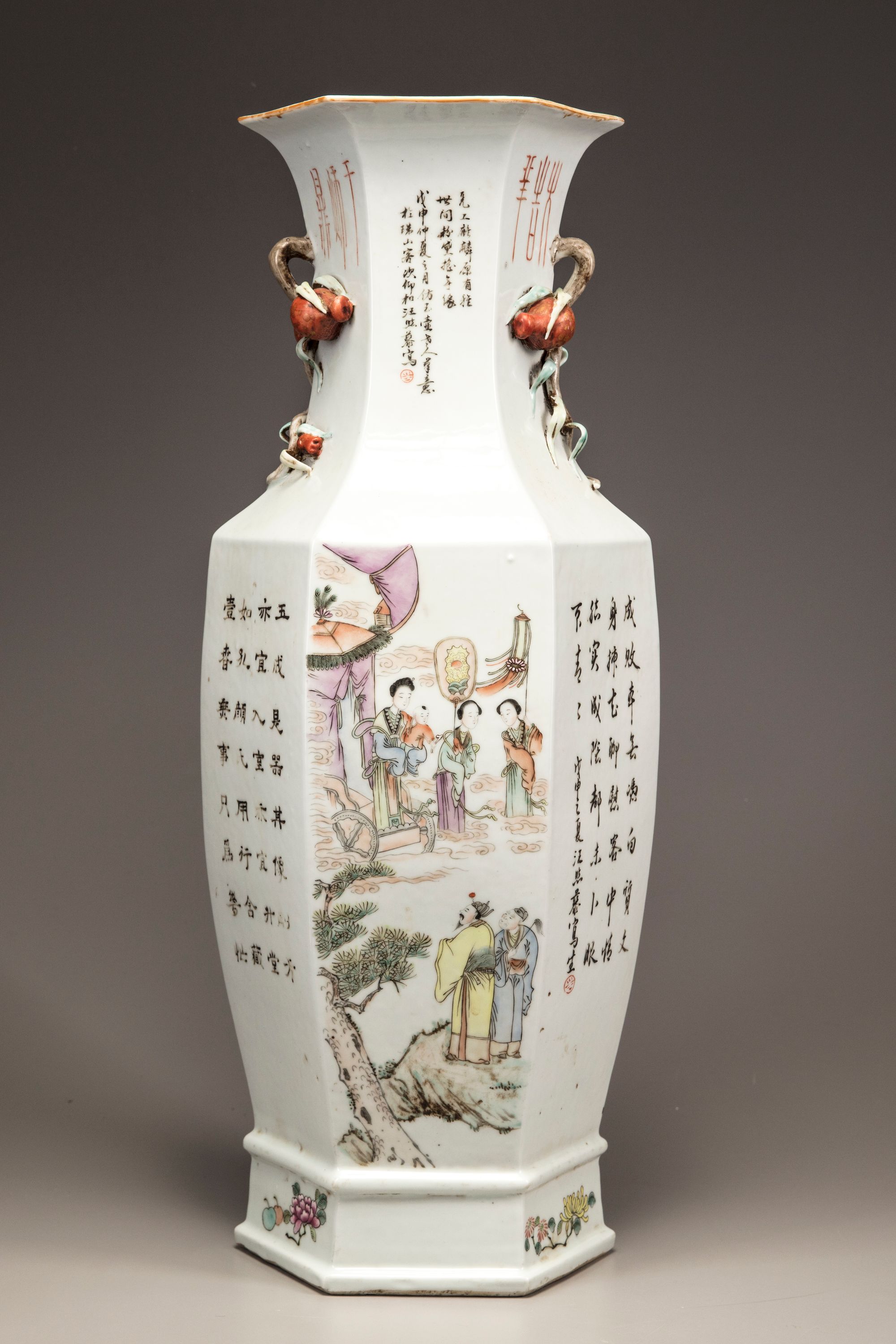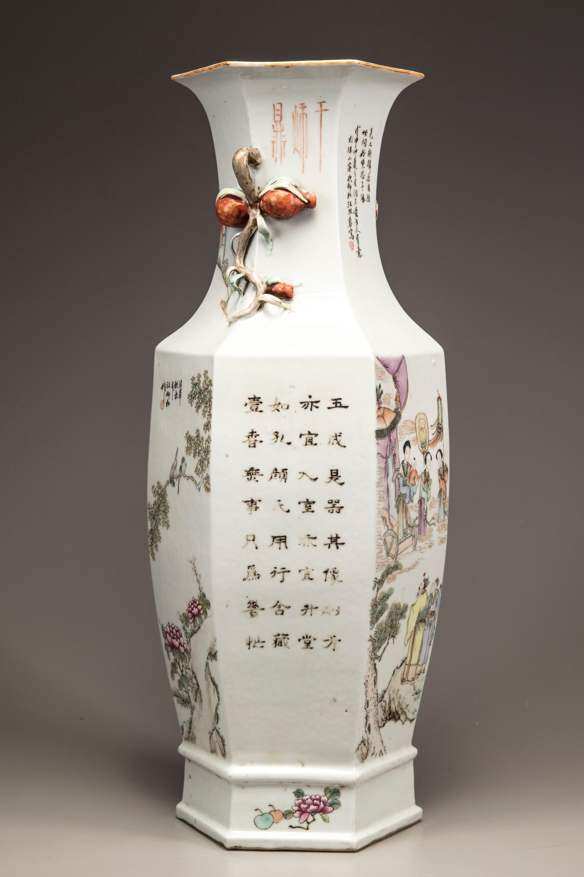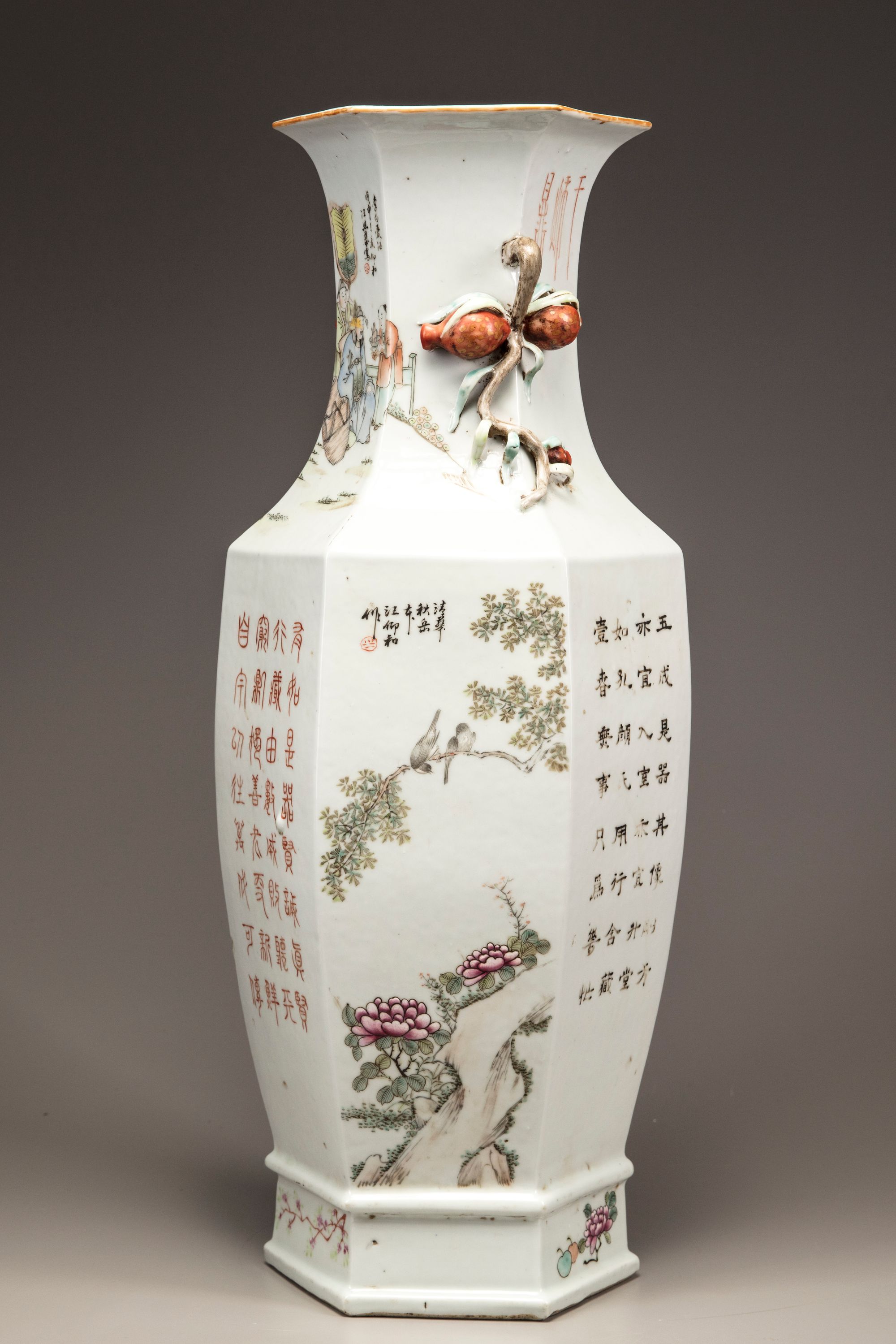 The vase is decorated to the neck with two pomegranate handles, with a scene of the poet Li Bai and an attendant interspersed with archaic script. The body is decorated with panels of birds and flowers, poetic inscriptions in regular and seal script, a scene of scholars and ladies, and a scene of deer, all above flower sprays to the foot. The interior is glazed turquoise.