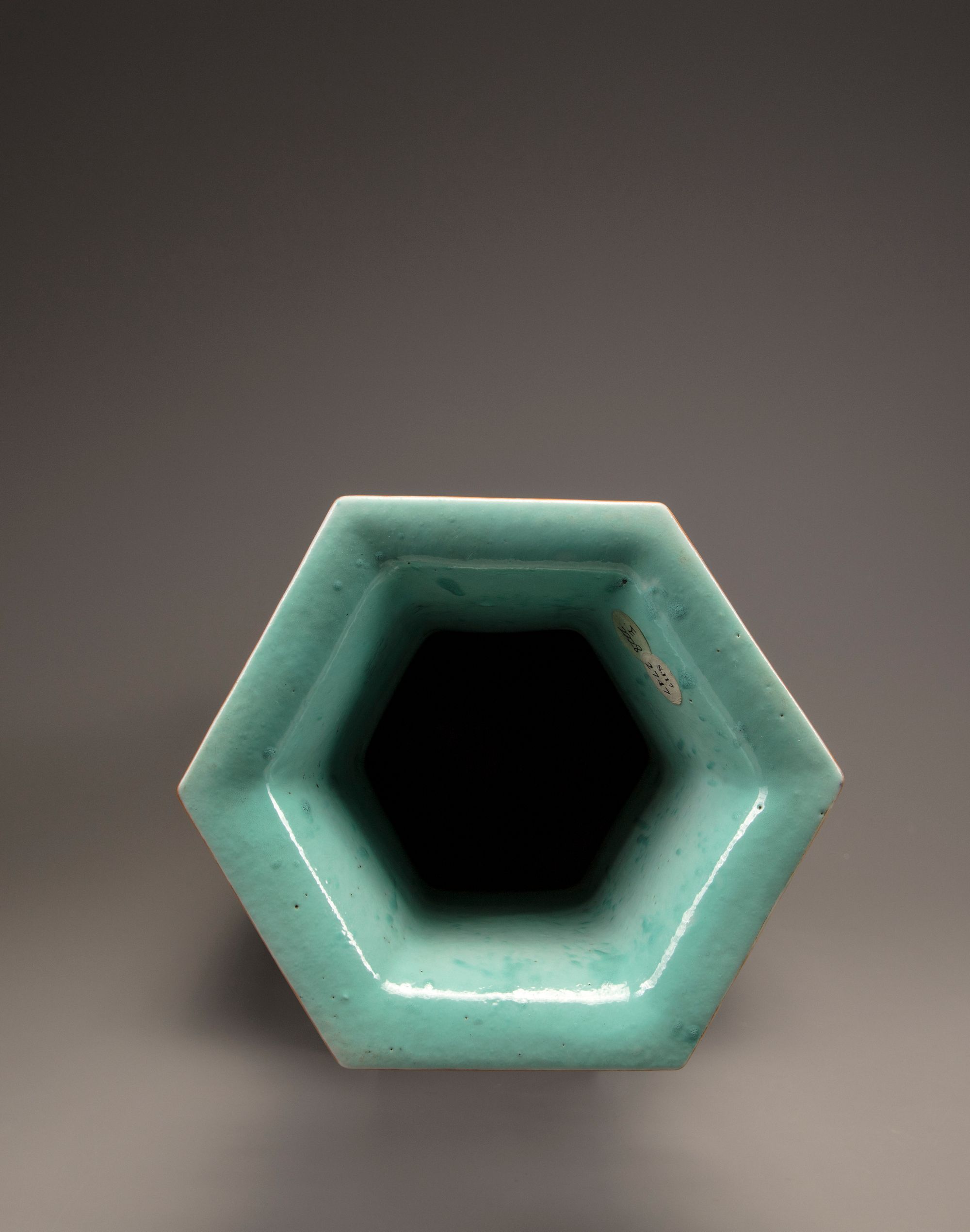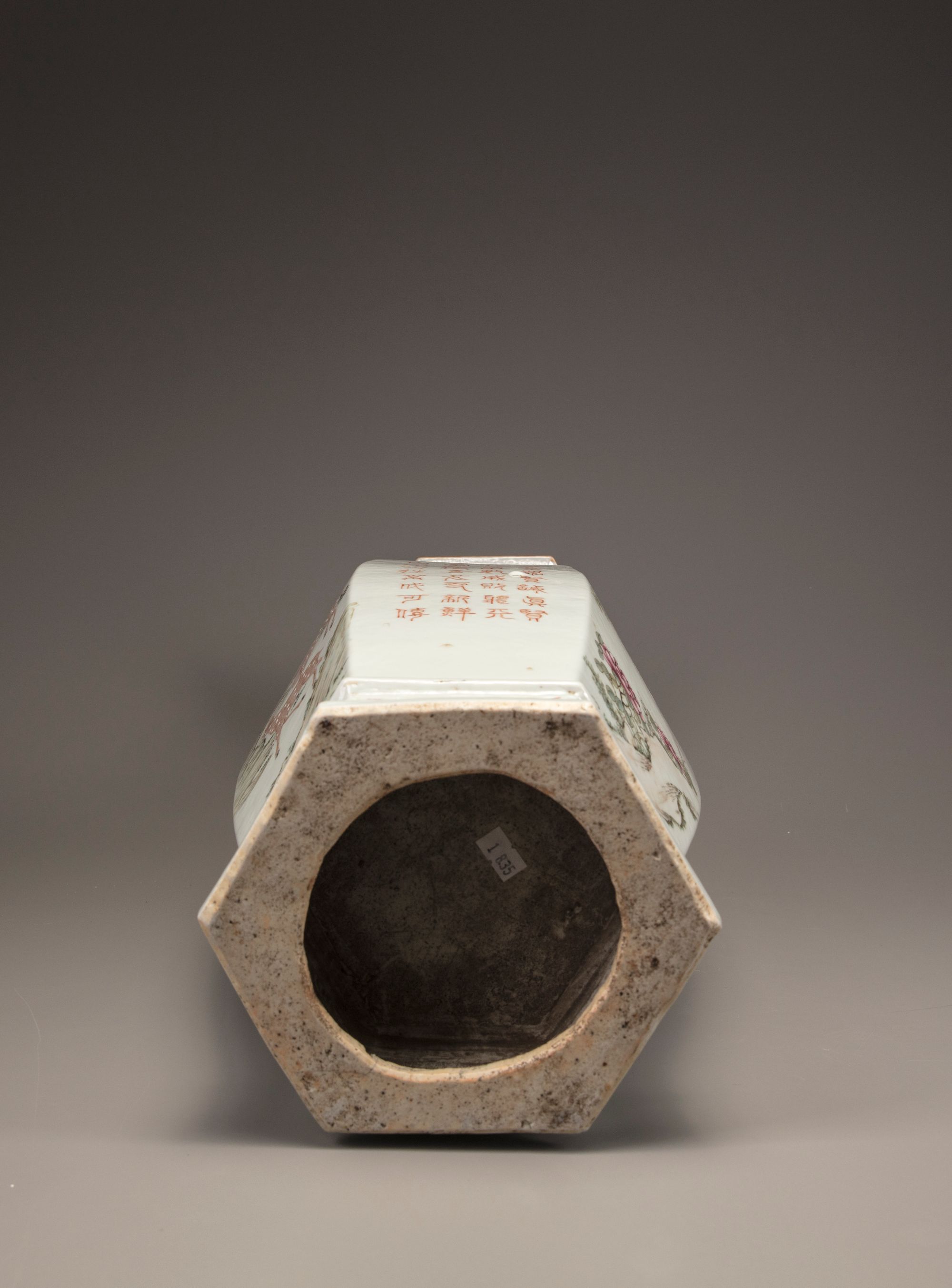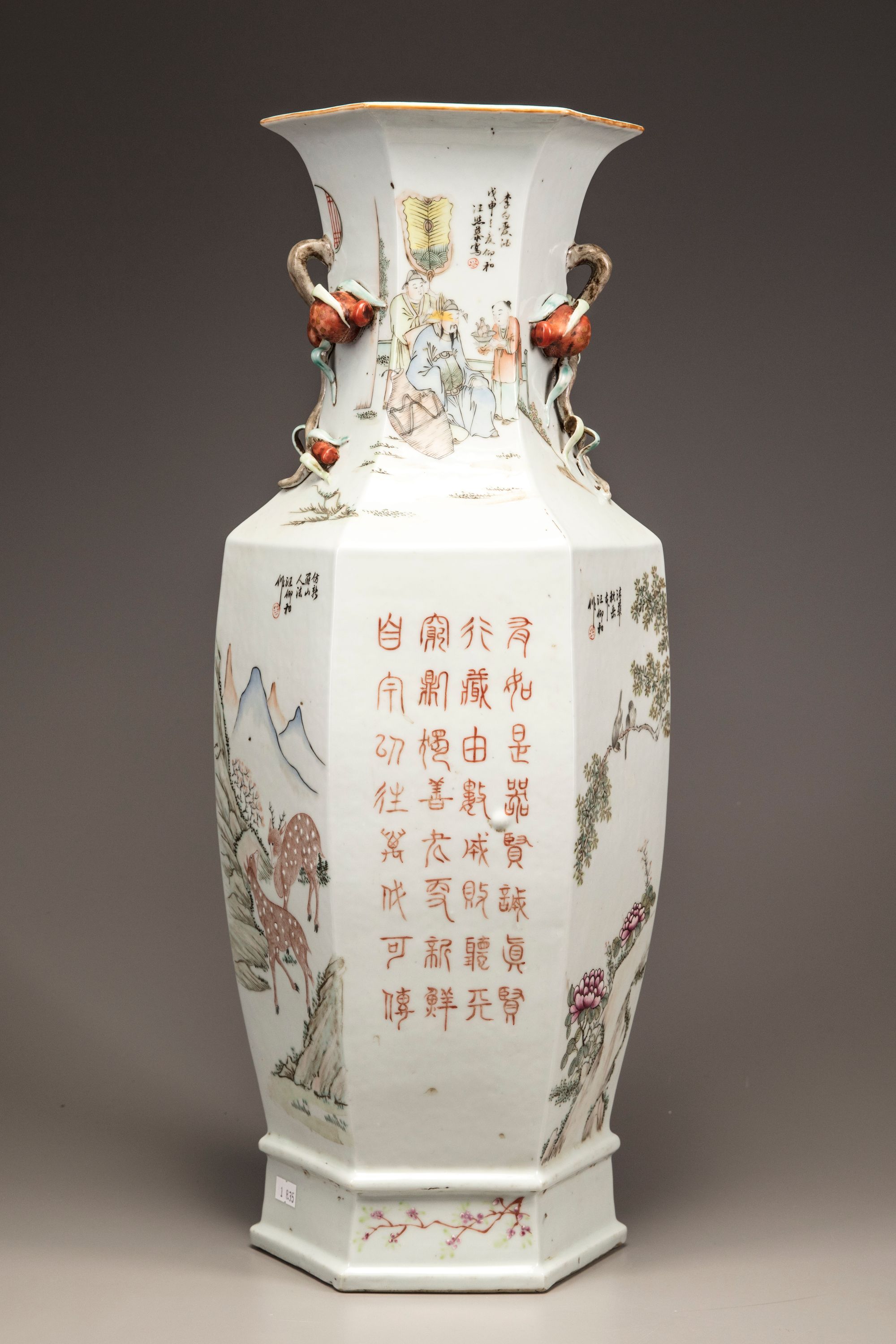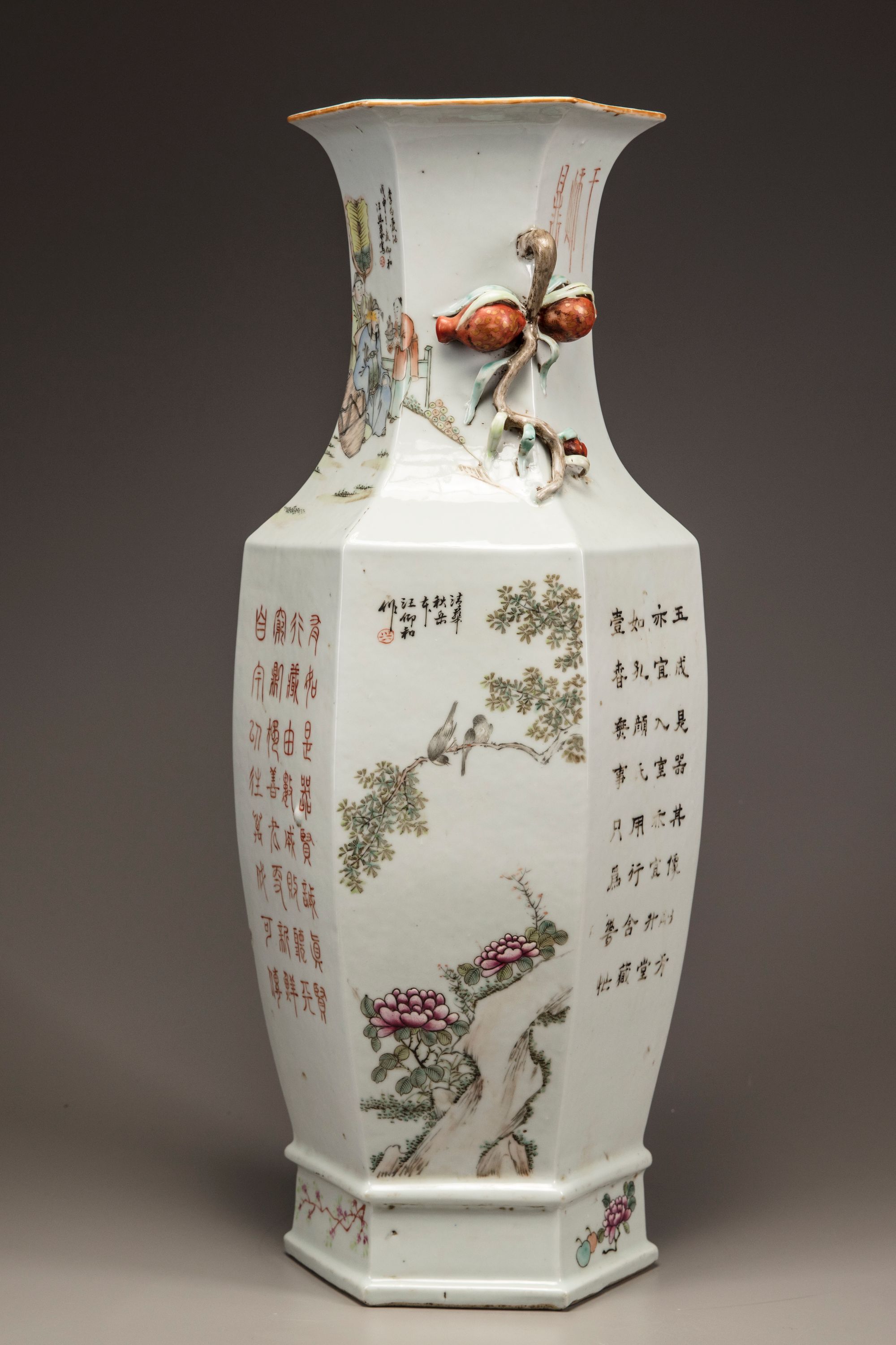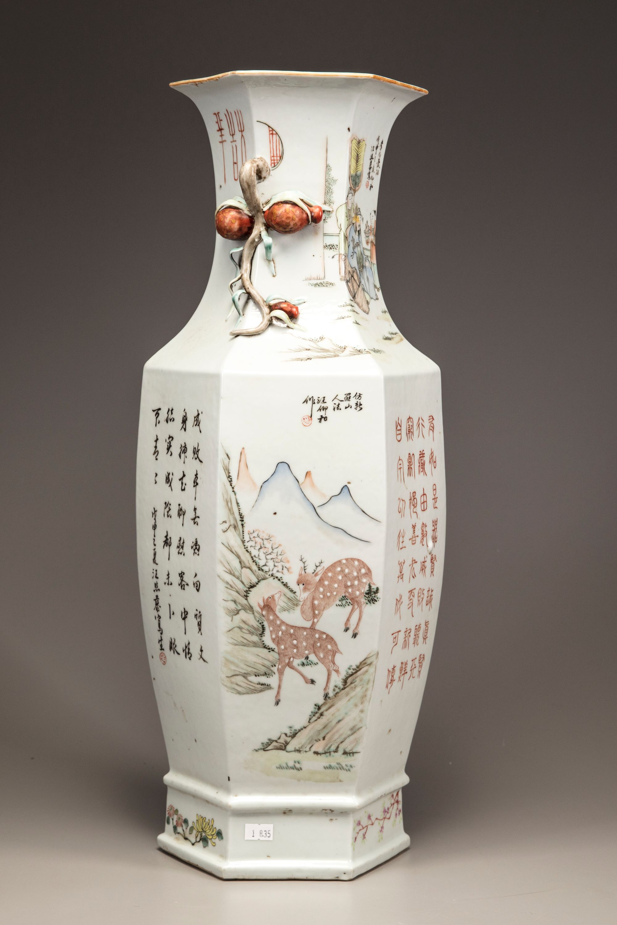 The vase is decorated to the neck with two pomegranate handles, with a scene of the poet Li Bai and an attendant interspersed with archaic script. The body is decorated with panels of birds and flowers, poetic inscriptions in regular and seal script, a scene of scholars and ladies, and a scene of deer, all above flower sprays to the foot. The interior is glazed turquoise.