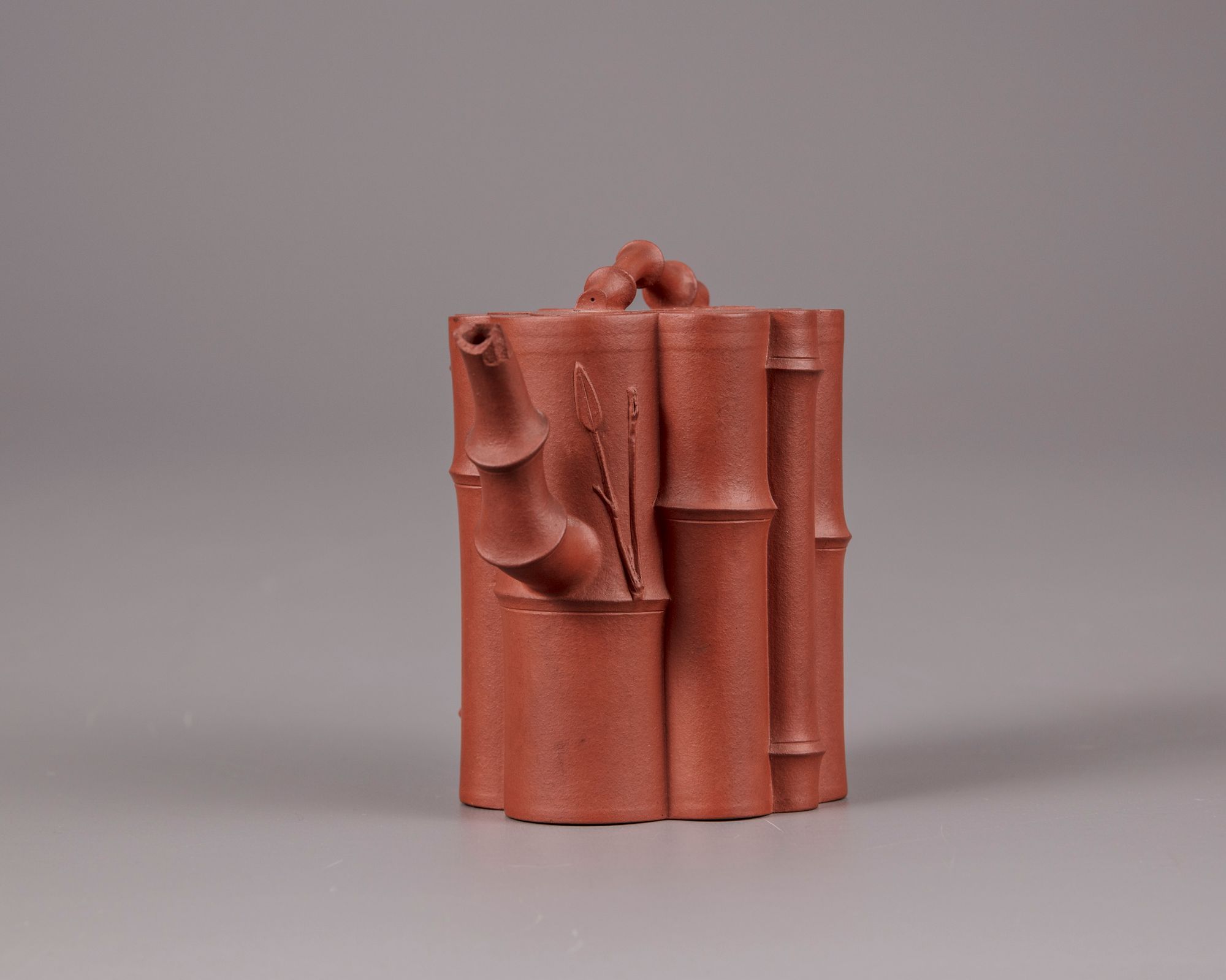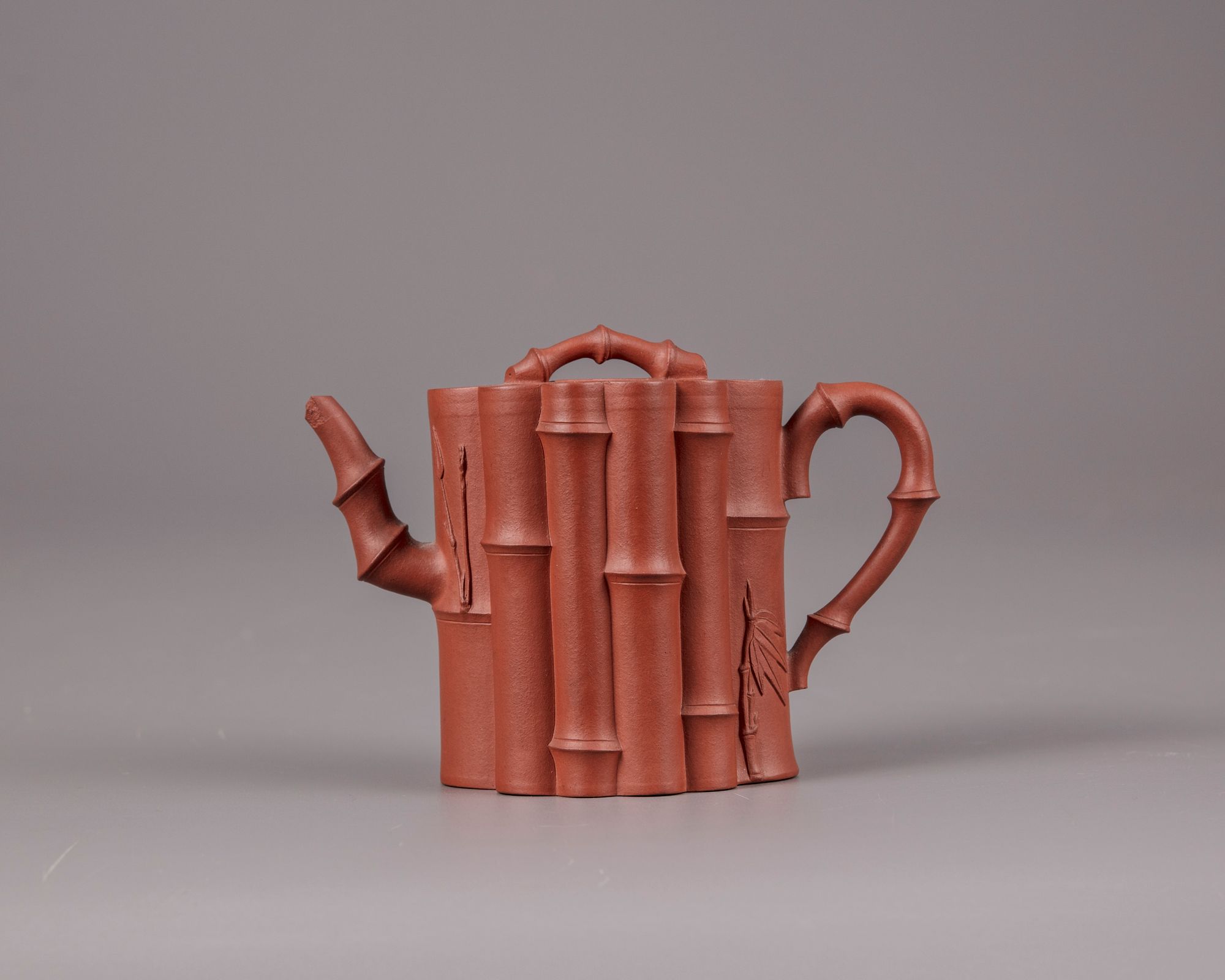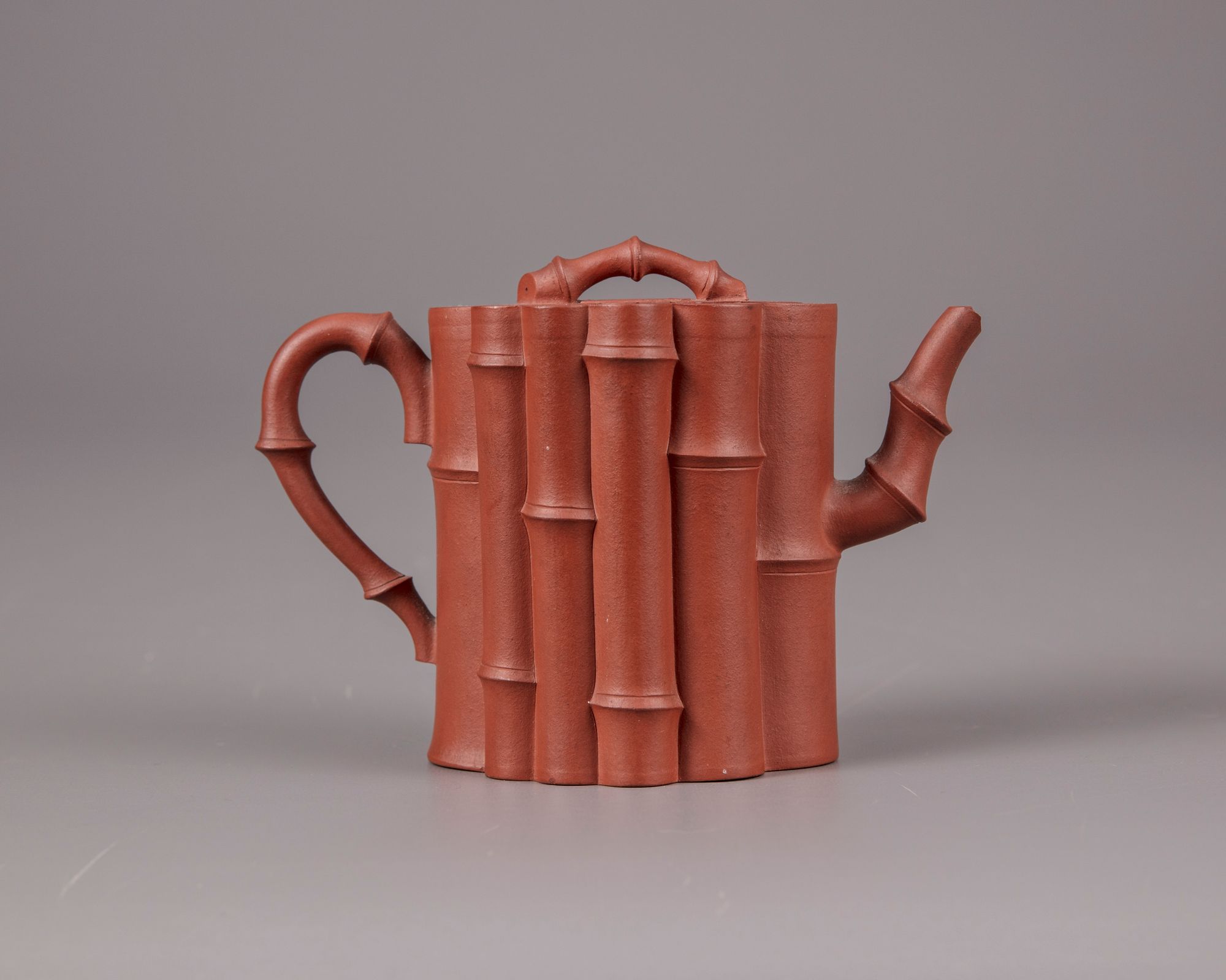 The teapot is modelled as stalks of bamboo in a quatrefoil form, with further small bamboo shoots to the side; the spout and handle are modelled imitating bamboo. The flat cover is surmounted by a bamboo finial.