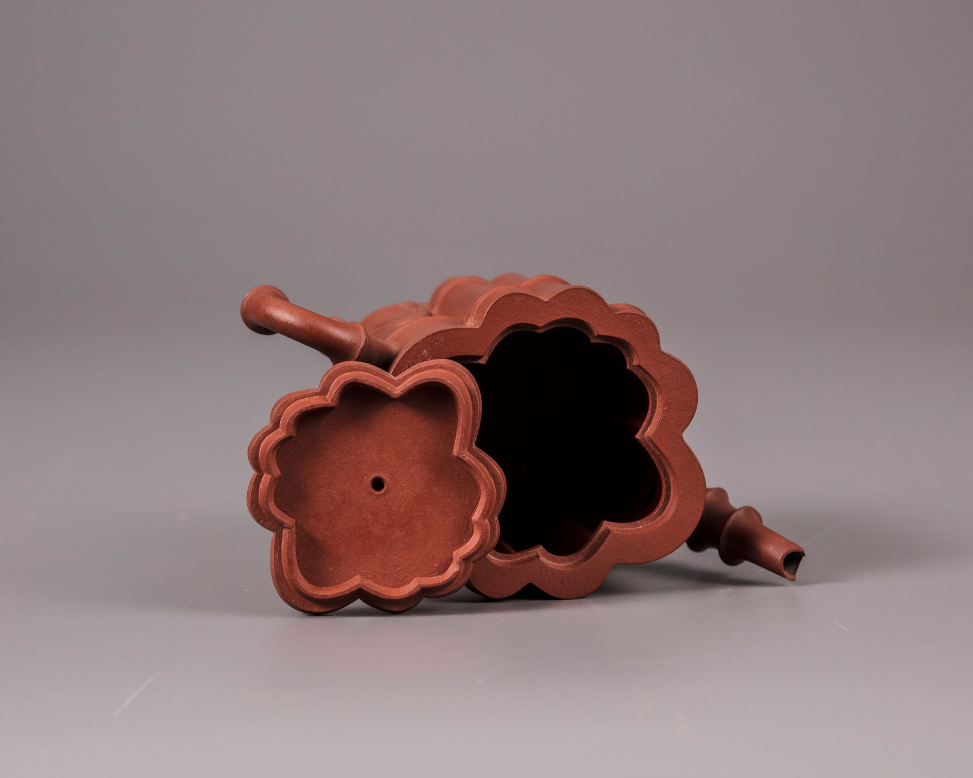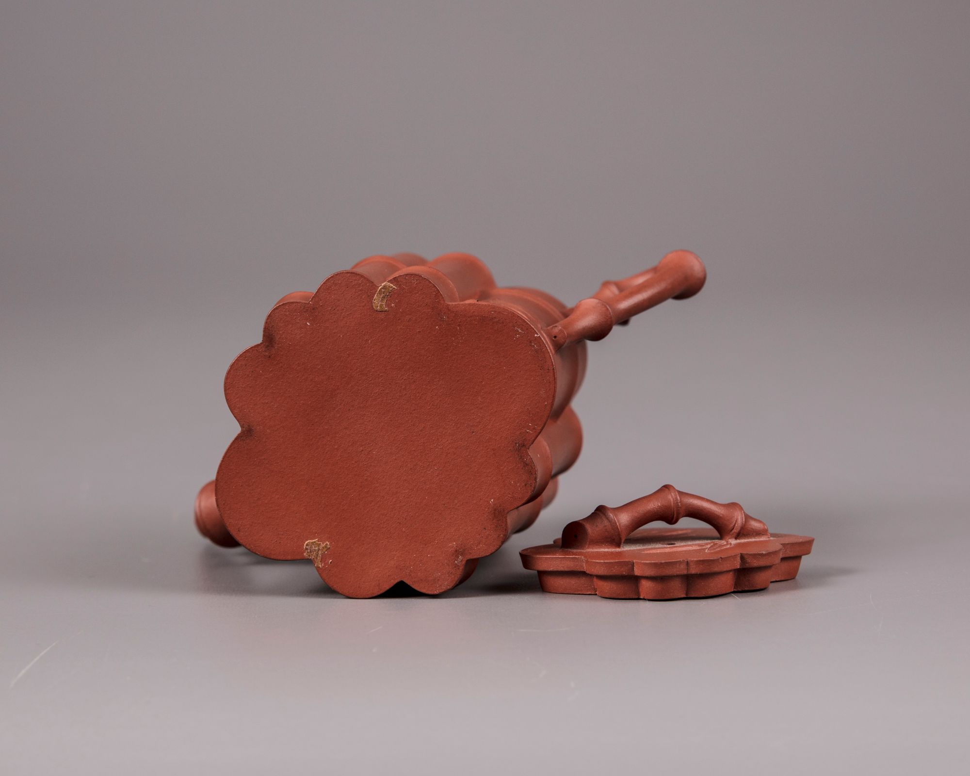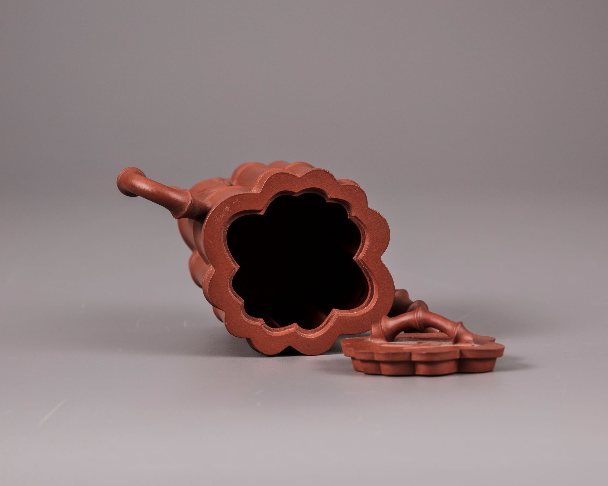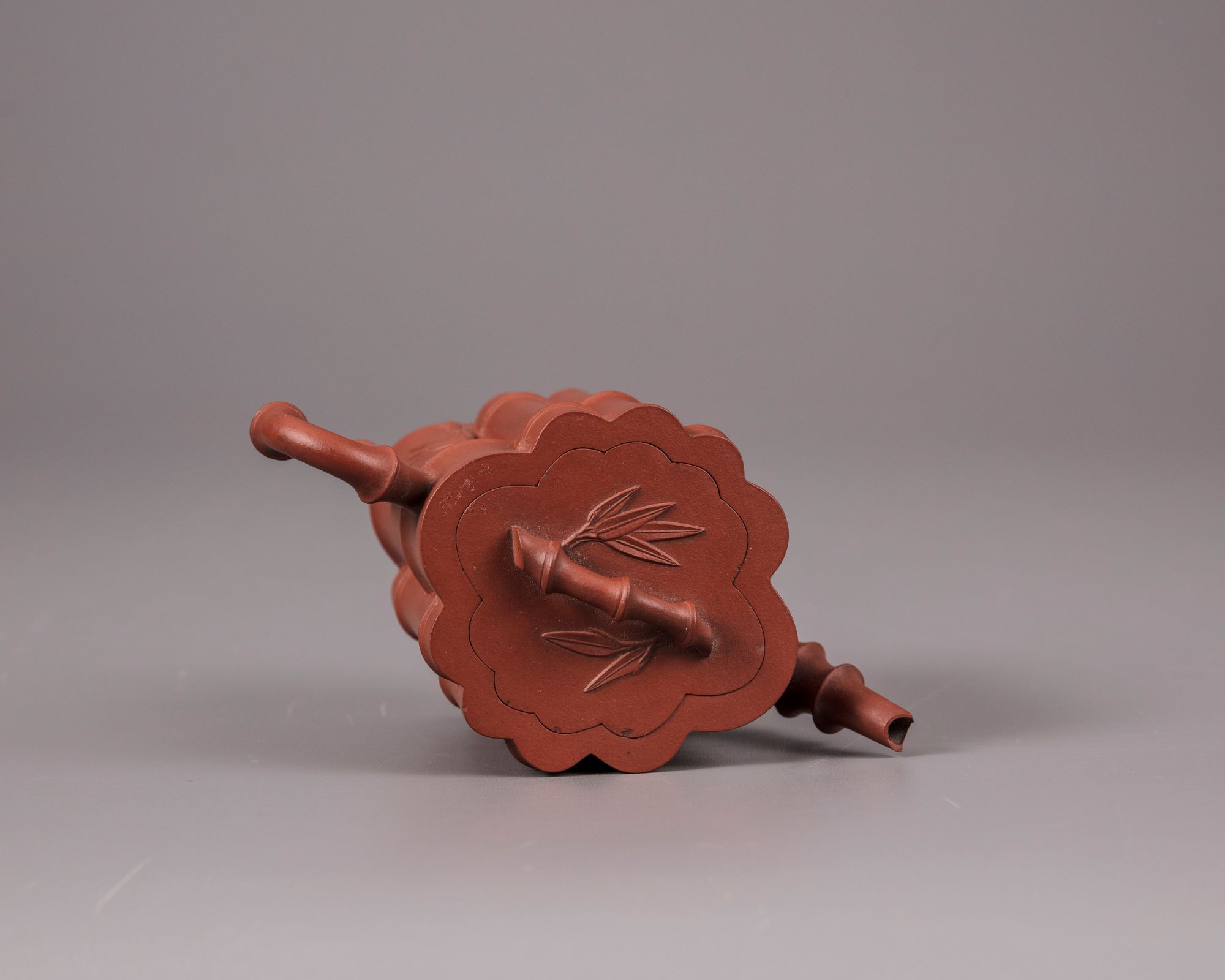 The teapot is modelled as stalks of bamboo in a quatrefoil form, with further small bamboo shoots to the side; the spout and handle are modelled imitating bamboo. The flat cover is surmounted by a bamboo finial.