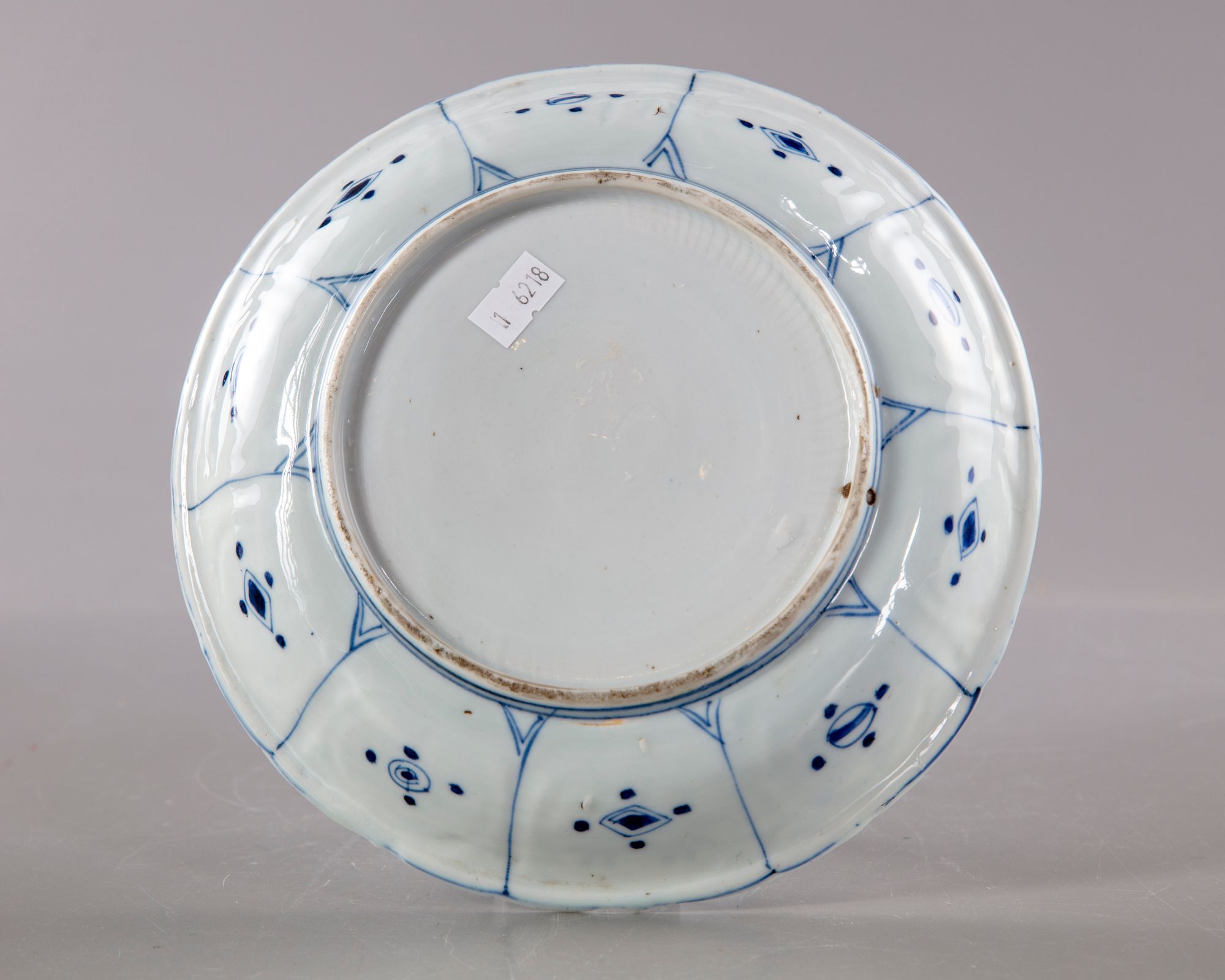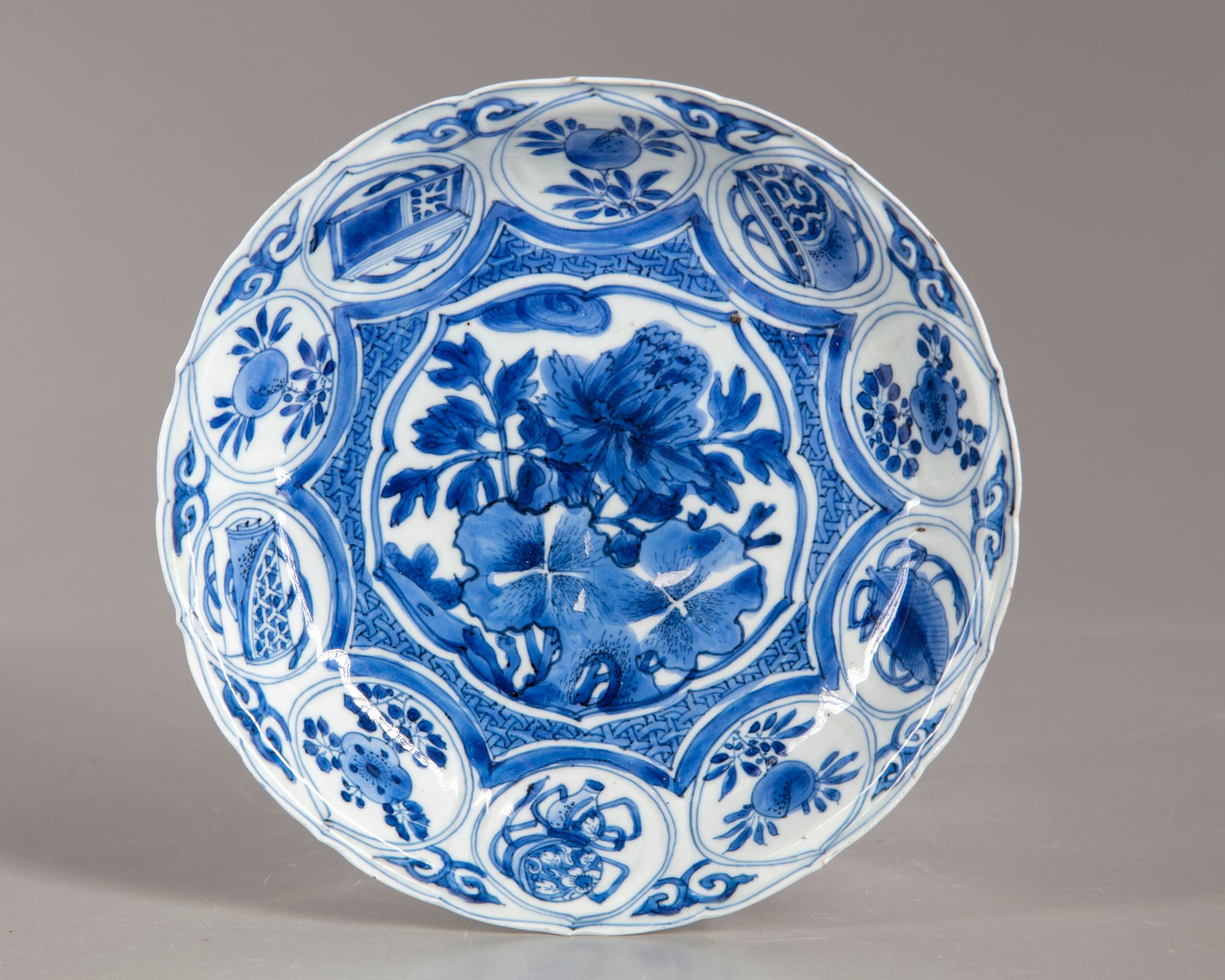 A Chinese blue and white dish, decorated with large flowers heads, surrounded by peach shaped panels enclosing flowers and Daoist emblems.