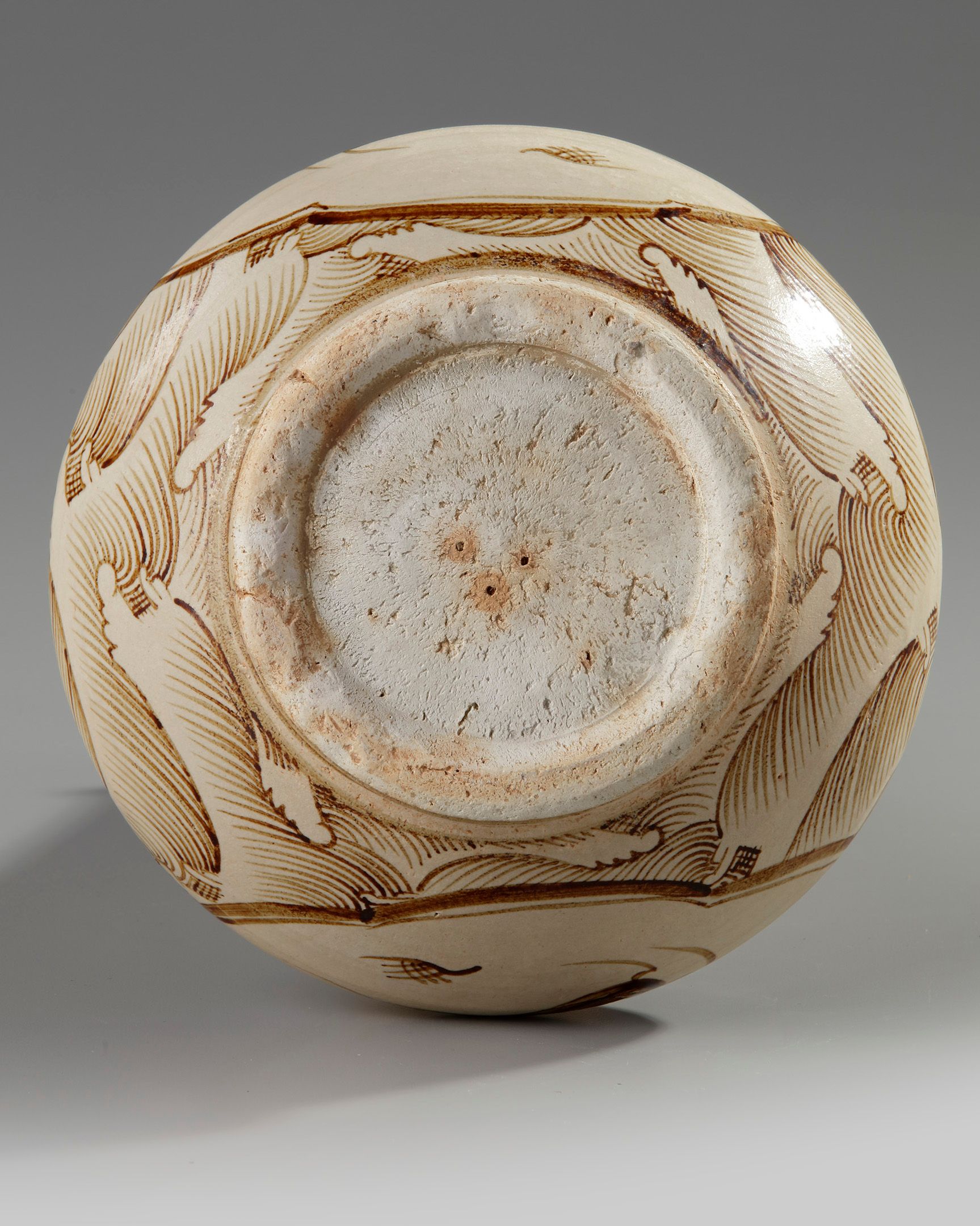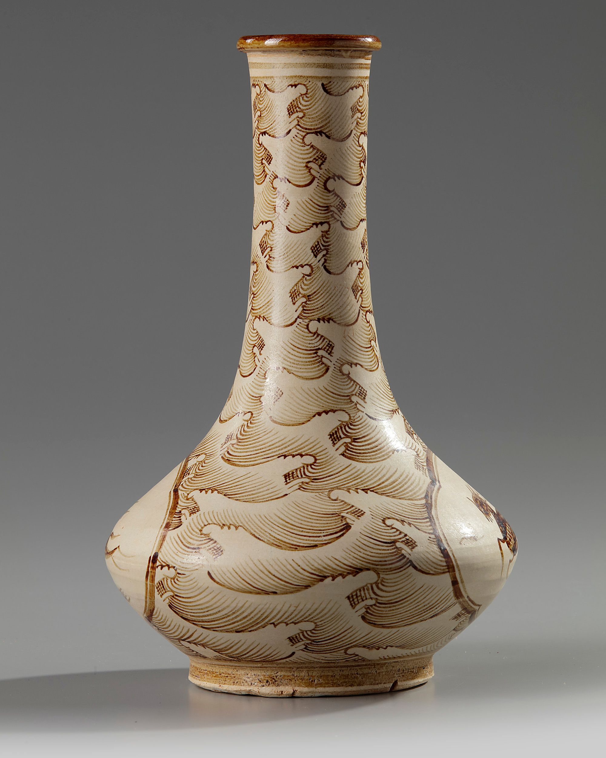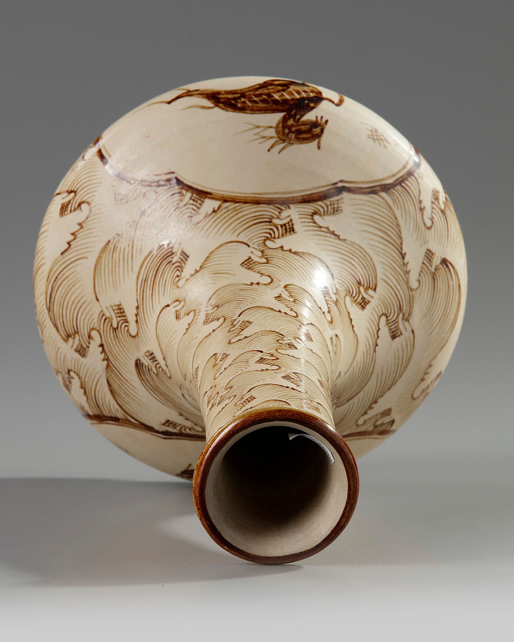 The vase is decorated to the flattened body with two cartouches enclosing a stag, all on a ground of densely foaming waves. The base is unglazed.