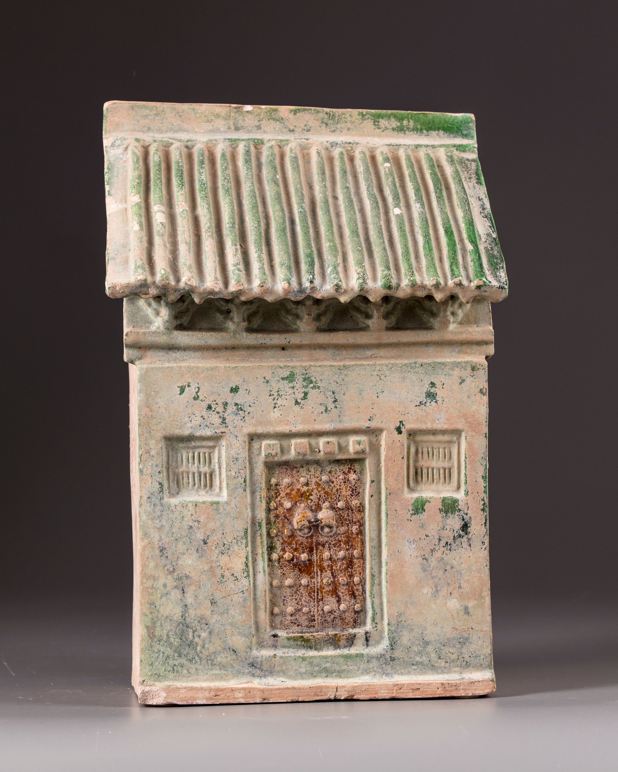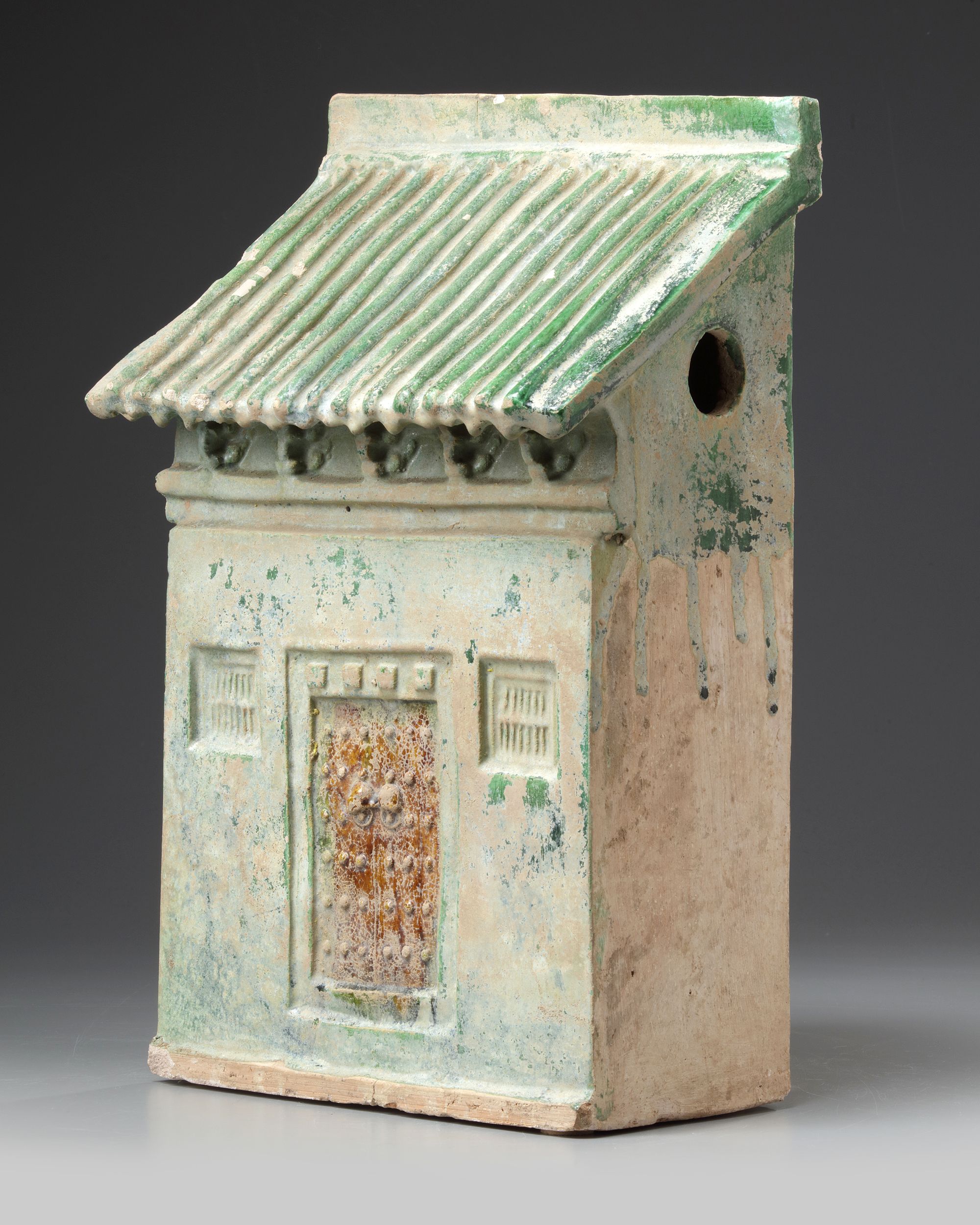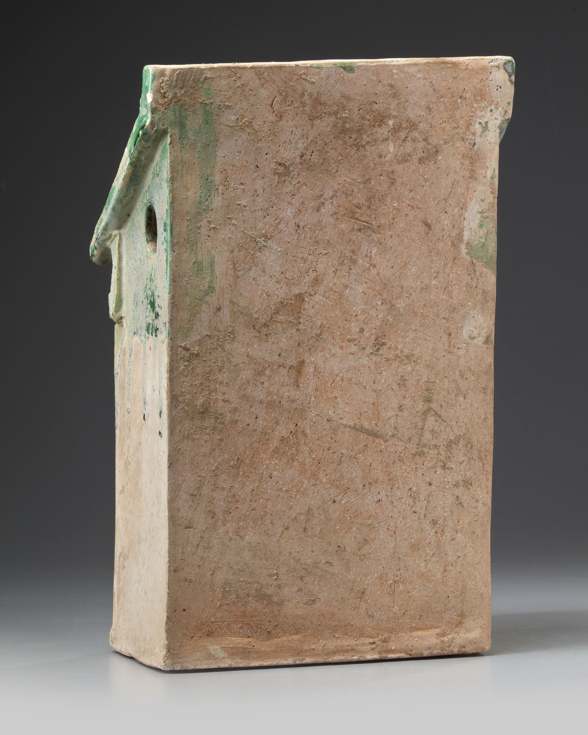 The rectangular house is modelled with a peaked roof decorated with upswept terminals, the front of the house with a bolted door between triangular apertures. The reverse with a row of further triangular apertures.