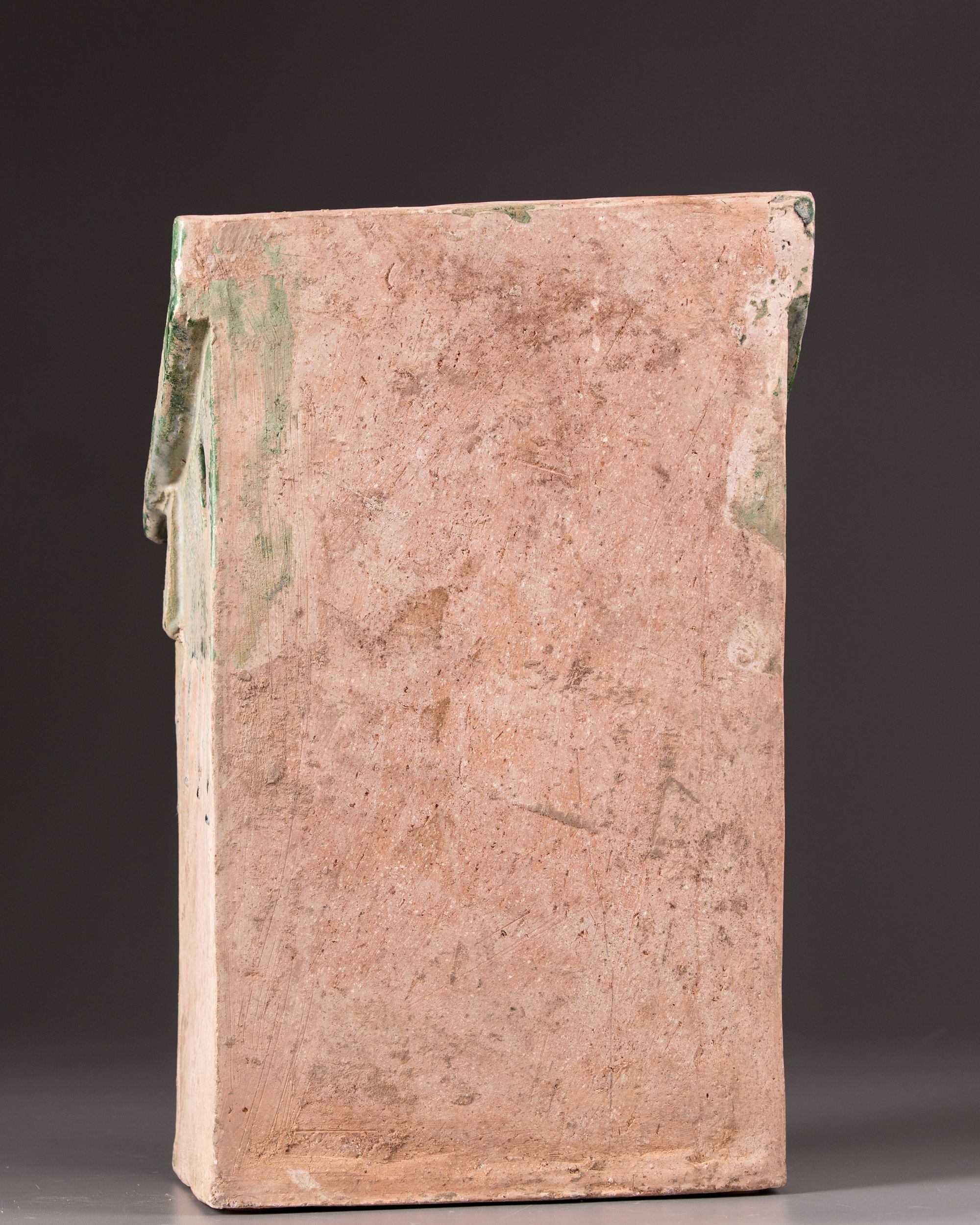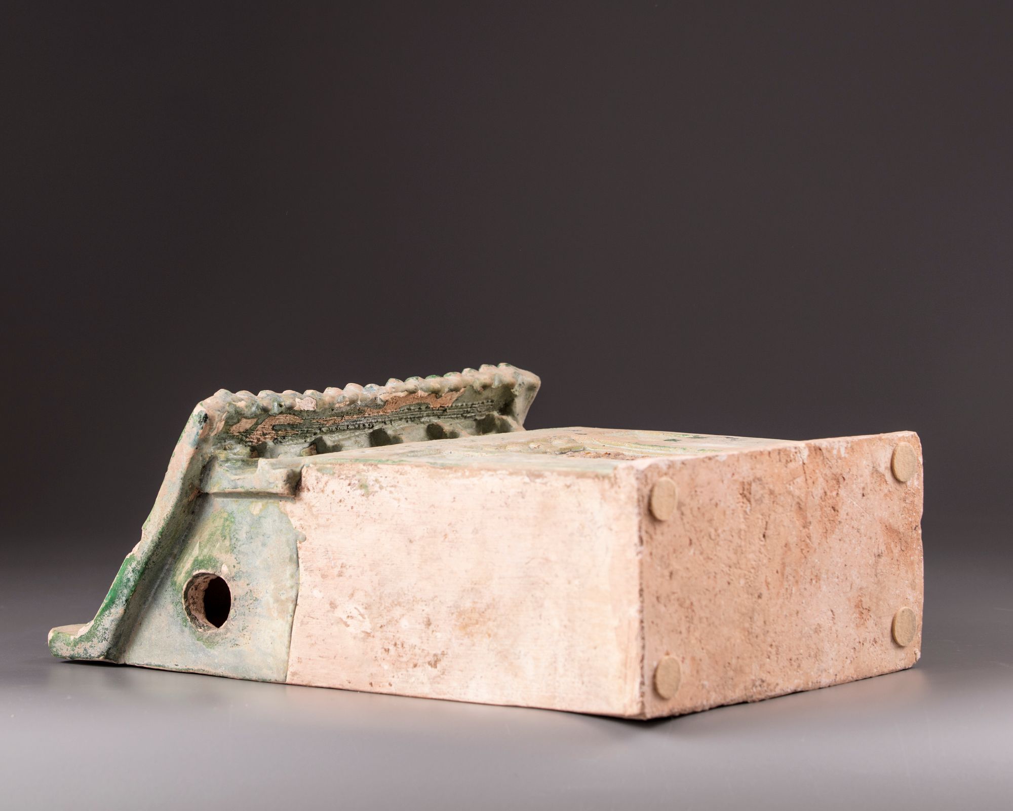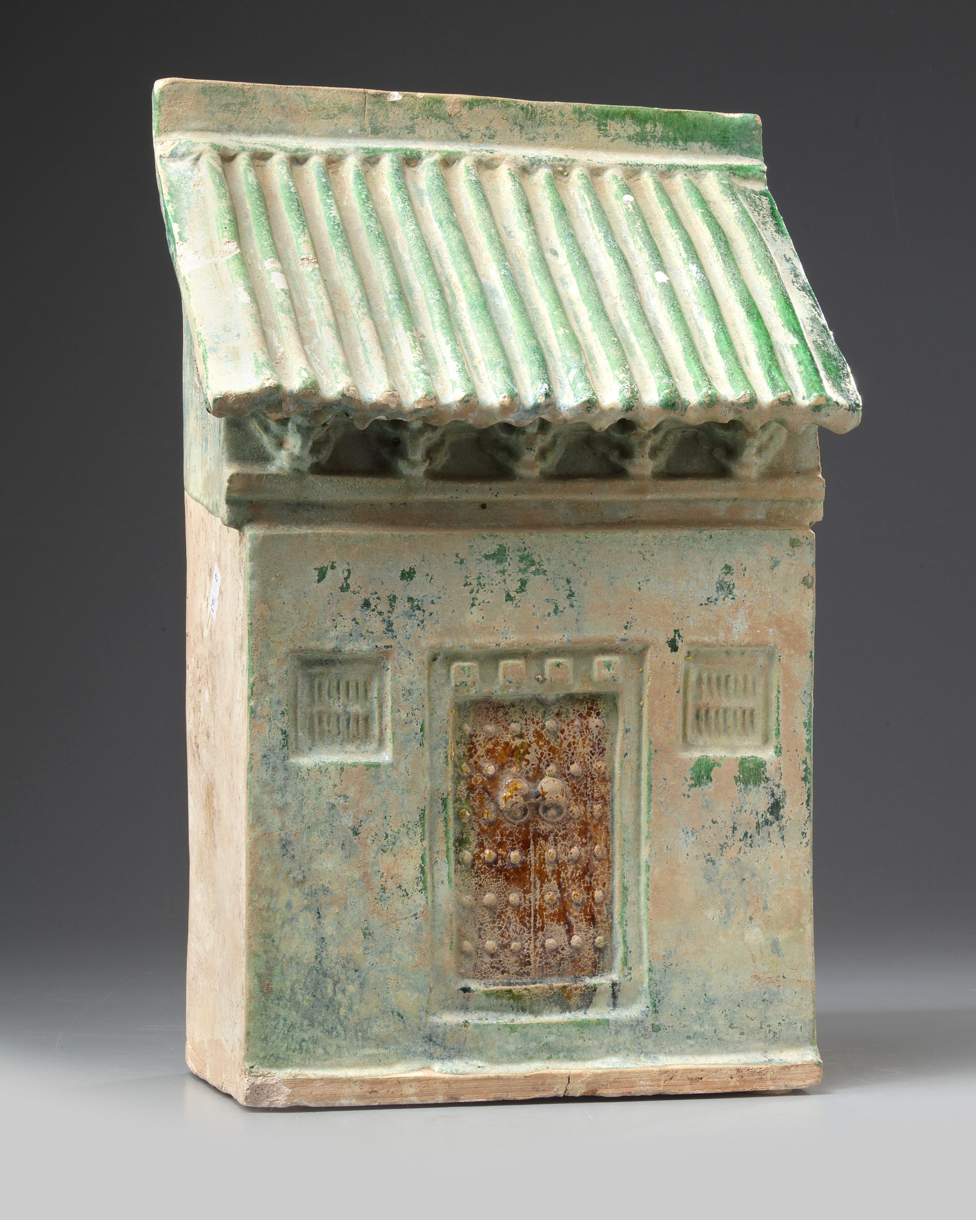 The rectangular house is modelled with a peaked roof decorated with upswept terminals, the front of the house with a bolted door between triangular apertures. The reverse with a row of further triangular apertures.