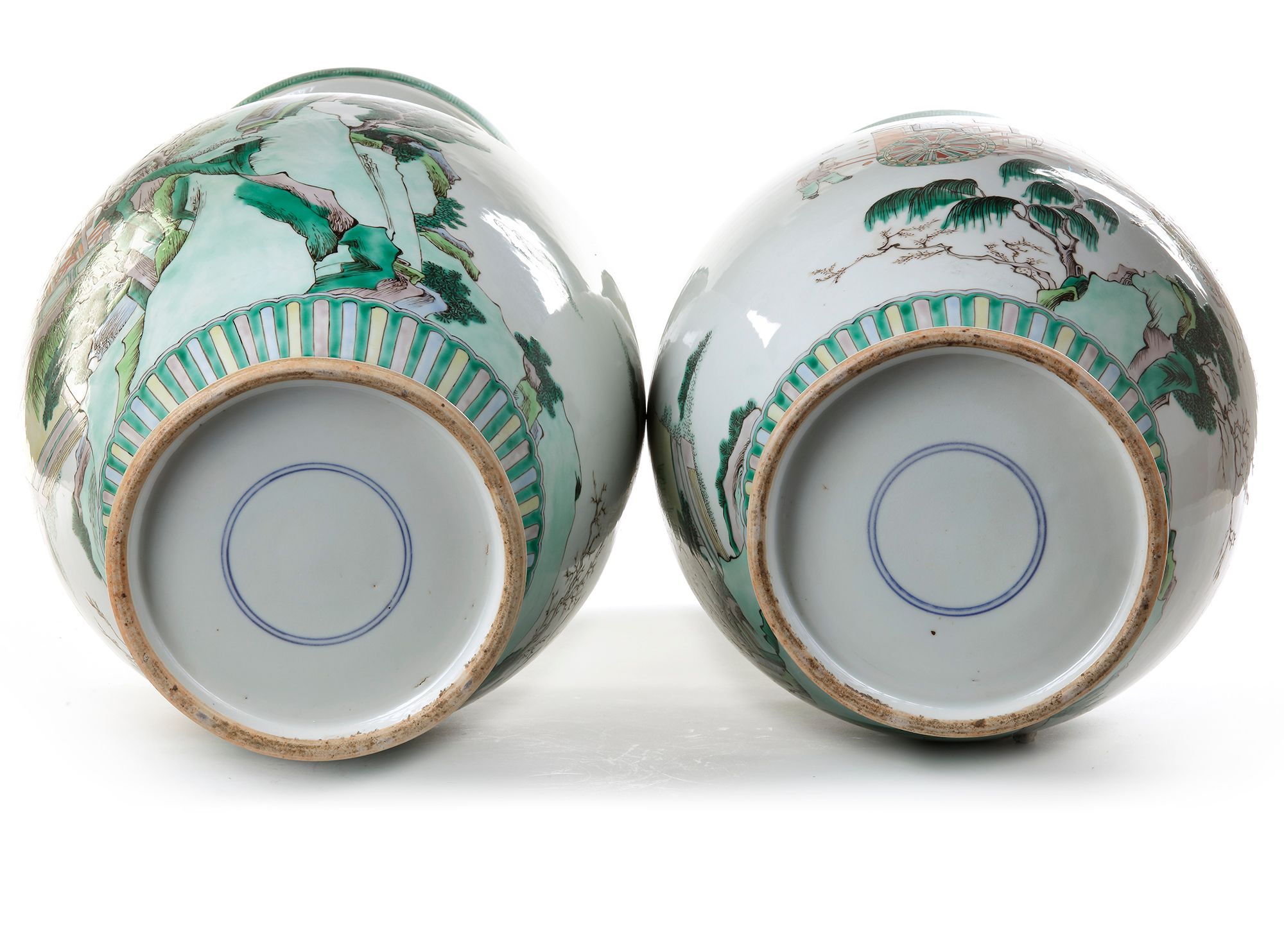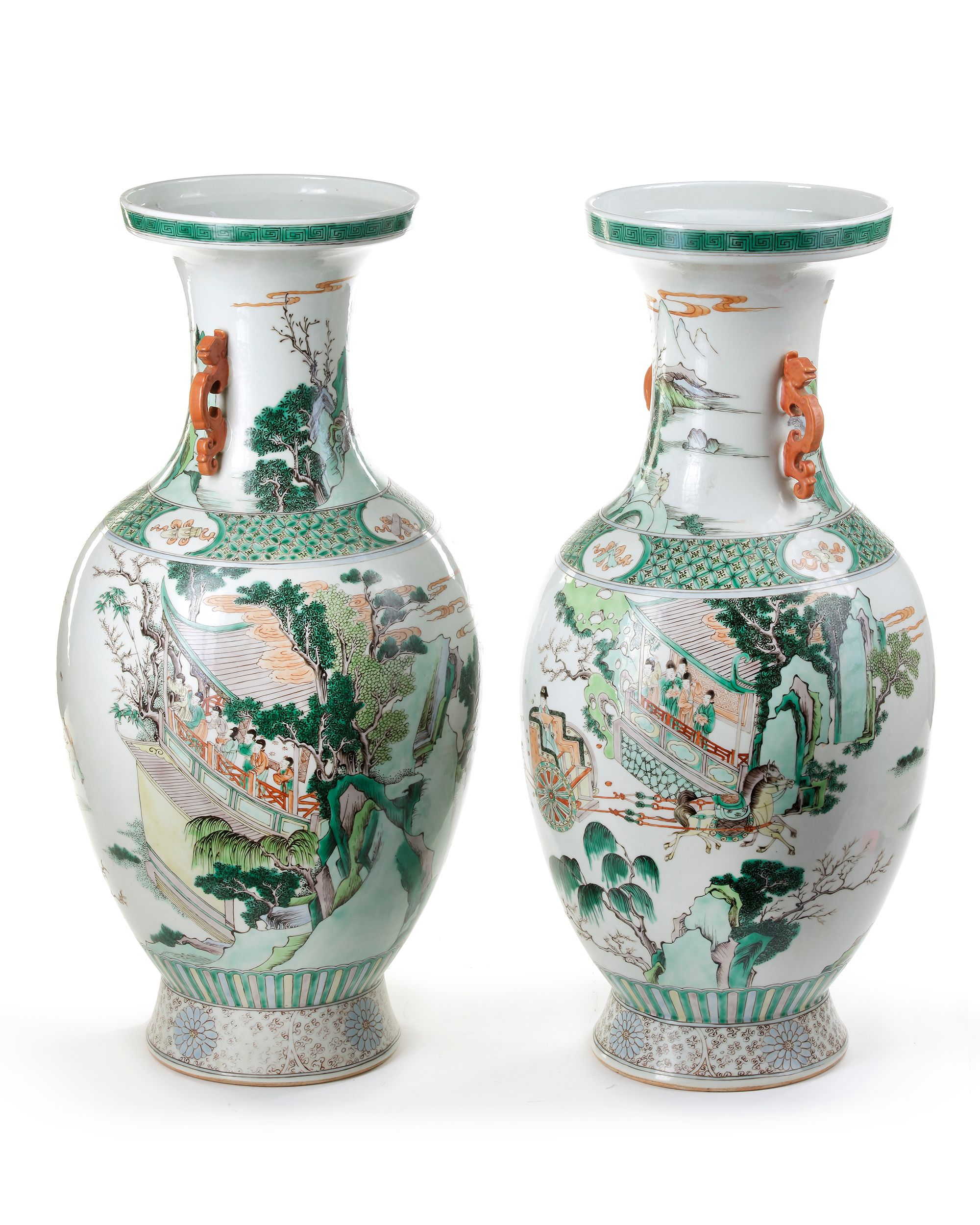 A pair of Chinese famille verte vases, Each of baluster form on a tapering raised foot, painted with a young man seated on a carriage, a group of ladies standing in a building nearby throwing flowers at him, the neck with a landscape and two chilong handles in copper red. 60.5 cm.