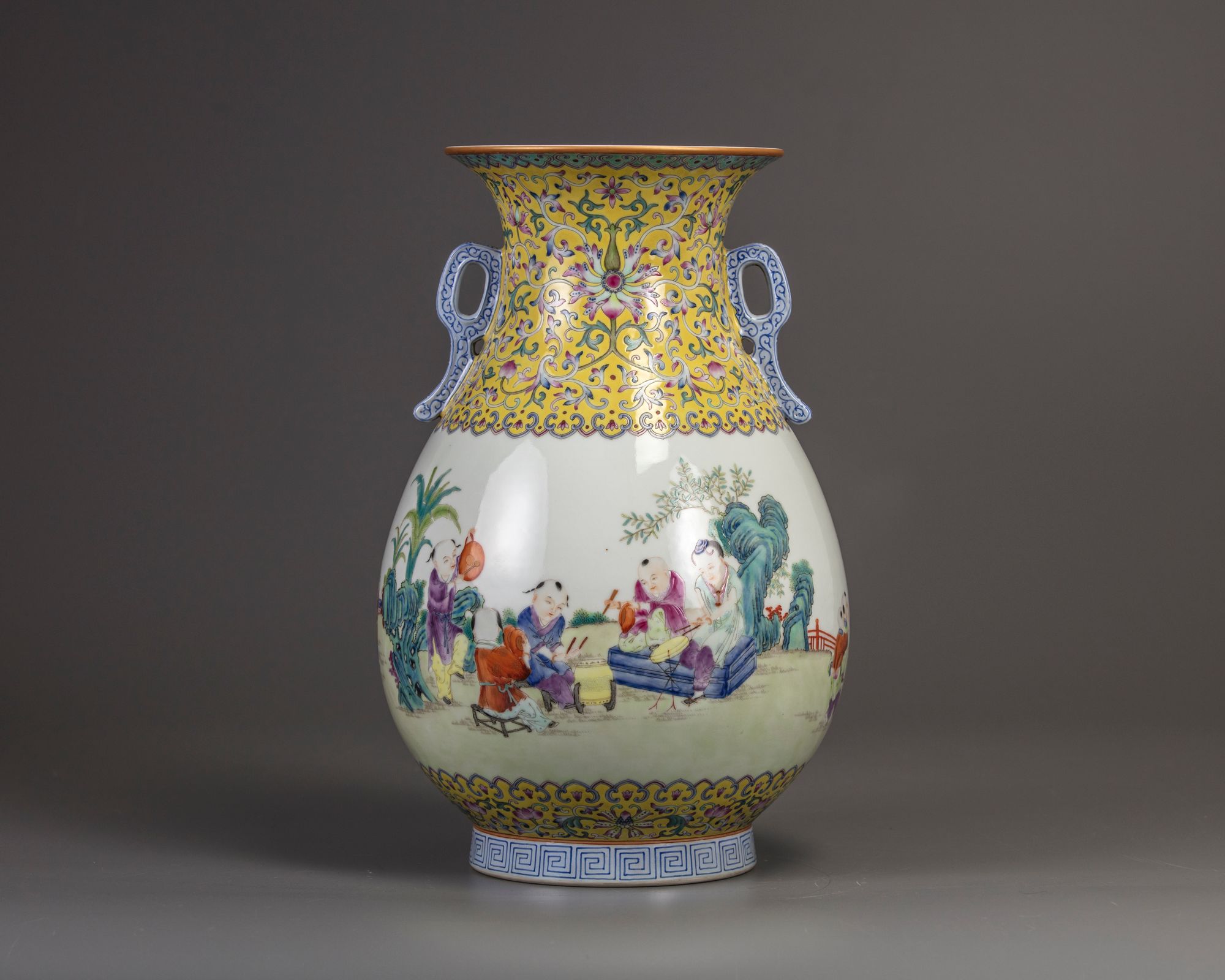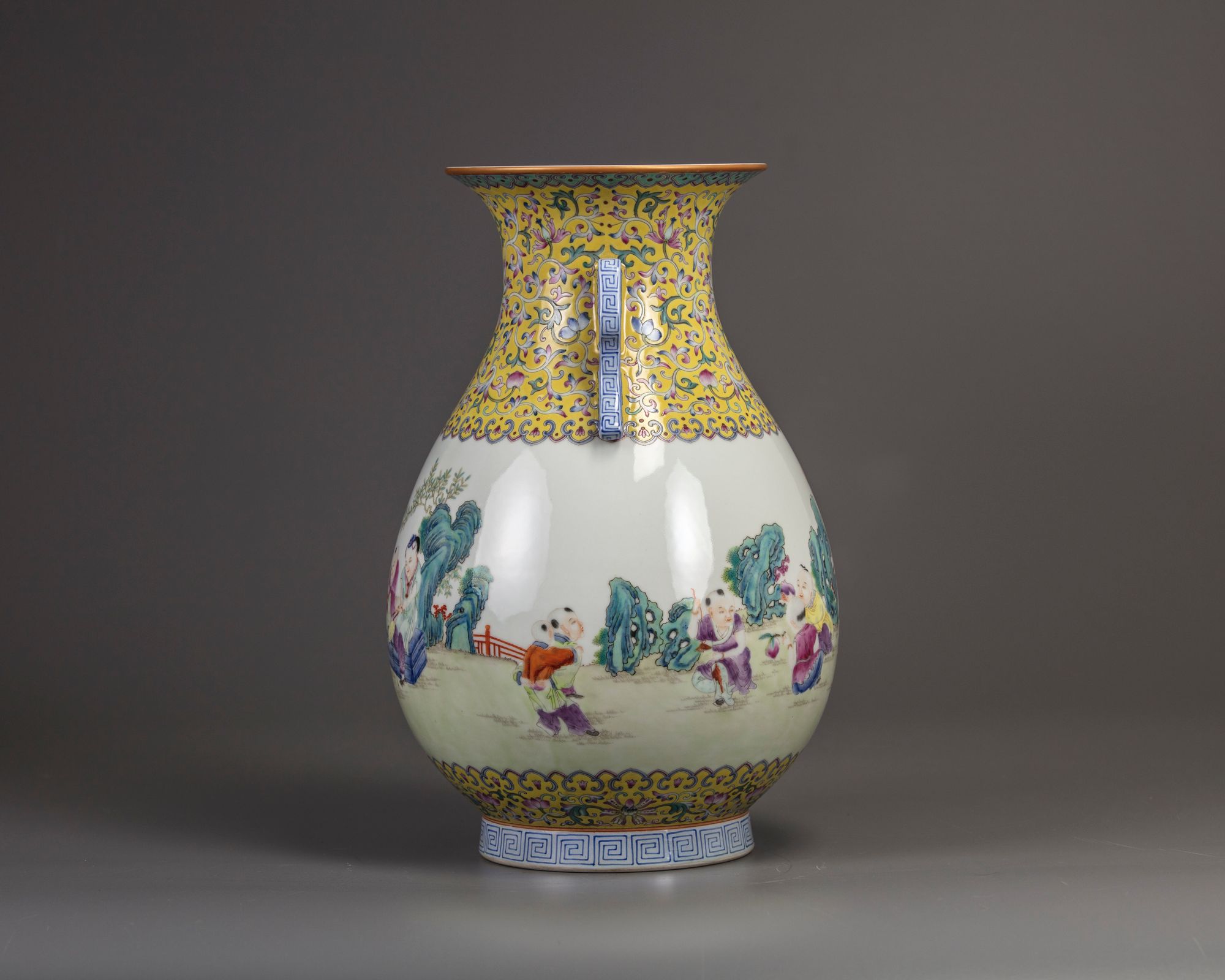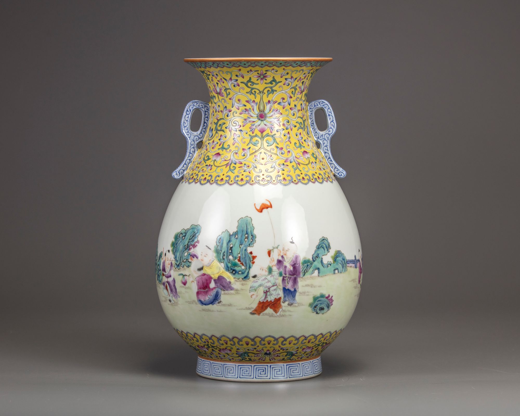 The pear shaped vase is modelled standing on a short foot rising to a flaring mouth with with openwork handles. The body decorated with a scene of boys at play, the neck and the base with lotus scrolls on a yellow ground. The base with an apocryphal Qianlong mark.