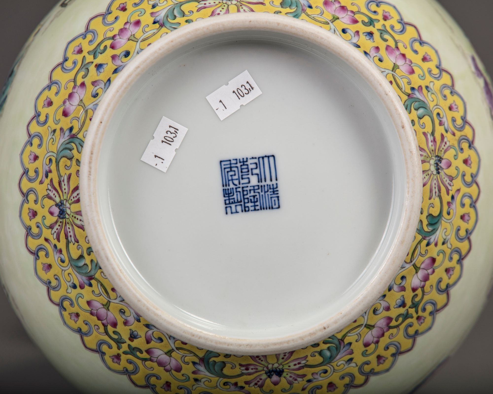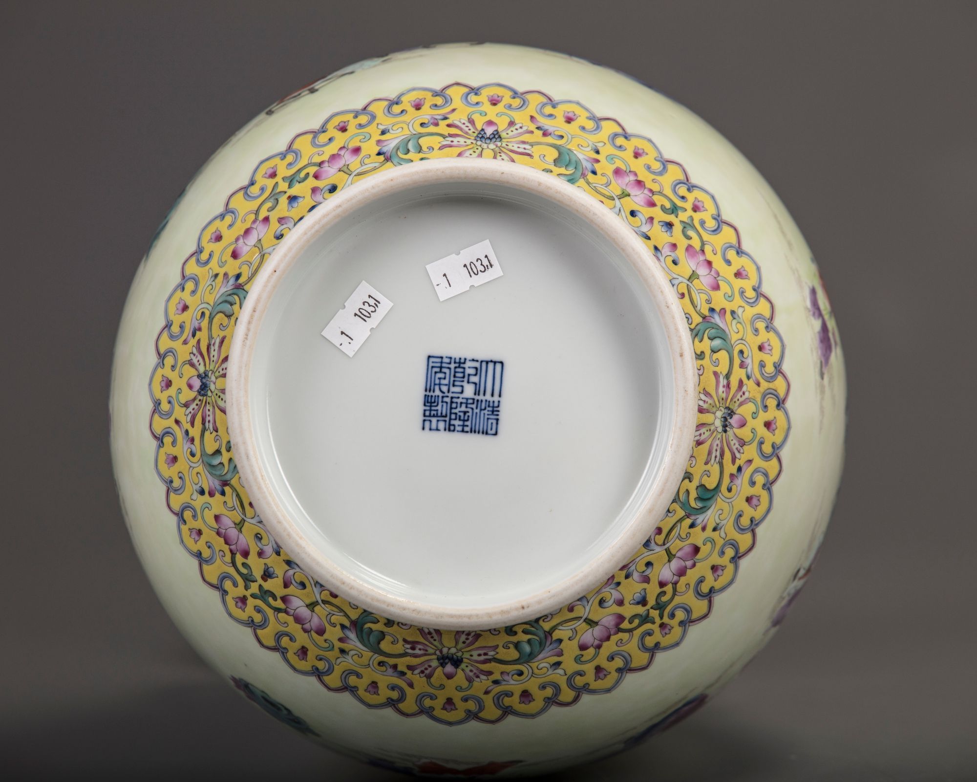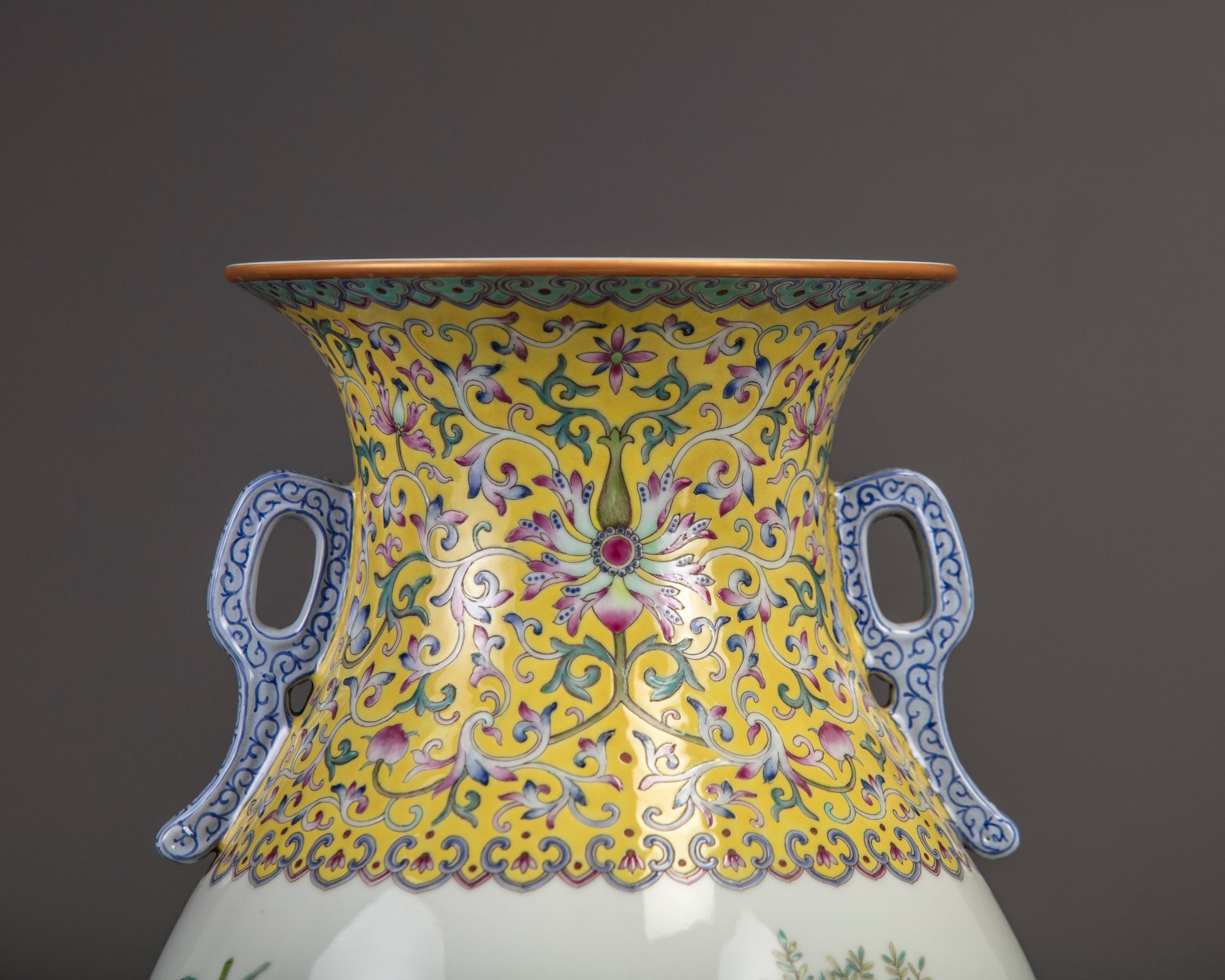The pear shaped vase is modelled standing on a short foot rising to a flaring mouth with with openwork handles. The body decorated with a scene of boys at play, the neck and the base with lotus scrolls on a yellow ground. The base with an apocryphal Qianlong mark.