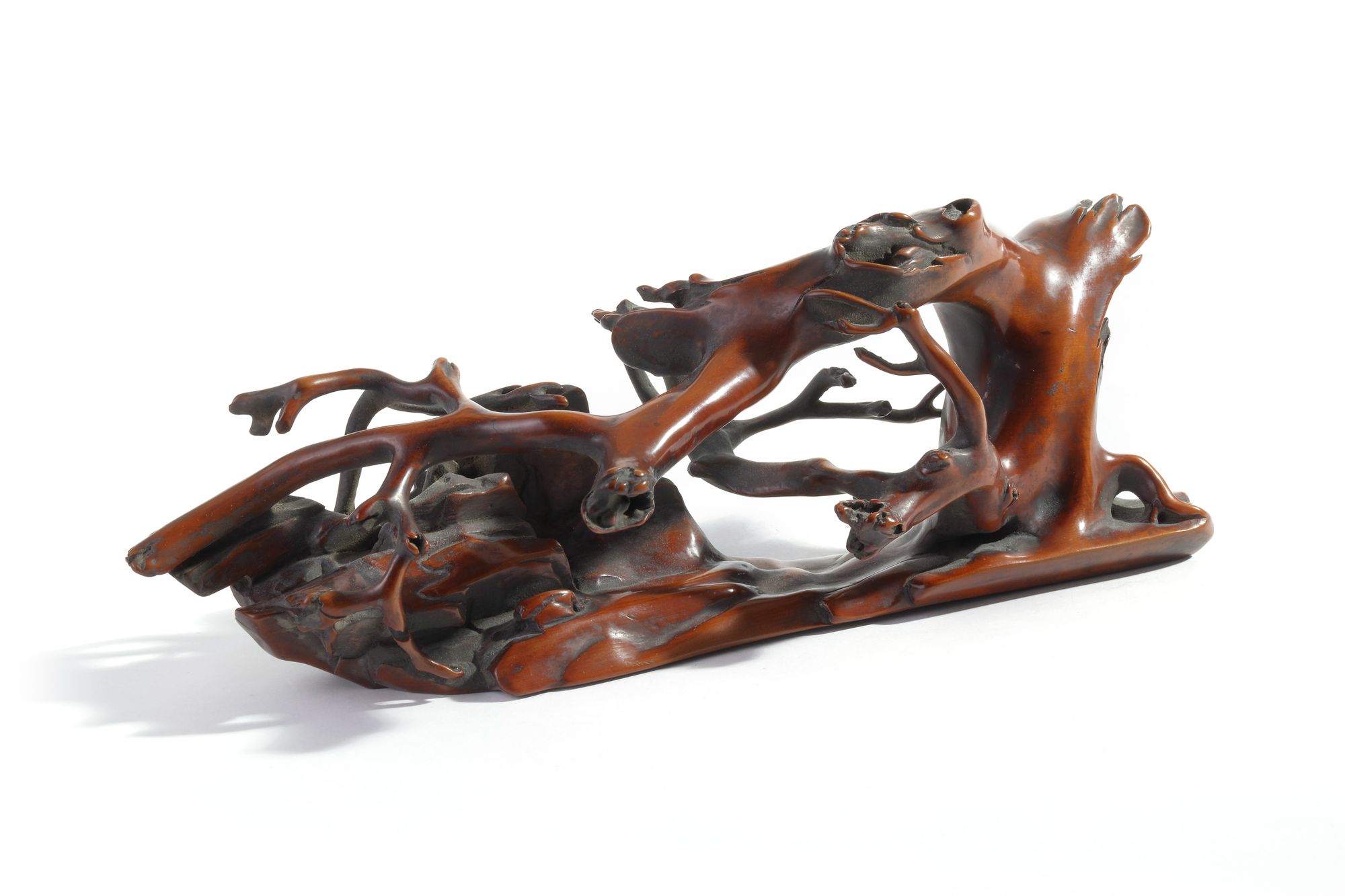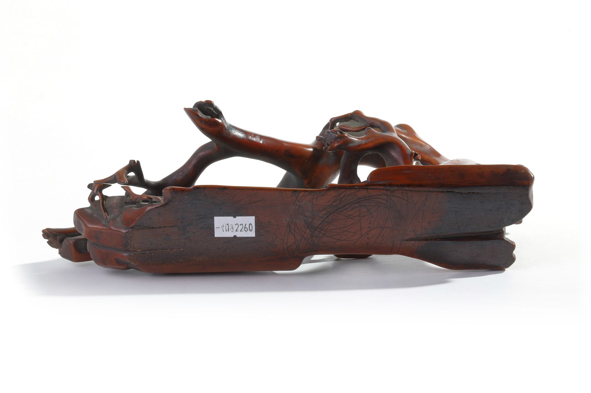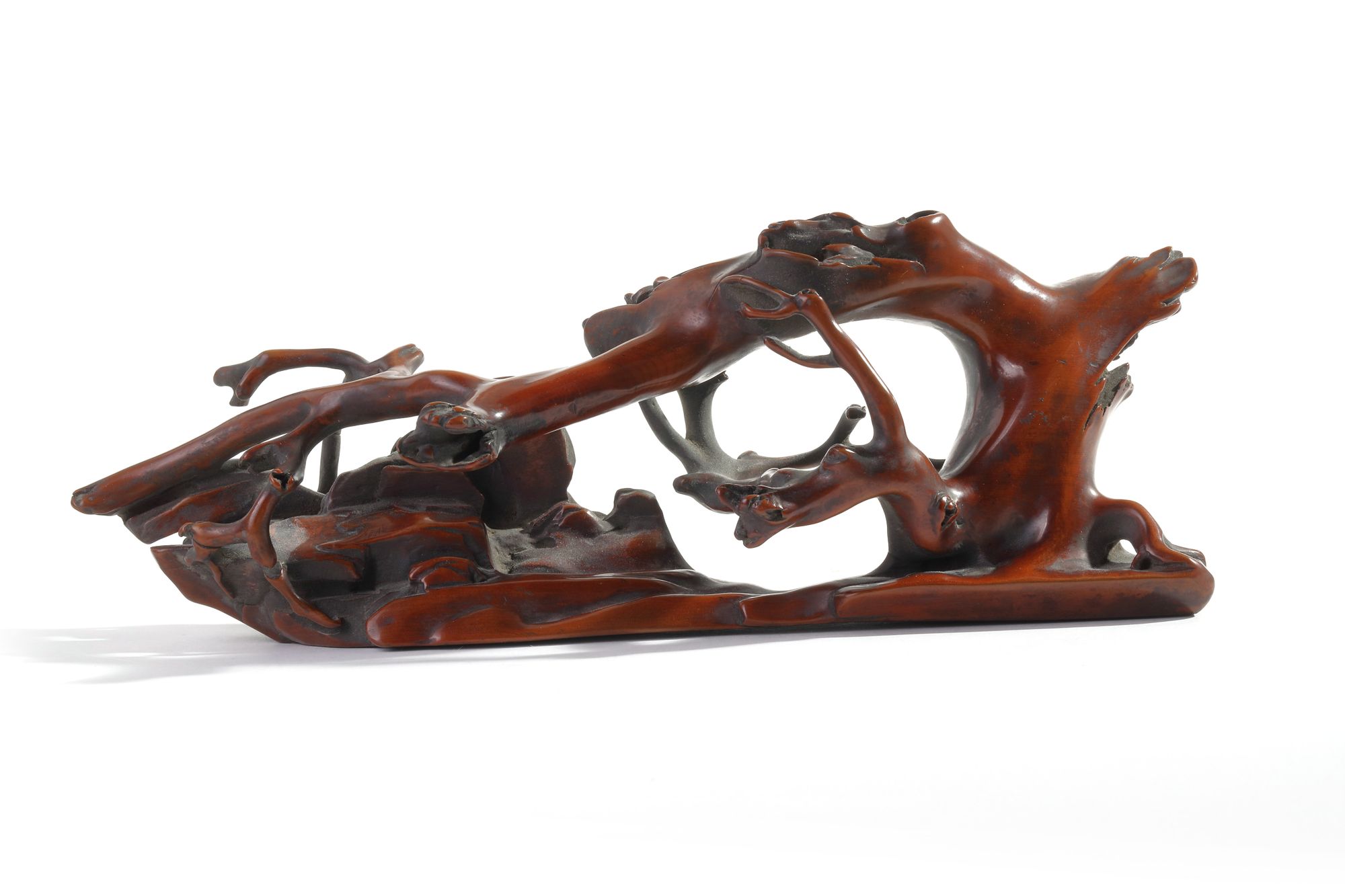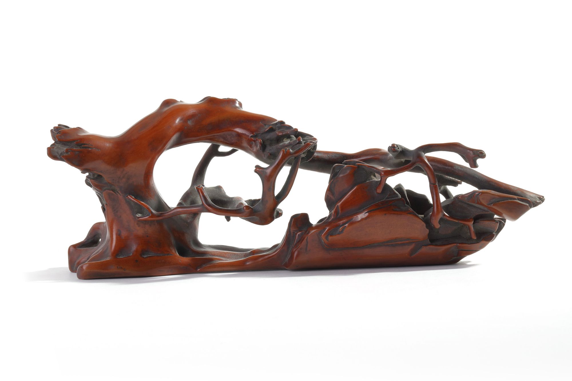 The brush rest is naturalistically modelled and undercut as a gnarled branch by rocks. The wood is of a rich brown tone.