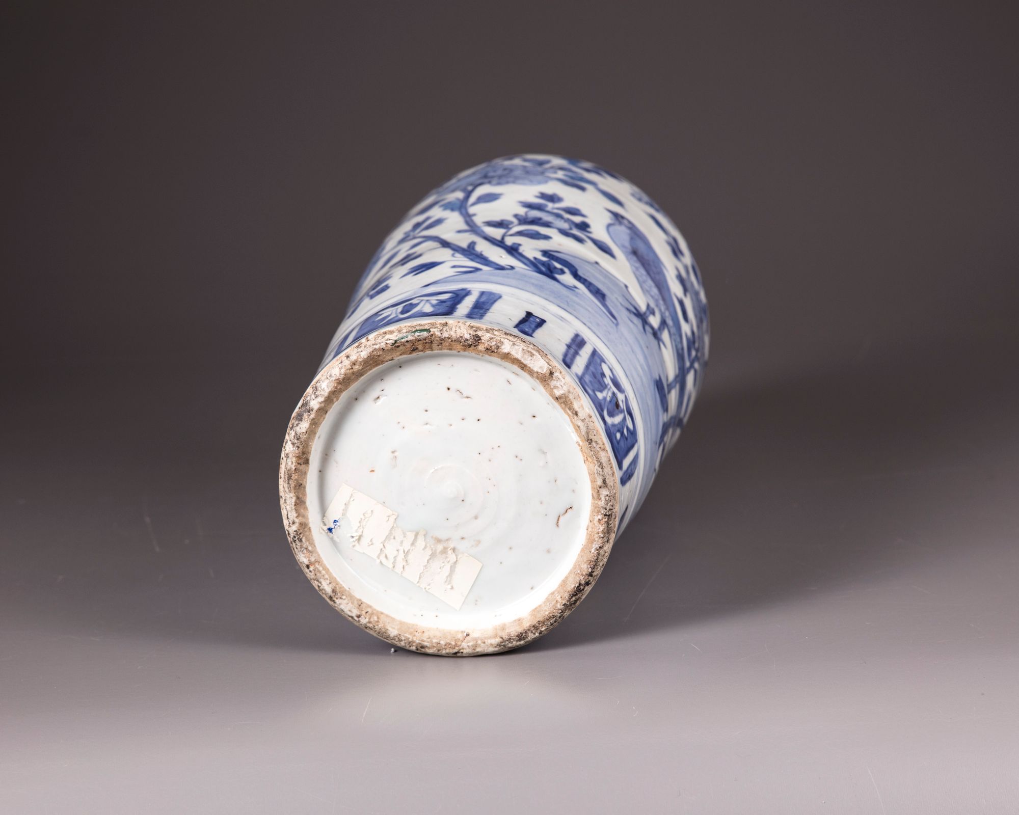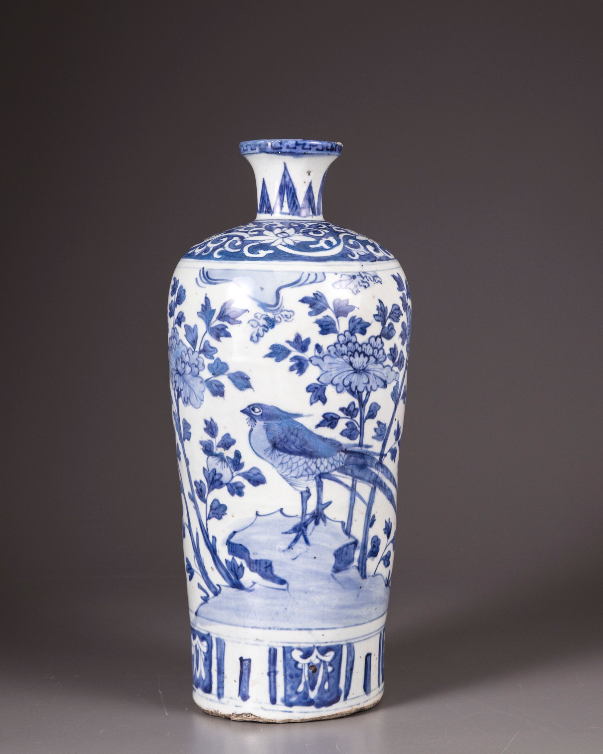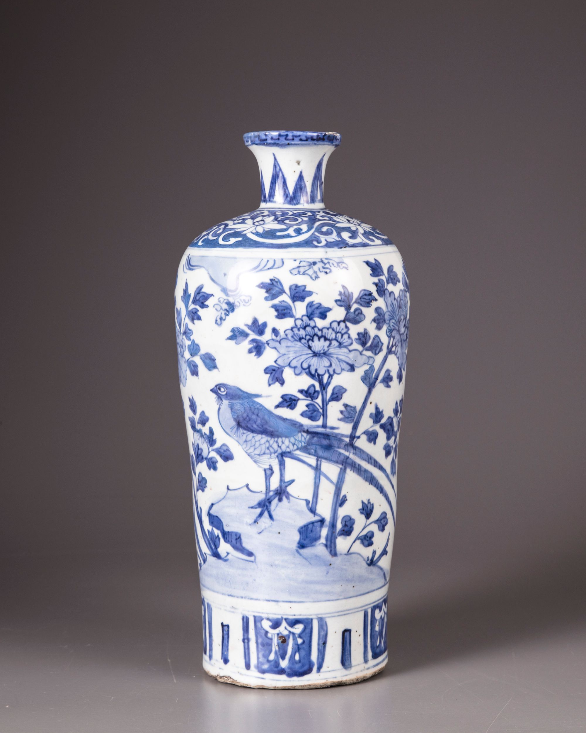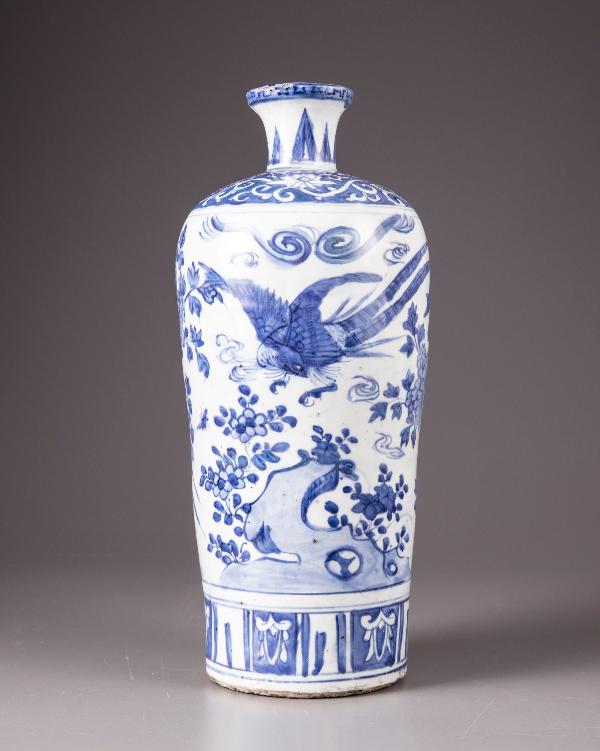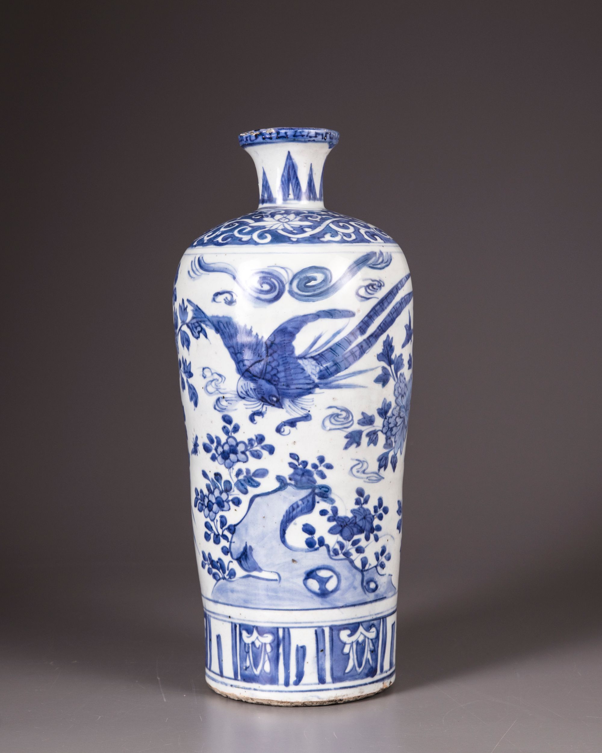 The tapering vase is decorated with a continuous scene of a standing pheasant and a pheasant in flight amongst flowering peonies, all below a reserve-decorated scrolling lotus band to the shoulder. The neck is decorated with stiff leaves, and the foot is decorated with a stylised lappet band.
