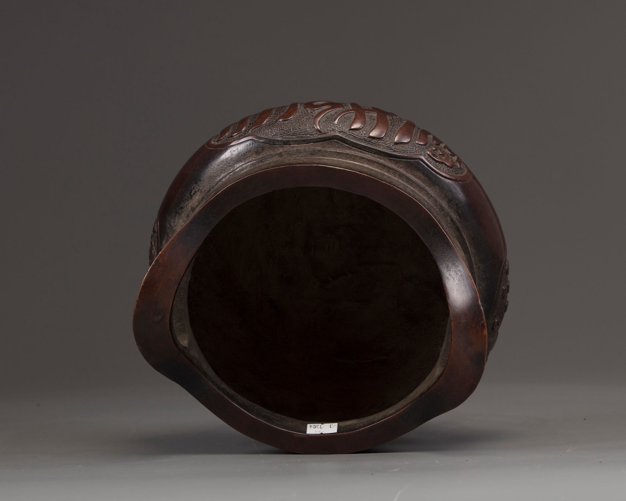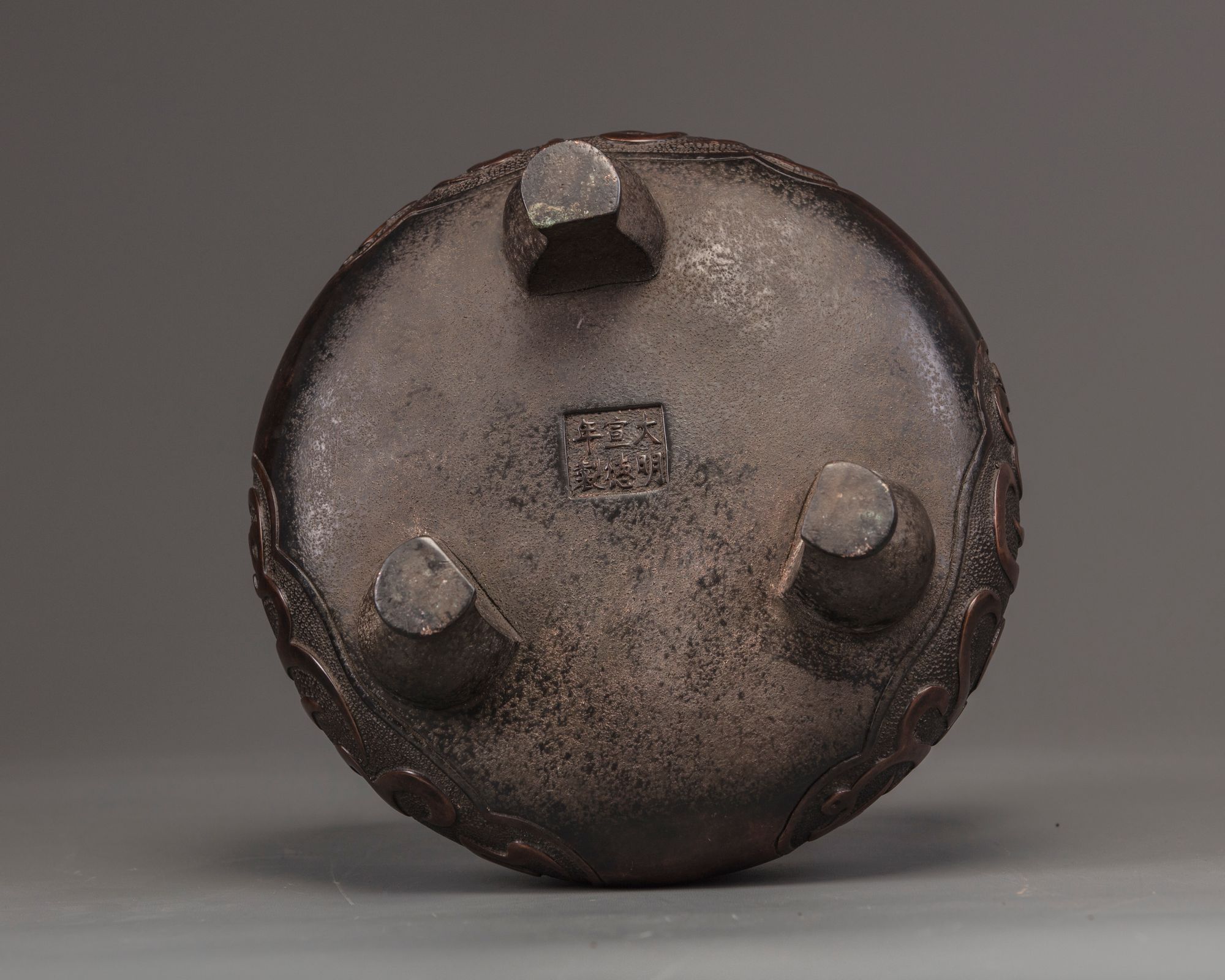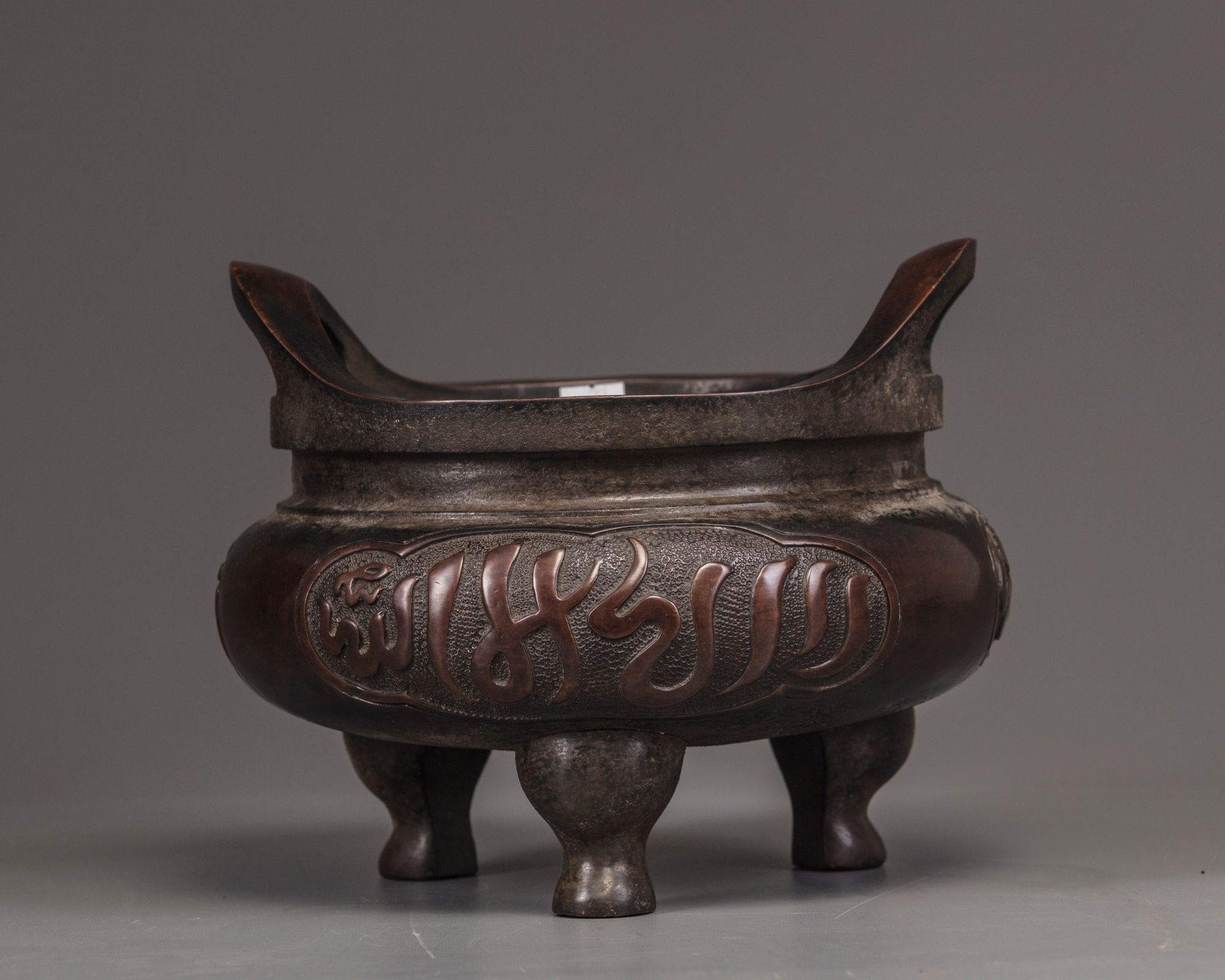 The bombé body is decorated with two panels enclosing Islamic inscriptions, the rim is cast with two upswept handles. The base with apocryphal Xuande reign mark within a recessed panel.