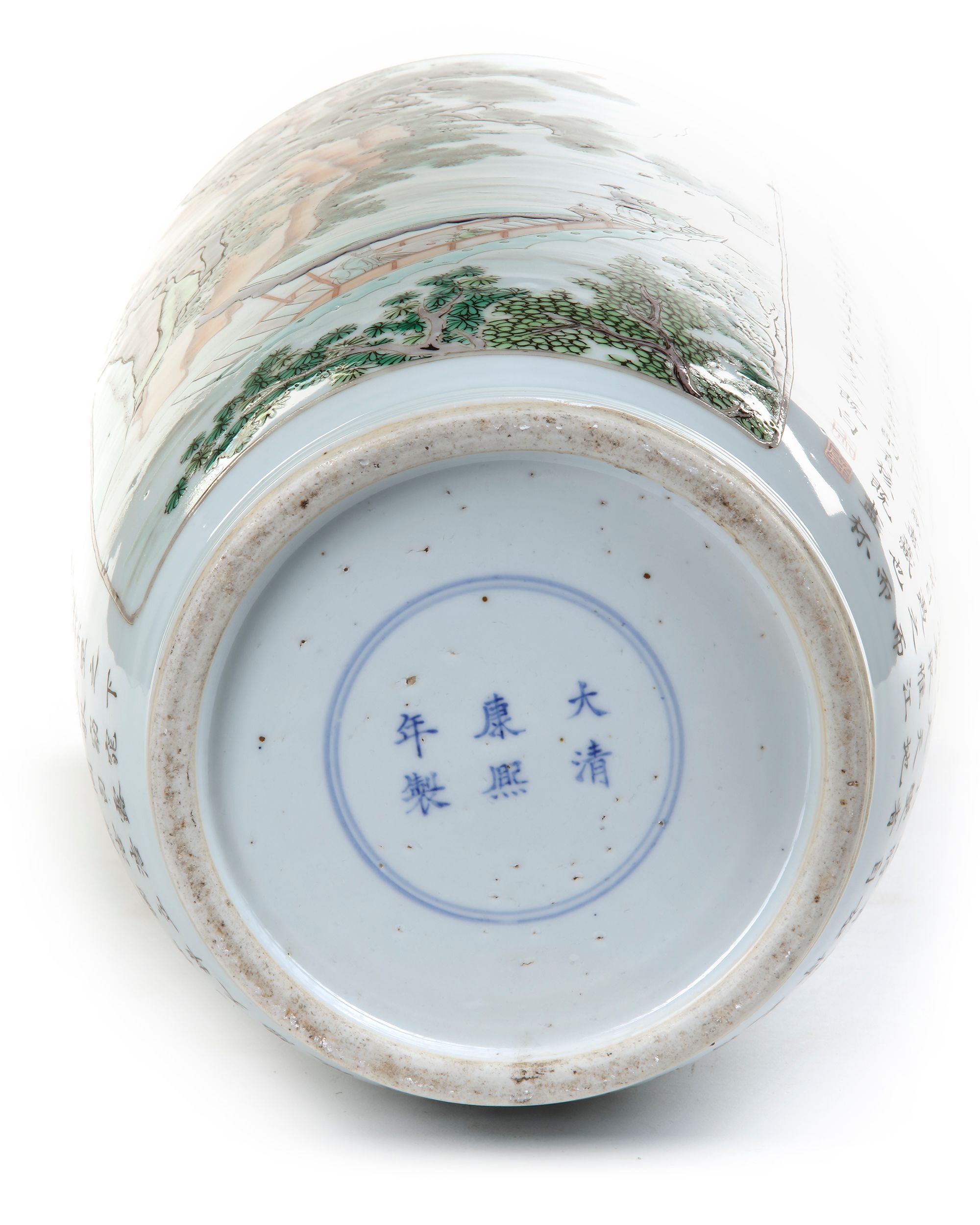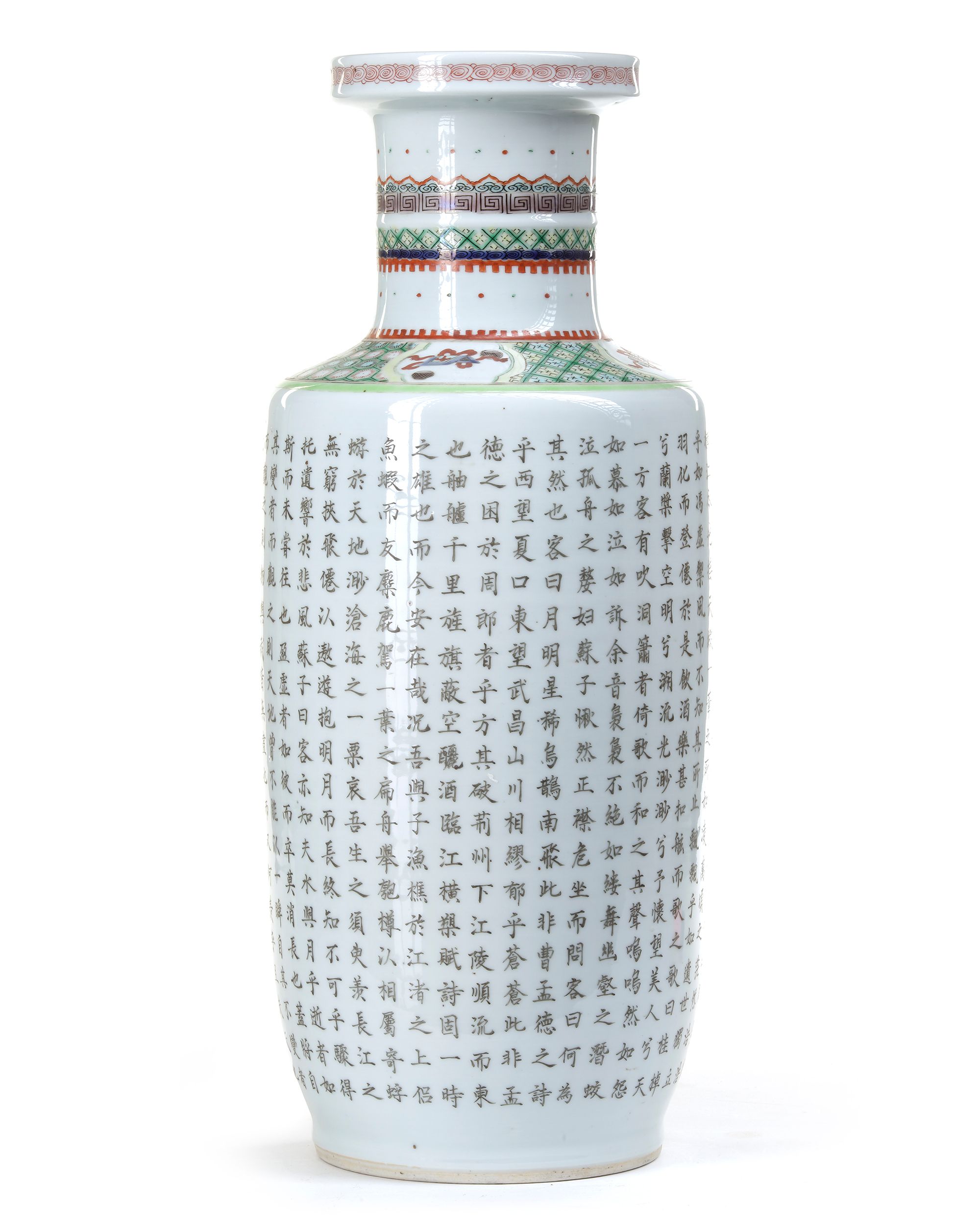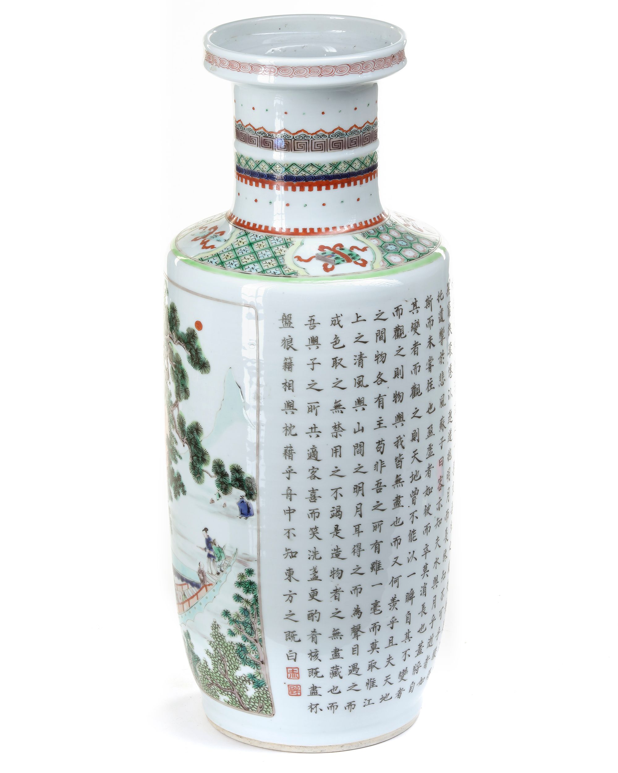 The rouleau vase is decorated to the body with a panel enclosing figures in a sampan in a mountainous landscape, the reverse with poetic inscriptions. Further painted to the shoulder with a diaper band containing cartouches enclosing precious objects, the neck with key-fret and ruyi-head bands. The base with an apocryphal Kangxi six character mark. 47 cm.
