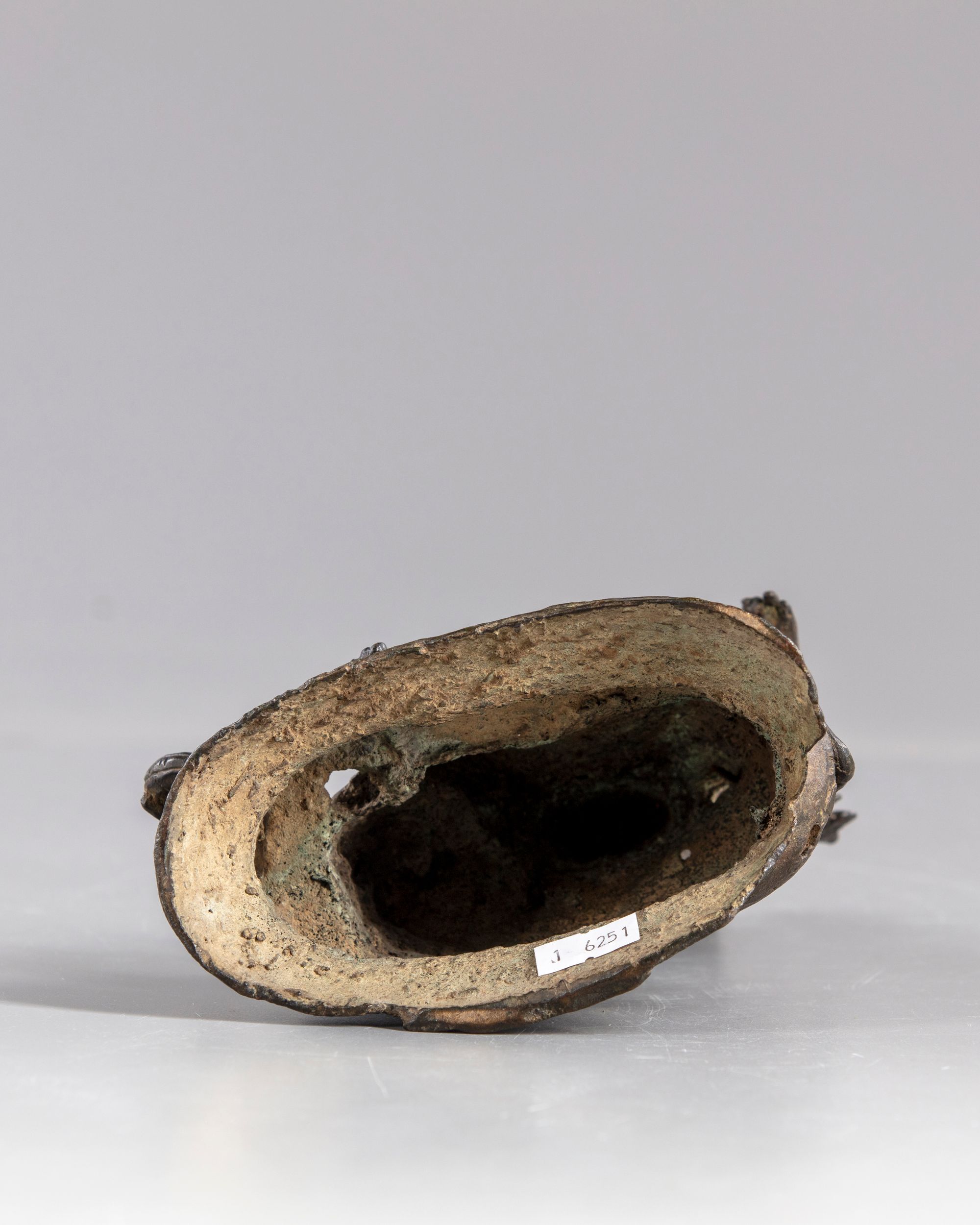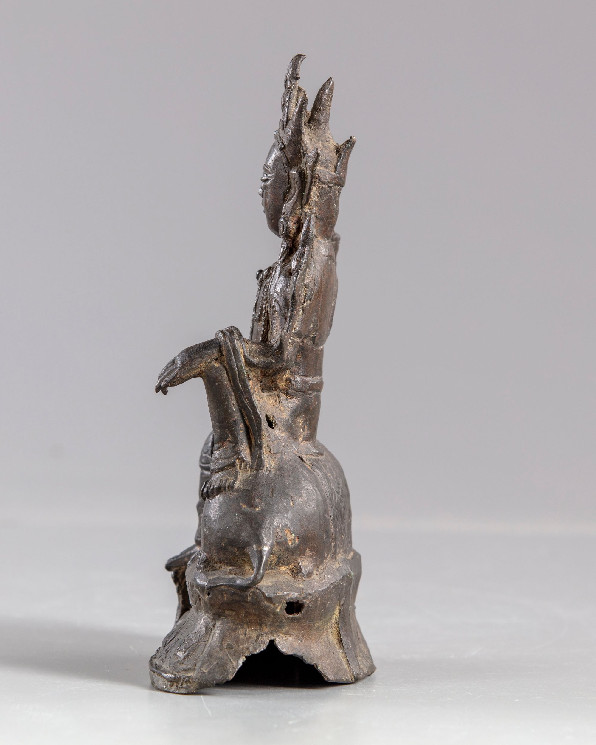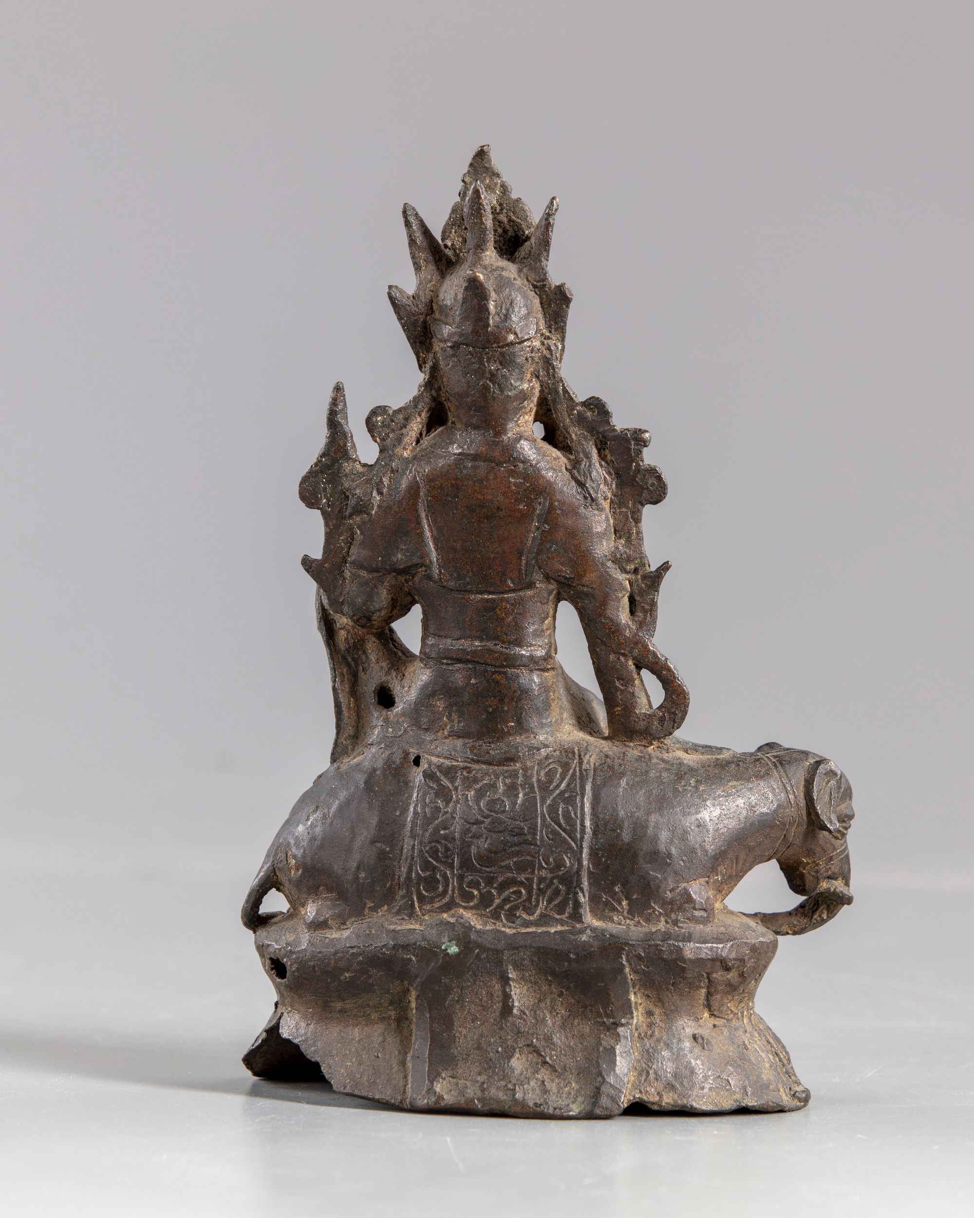 A Chinese bronze Guanyin figure, cast seated on an elephant with a double lotus stand, the figure is elegantly depicted seated in rajalilisana, wearing long flowing robes, a bejewelled necklace and an elaborate headdress. The face bears a serene expression with downcast eyes.