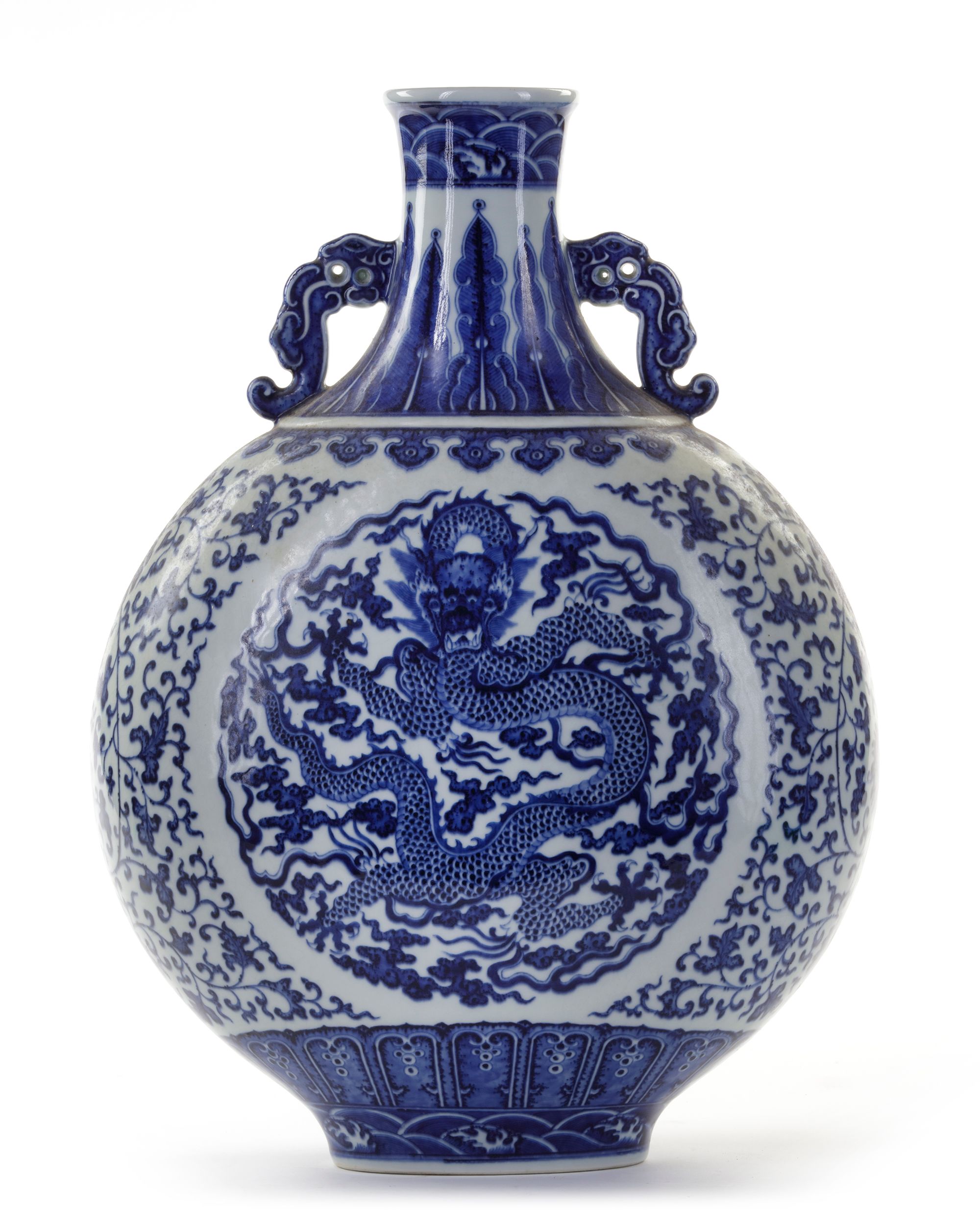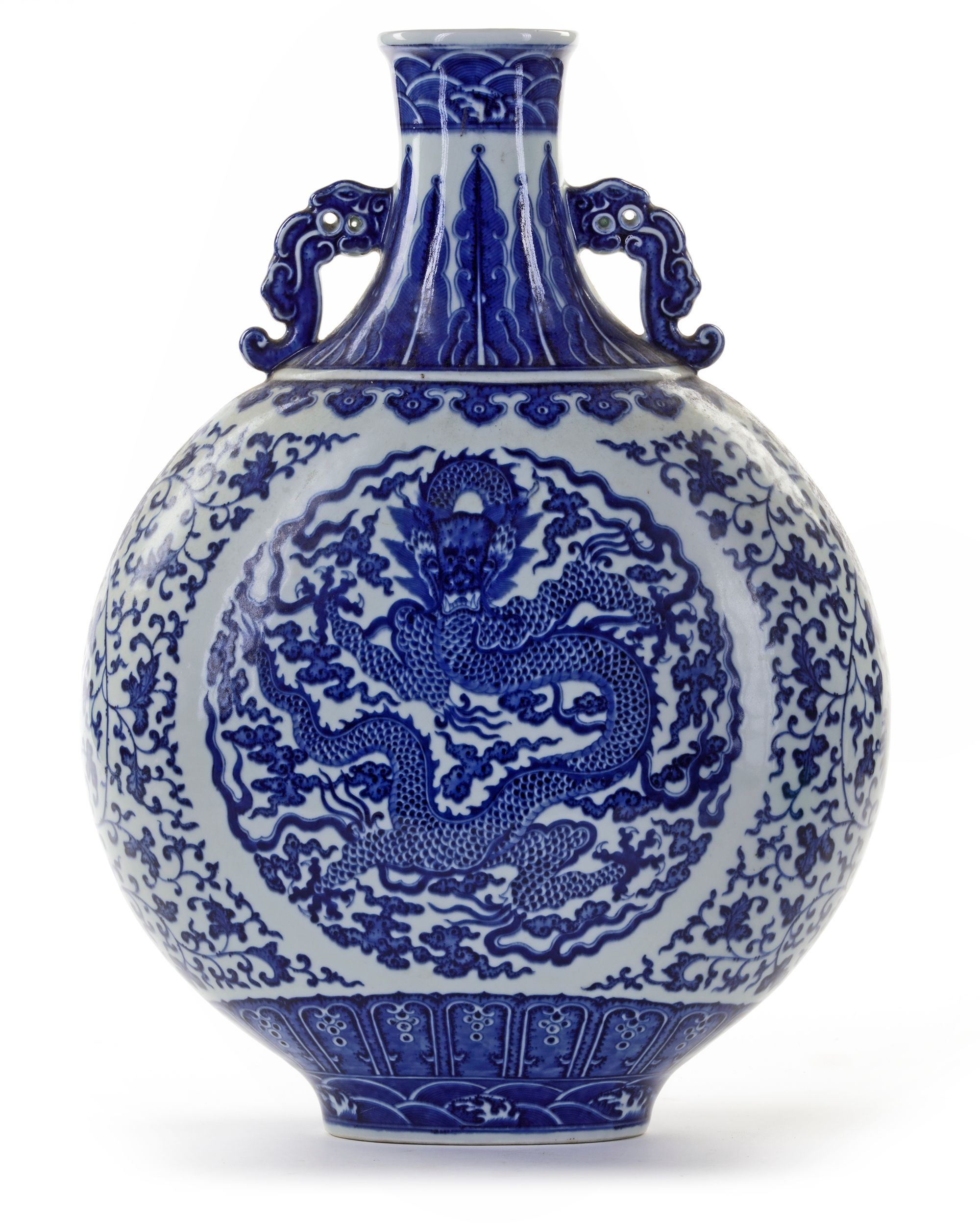 The moon flask is decorated with two moulded chilong dragon handles at the neck and decorated with upright plantain leaves.. Each of the sides is decorated with a front-facing five-clawed dragon chasing amongst cloud scrolls, all plantain leaves and sea waves to the base. The base with an apocryphal Qianlong seal mark. Height 48 cm.