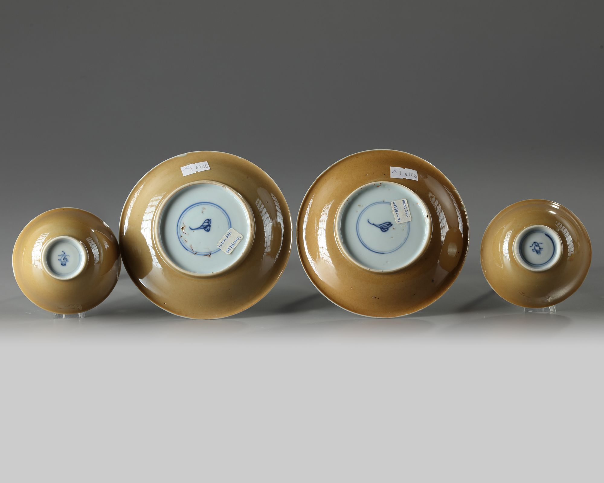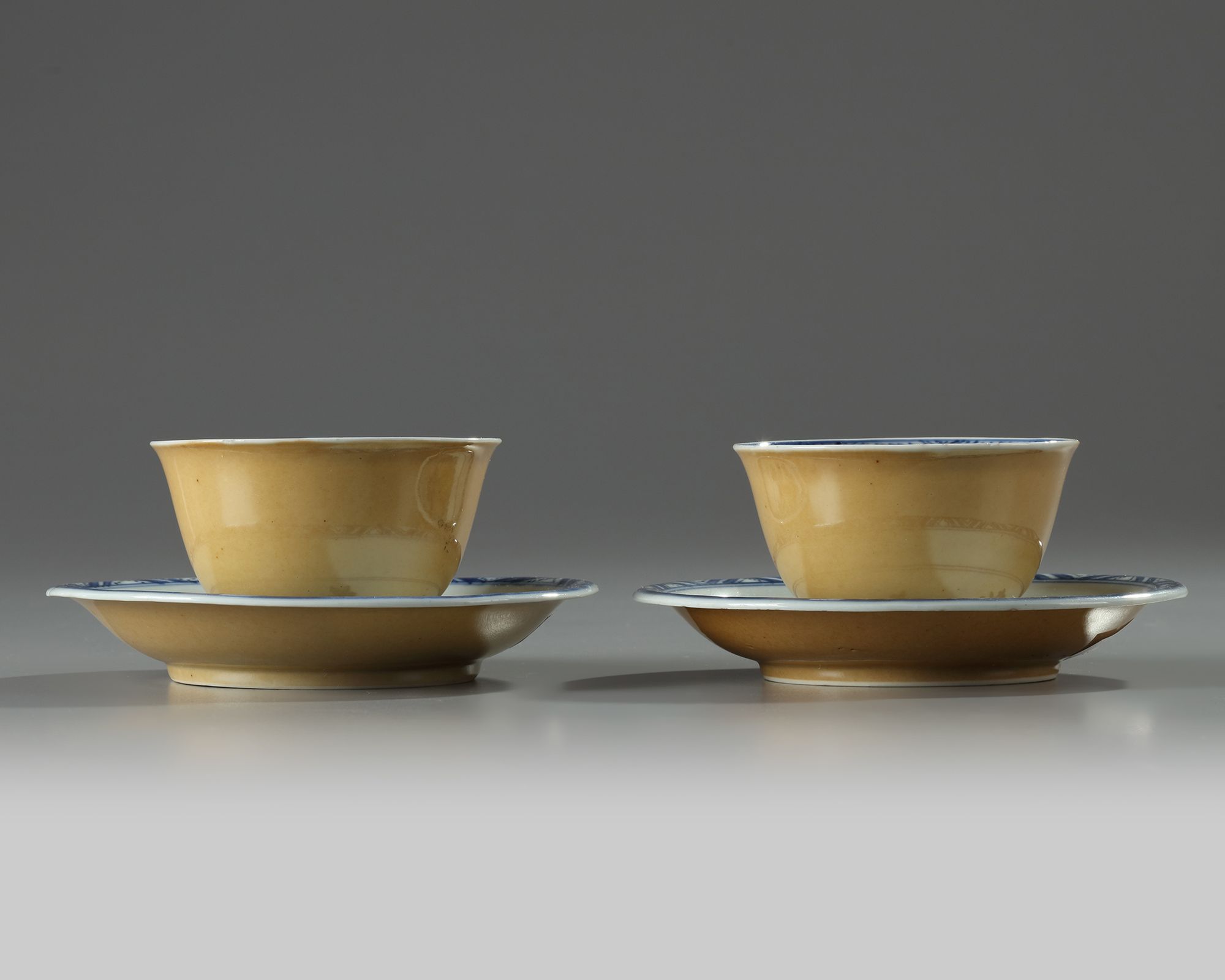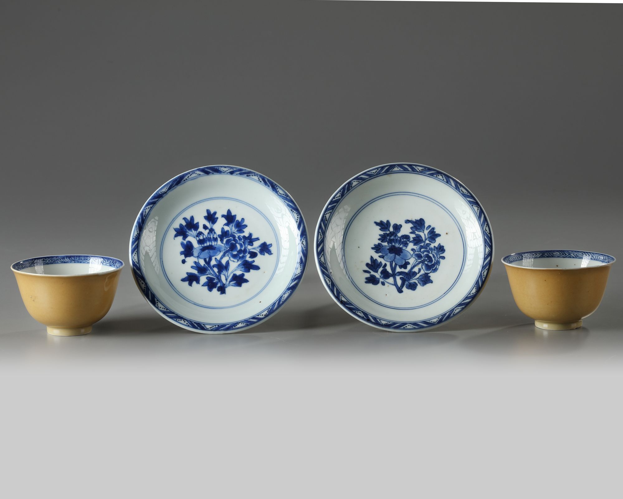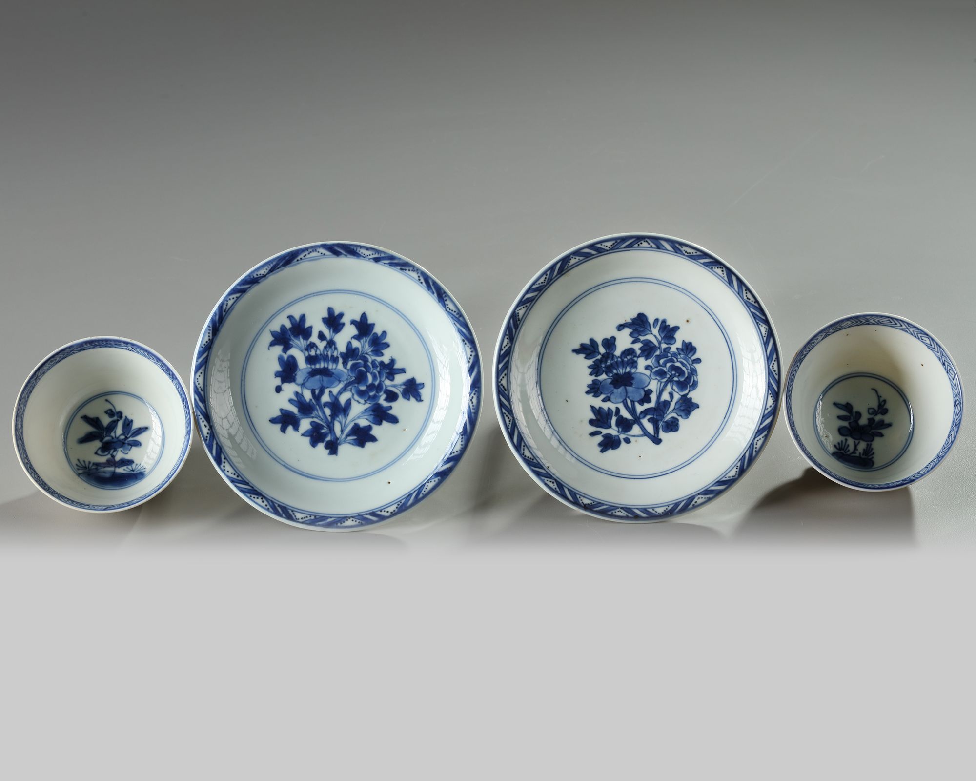 The saucers are decorated to the interior with a flower spray and the rims with a triangular border, the bases are marked with an artemisia leaf in underglaze blue within a double circle. The cups are decorated the interior with a flower growing from rocks, the rims with a diamond border, and the bases with a conch shell in underglaze blue within a double circle.