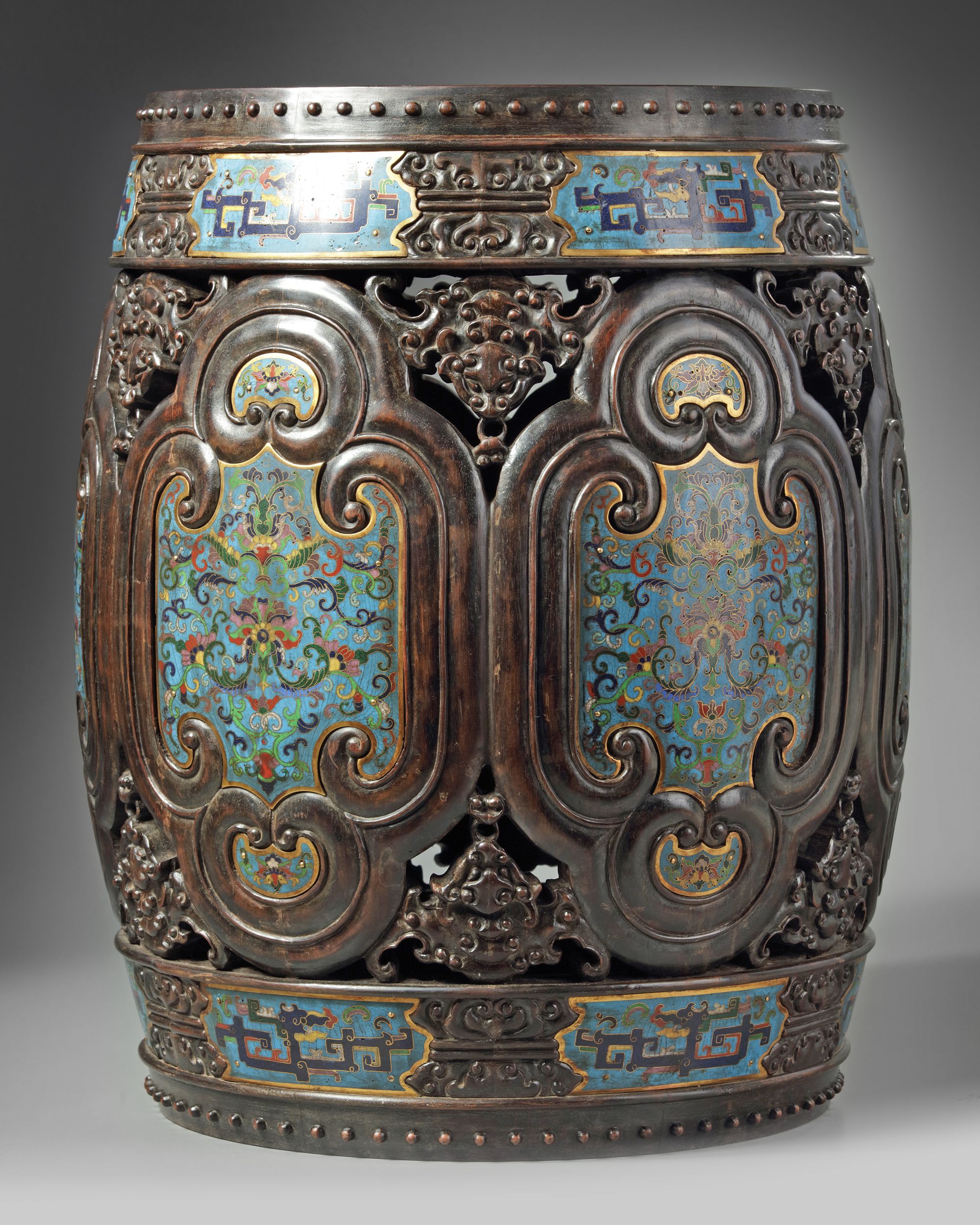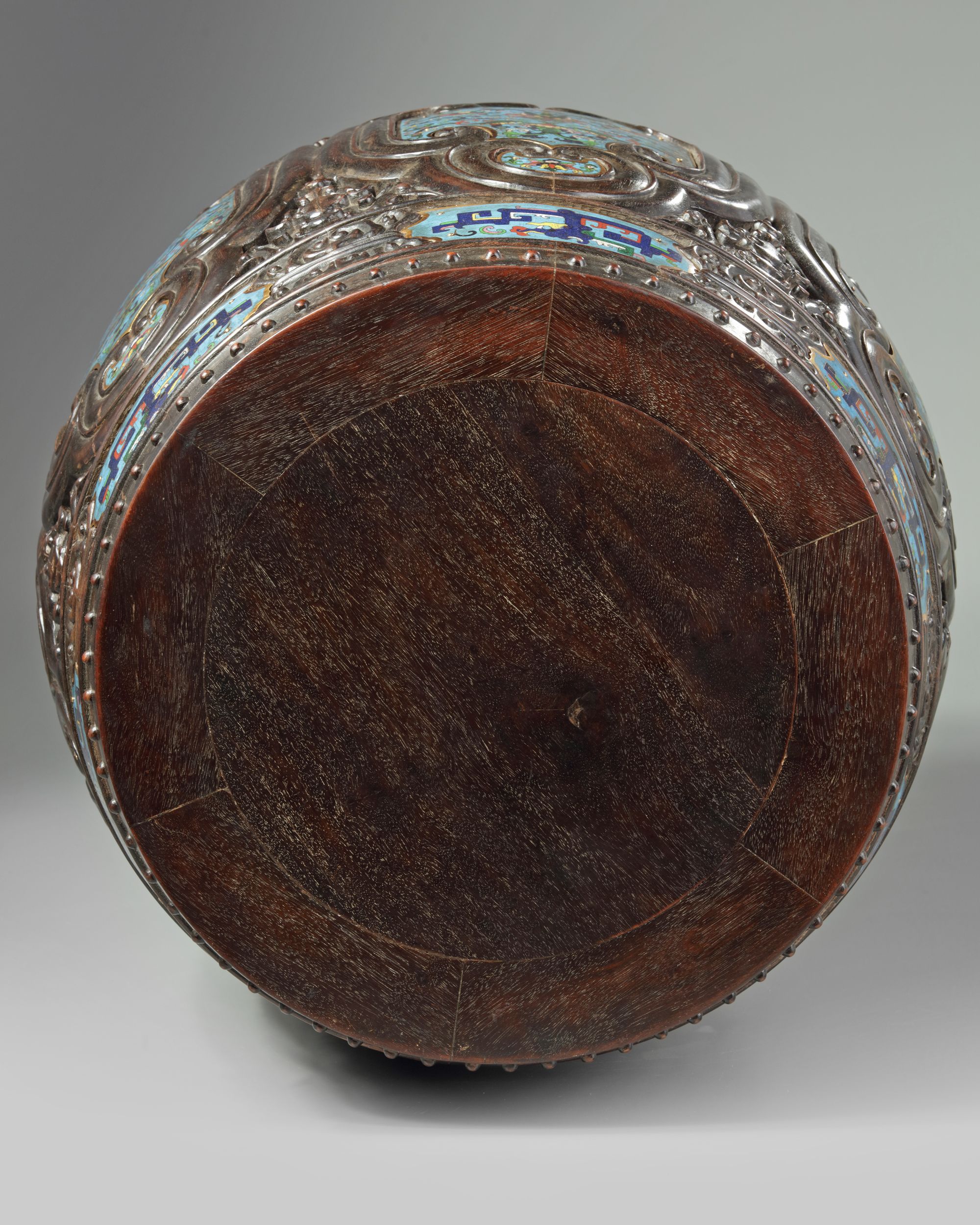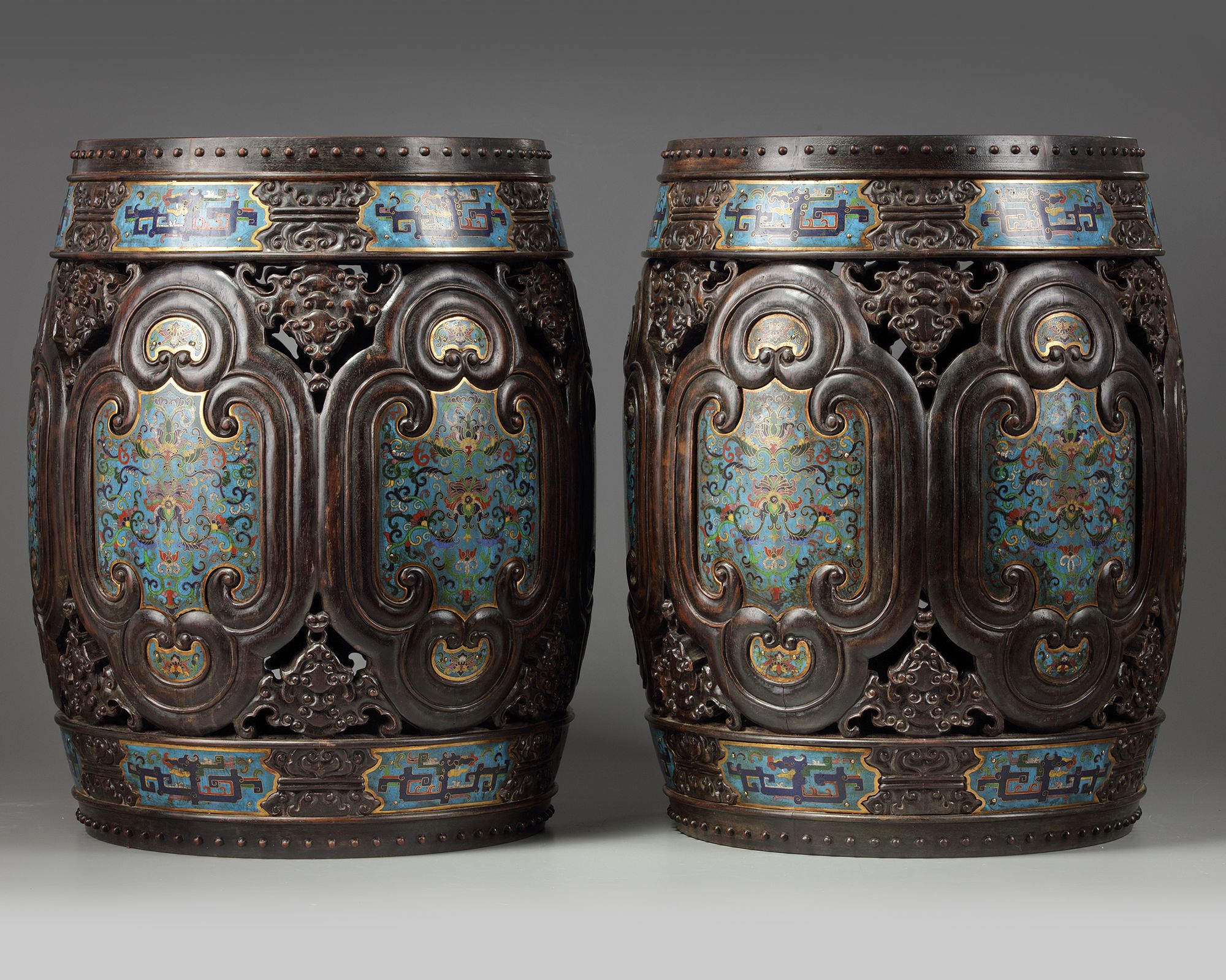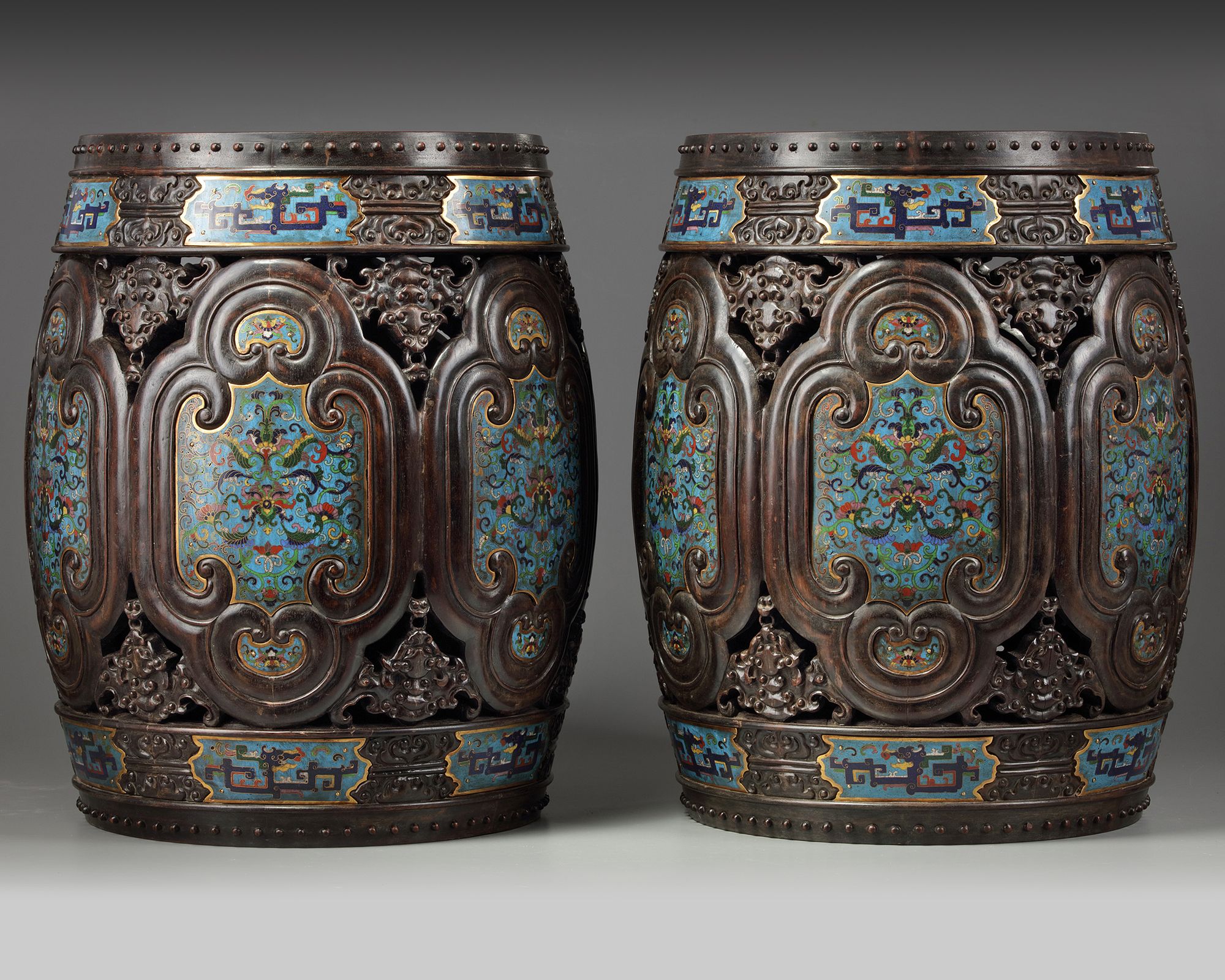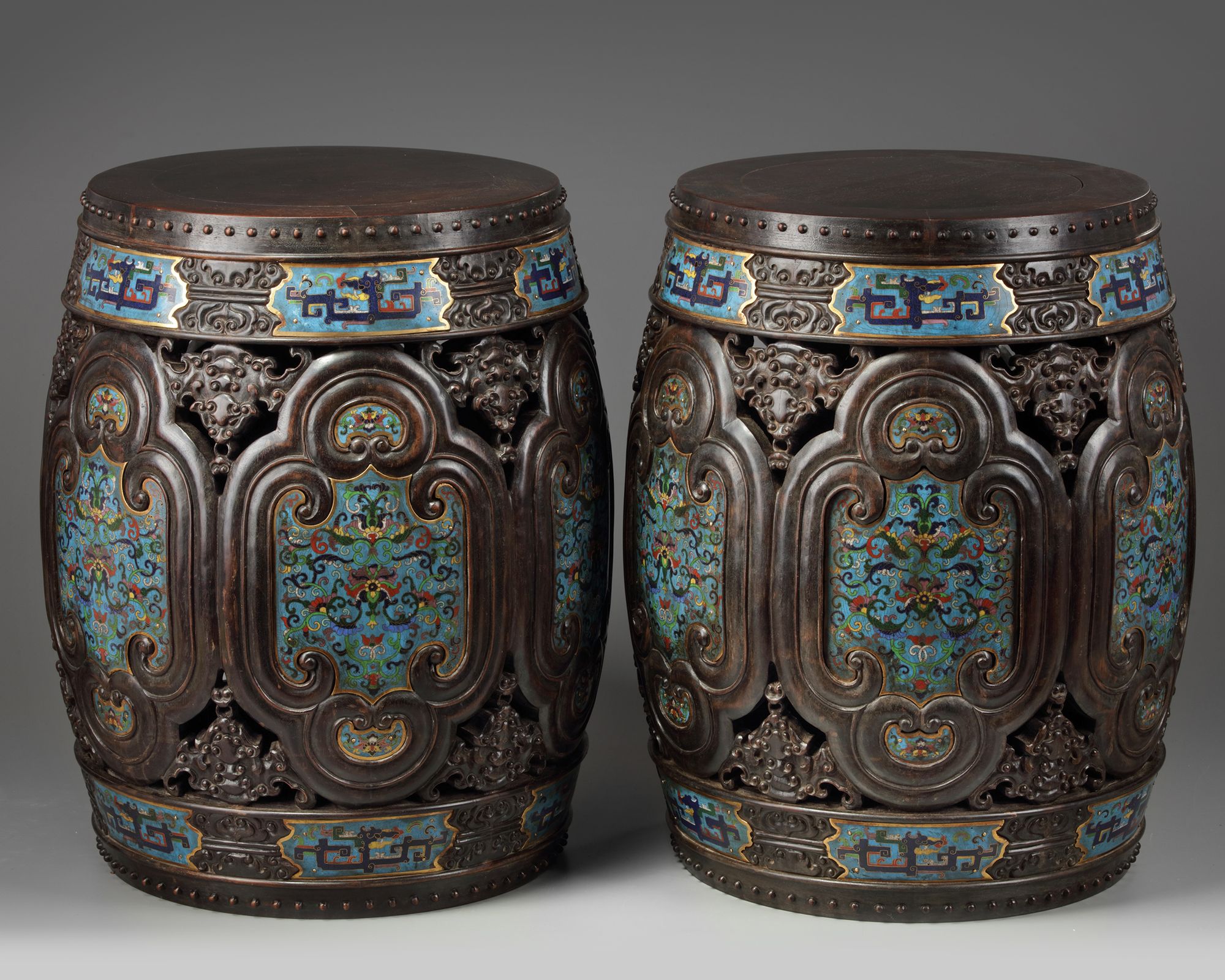 The seats are finely decorated with shaped cloisonné enamel panels to the body decorated with lotus scrolls. The upper and lower registers are inset with kui dragon panels. The panels in the middle registers are separated by carved confronting bats, the upper and lower registers decorated with two bands of nodes.